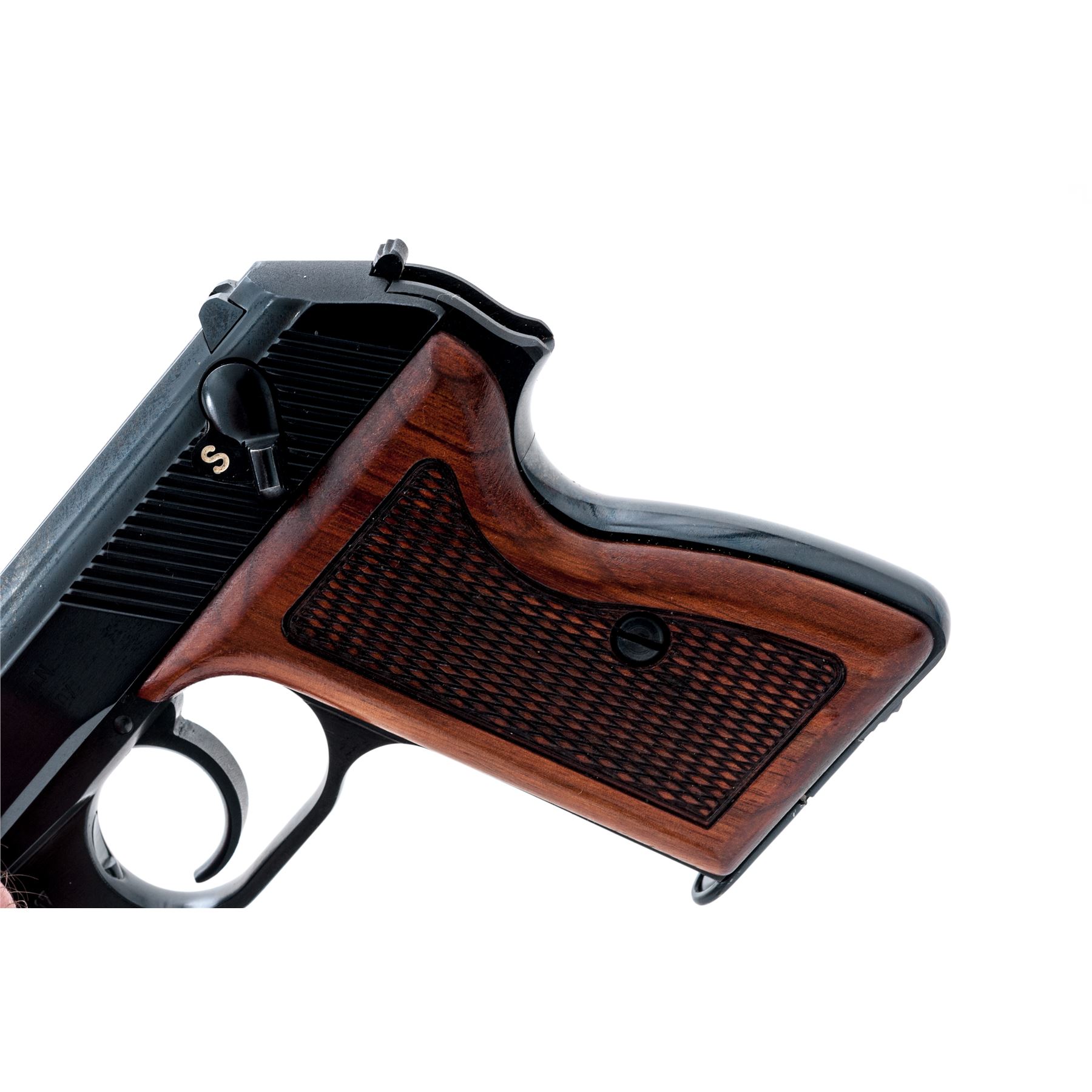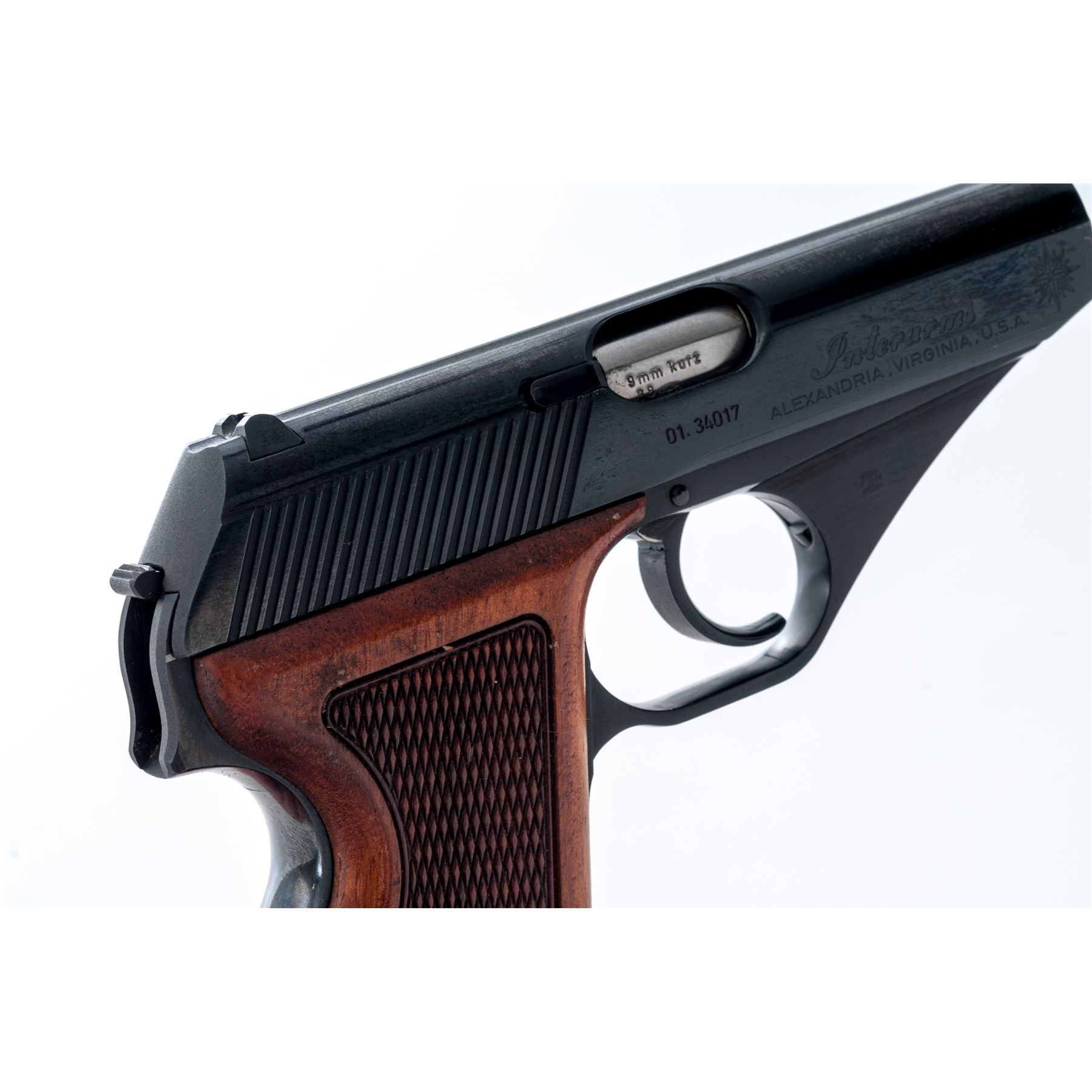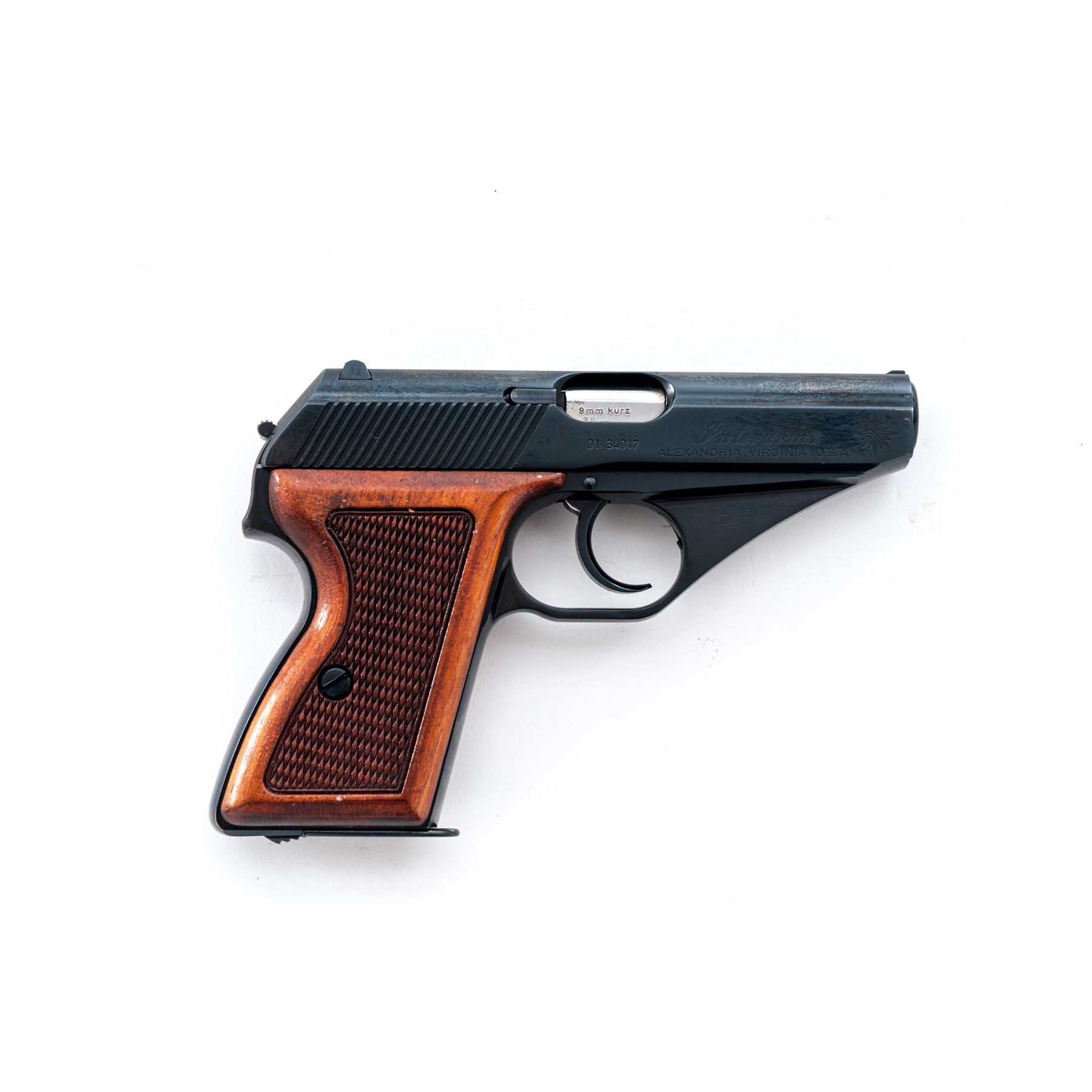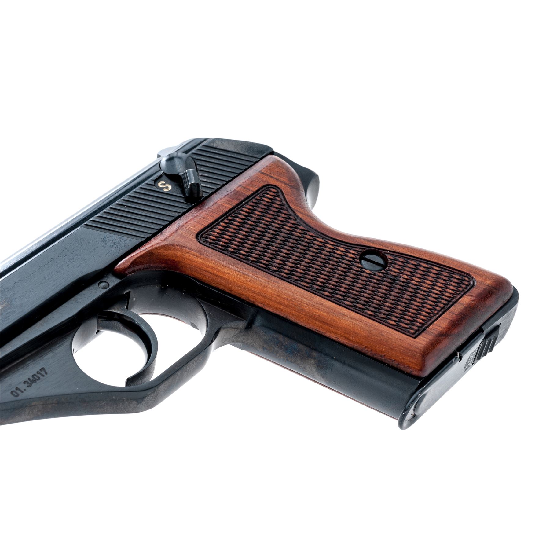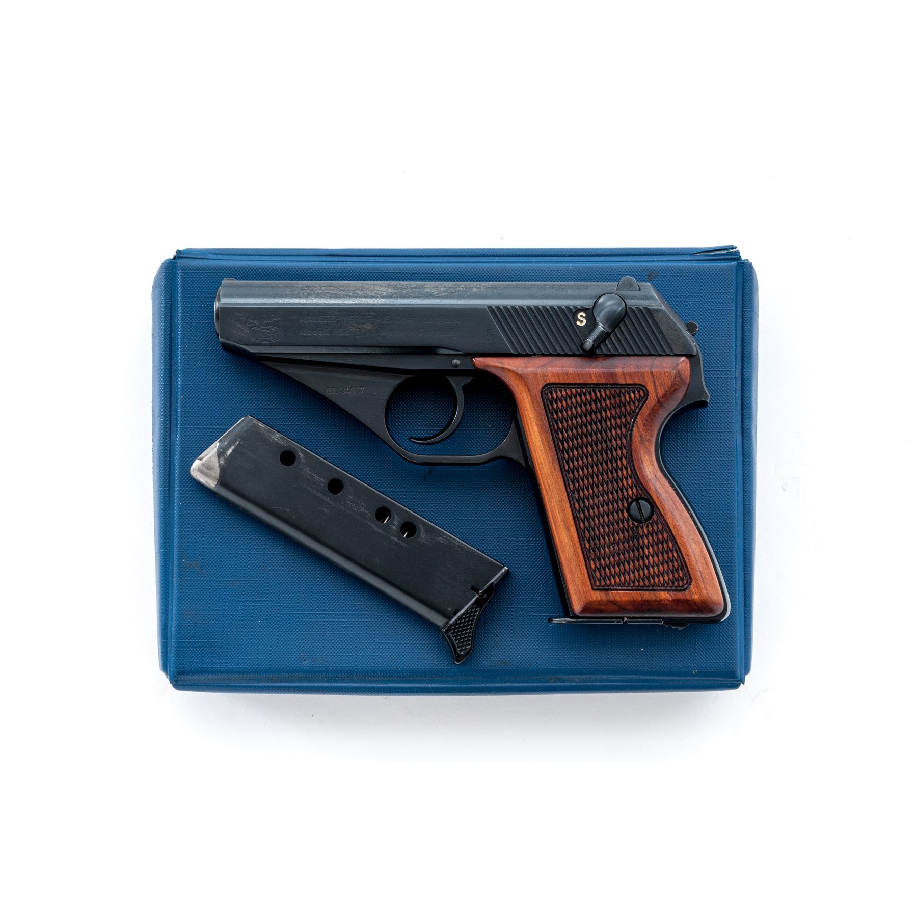 Post-War ''Original'' Mauser HSc Semi-Automatic Pistol, imported by Interarms, #01.34017, .380 ACP cal., 3.25'' barrel, blue finish, checkered wood grips, standard sights, and two (2) magazines; one marked Mauser and one unmarked magazine with black plastic finger extension. In blue vinyl covered box with fitted Styrofoam inserts, owner's manual, and test target. Made in Germany. Right side of slide is Interarms marked; right front portion of the triggerguard ''FBM''. Frame and slide with visible matching numbers. Overall condition is excellent with approx. 99%+ remaining finish. Backstrap with a few small pits and appears to have been refinished with a slightly darker and higher polish to the finish; balance of the finish is original. Factory lettering is clear. Grips with a few small marks from handling to the smooth borders; checkering is clean. Smooth and tight action, excellent bore. Est.: $300-$450. (Modern/PPT)