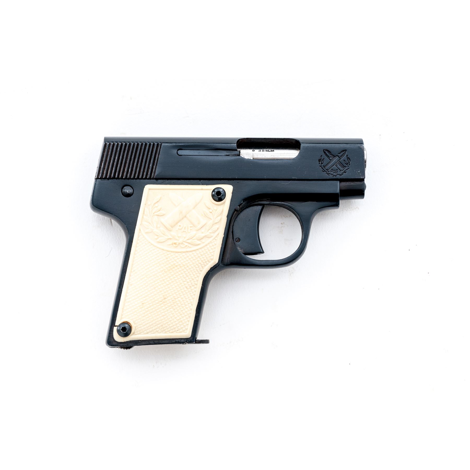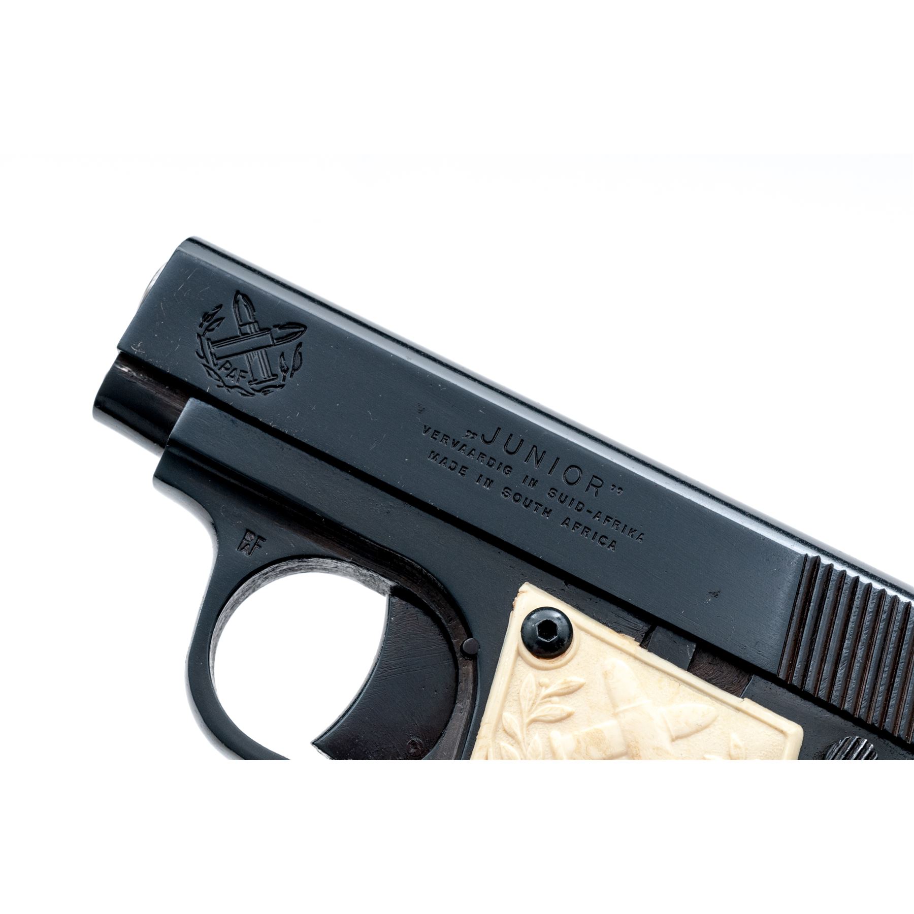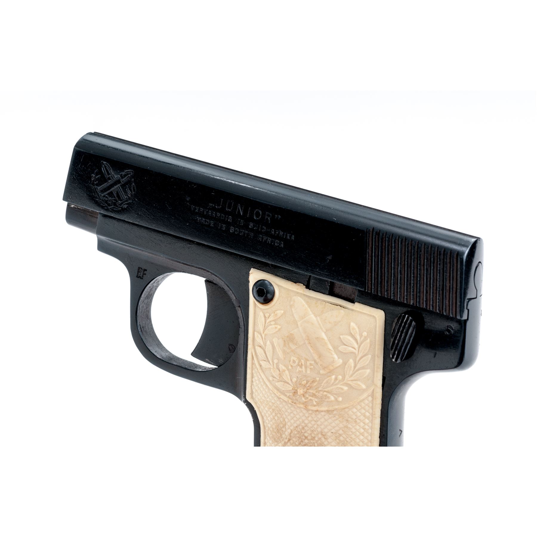 South African P.A.F. Junior Semi-Automatic Pistol, #A3966, .25 ACP cal., 2-1/8'' barrel, blue finish. Original checkered white plastic grips each with ''PAF'' logo on the upper half; grips screws are hex head replacements. Standard integral U-shaped sight groove, with one blued steel magazine. The ''PAF'' logo is also on both the front right and left side of the slide; left side of slide also reads ''JUNIOR/VERVAARDIG IN SUID-AFRIKA/MADE IN SOUTH AFRICA''; left side triggerguard ''PAF''. In two-piece plain cardboard box with firearms information handwritten on the edge. Condition overall is very good+. Approx. 97% blue finish remains with brownish toning in protected areas. Slide with general slight handling marks. Grips show a few spots of normal mild discoloration from age and overall show very little handling wear. As is common with the grips on these pistols, the left grip has a thin crack below the upper border; right grip with a small hairline crack at the lower screw. Fine action and bore. Box shows age and wear with splits at a few of the corners. Approx. 10,000 of these pistols were produced circa 1954-1957. Seldom seen with white grips. Est.: $250-$400. (C&R/PPT)