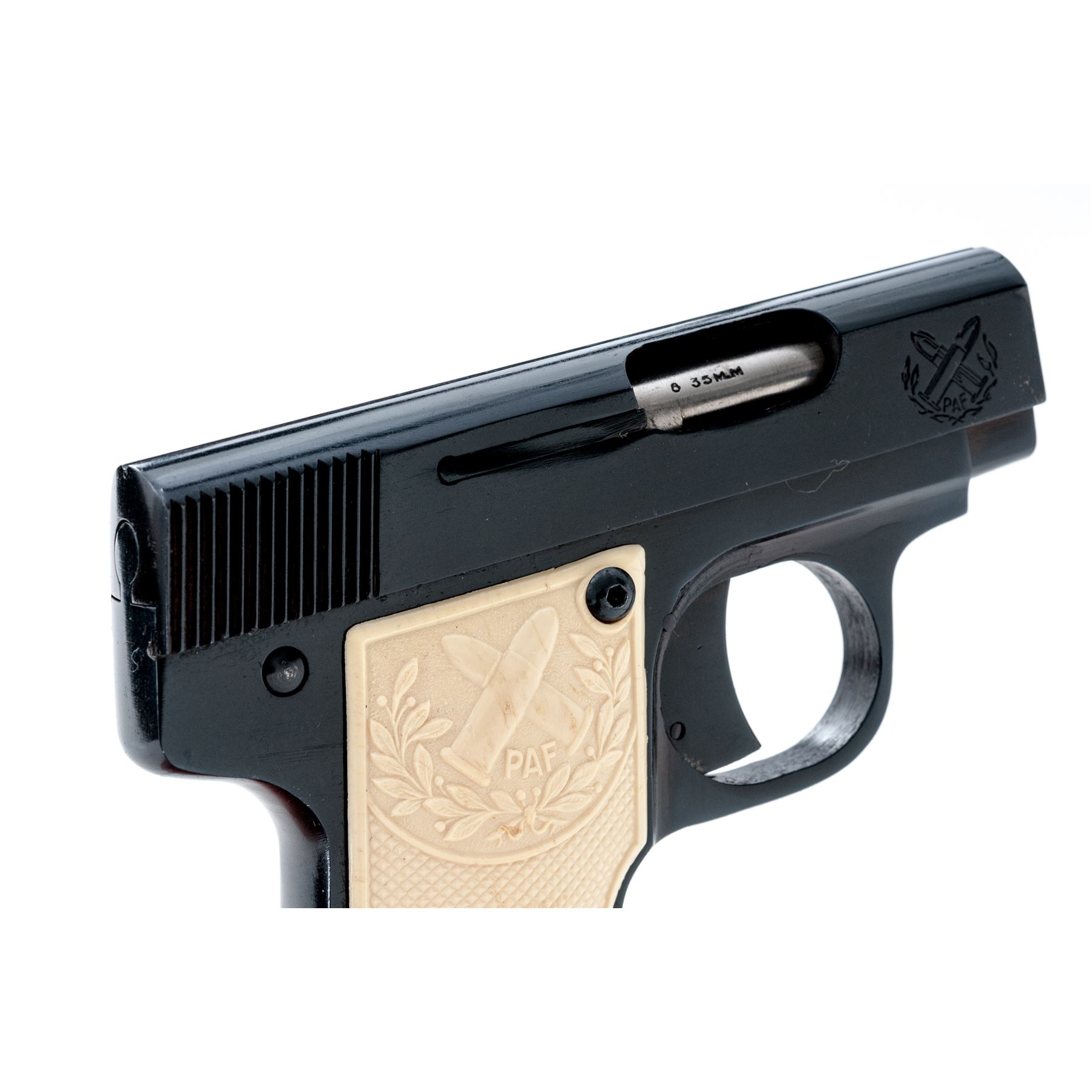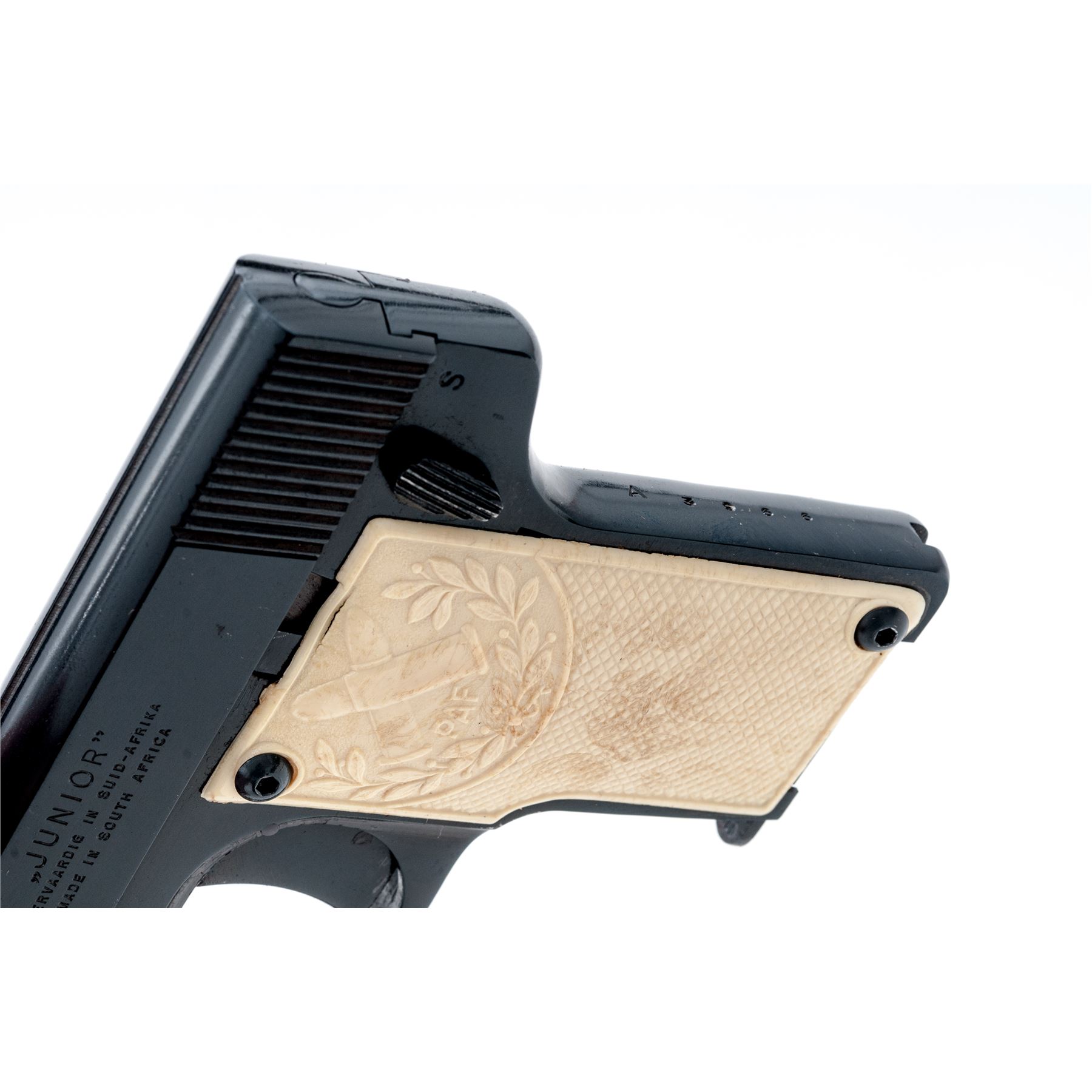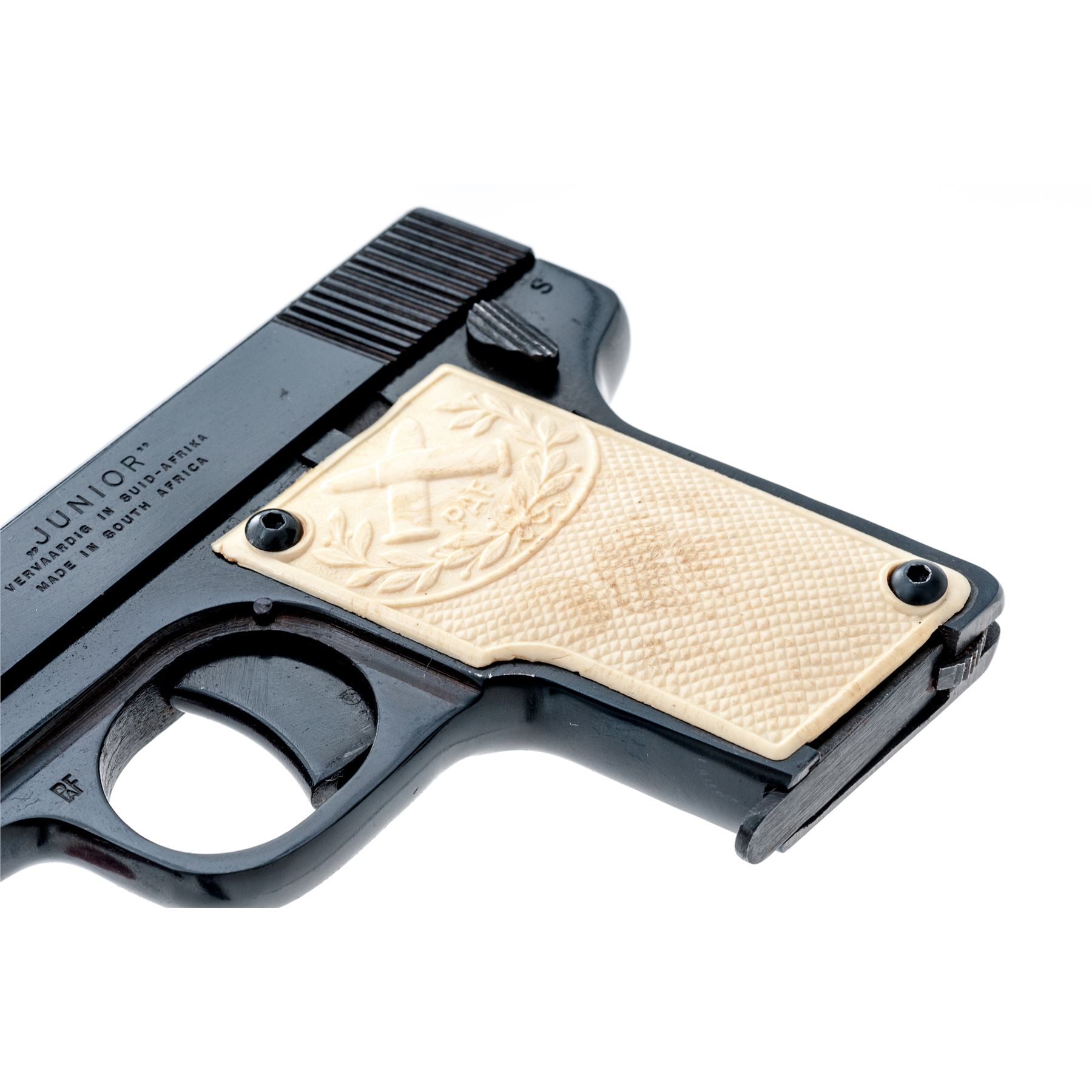 South African P.A.F. Junior Semi-Automatic Pistol, #A3966, .25 ACP cal., 2-1/8'' barrel, blue finish. Original checkered white plastic grips each with ''PAF'' logo on the upper half; grips screws are hex head replacements. Standard integral U-shaped sight groove, with one blued steel magazine. The ''PAF'' logo is also on both the front right and left side of the slide; left side of slide also reads ''JUNIOR/VERVAARDIG IN SUID-AFRIKA/MADE IN SOUTH AFRICA''; left side triggerguard ''PAF''. In two-piece plain cardboard box with firearms information handwritten on the edge. Condition overall is very good+. Approx. 97% blue finish remains with brownish toning in protected areas. Slide with general slight handling marks. Grips show a few spots of normal mild discoloration from age and overall show very little handling wear. As is common with the grips on these pistols, the left grip has a thin crack below the upper border; right grip with a small hairline crack at the lower screw. Fine action and bore. Box shows age and wear with splits at a few of the corners. Approx. 10,000 of these pistols were produced circa 1954-1957. Seldom seen with white grips. Est.: $250-$400. (C&R/PPT)