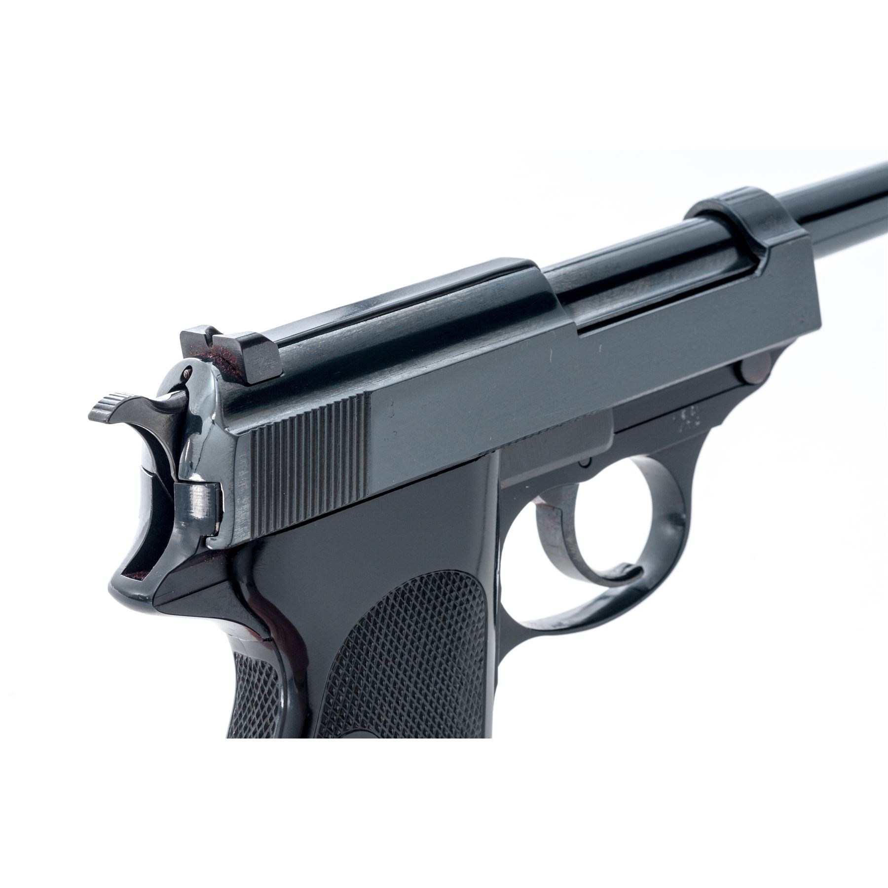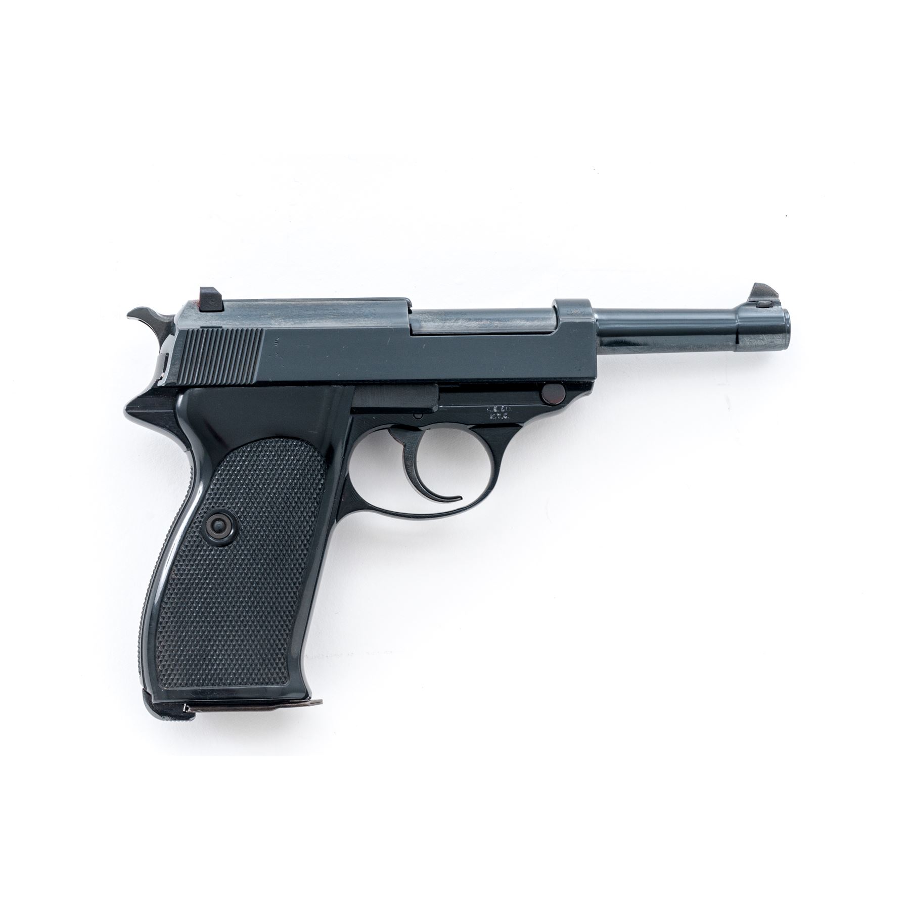 West German Police marked French Manurhin P1 Semi-Automatic Pistol, #237787, 9mm cal., 5'' barrel, high polish blue finish, black alloy frame, checkered black plastic grips, standard sights, with one blued steel ''P1'' marked magazine. Barrel, frame, and slide with matching numbers. Left side of triggerguard with West German Police acceptance stamp; right side of frame is import marked. Left side of slide with standard Manurhin maker's marks; right side with remnants of what look like various proofmarks and the upper portion of a spurious Nazi type proof. Condition overall is very good+ as partially refinished. Barrel and slide with approx. 98%+ added high polish blue finish. New finish was applied over a few small surface dents and scratches. French maker's marks are clear, proofmarks on right side are partially buffed out. Frame retains 98%+ black finish. Grips with a few small handling marks to the smooth borders, checkering is sharp. Action is smooth; mirror bright, clean bore. Est.: $250-$450. (C&R/PPT)