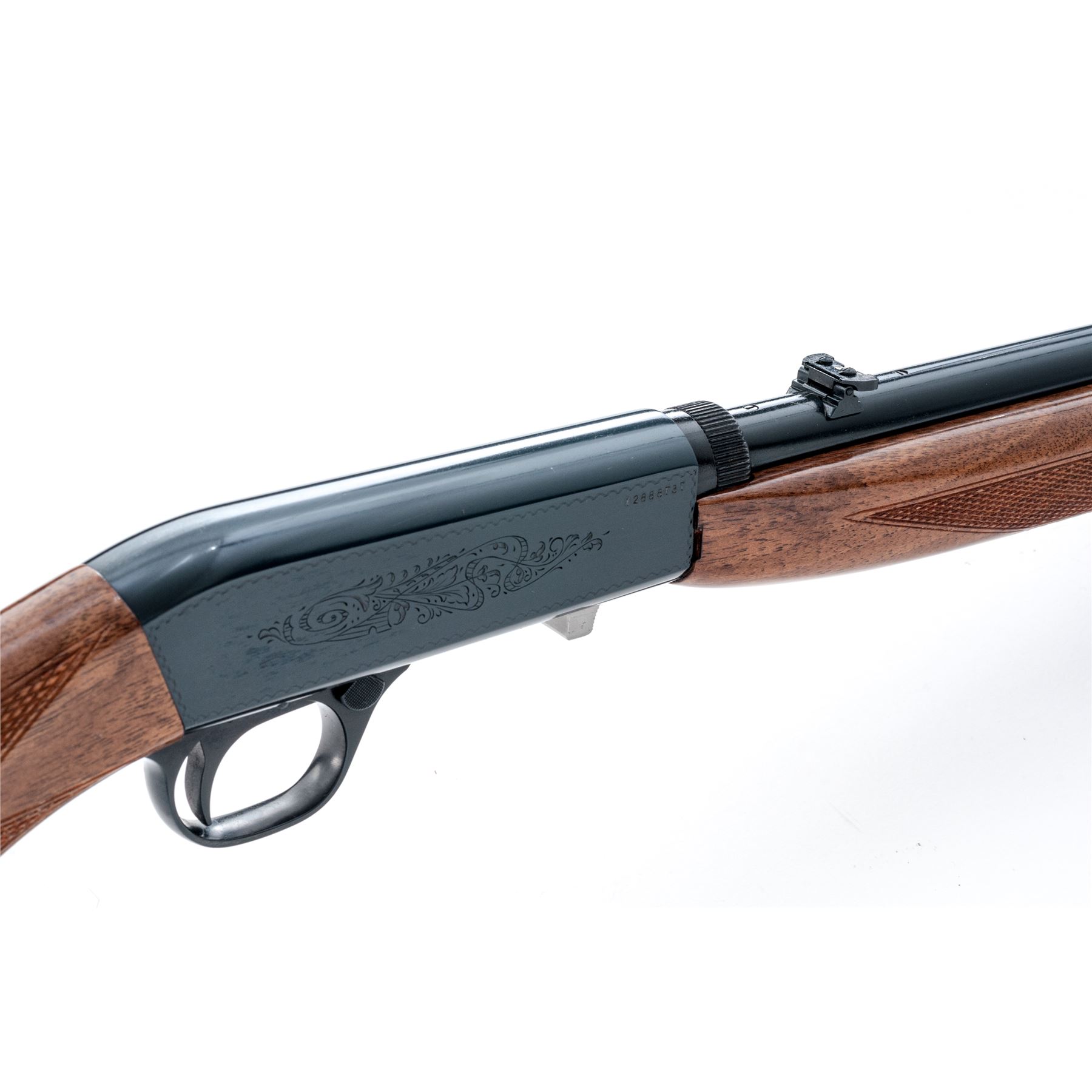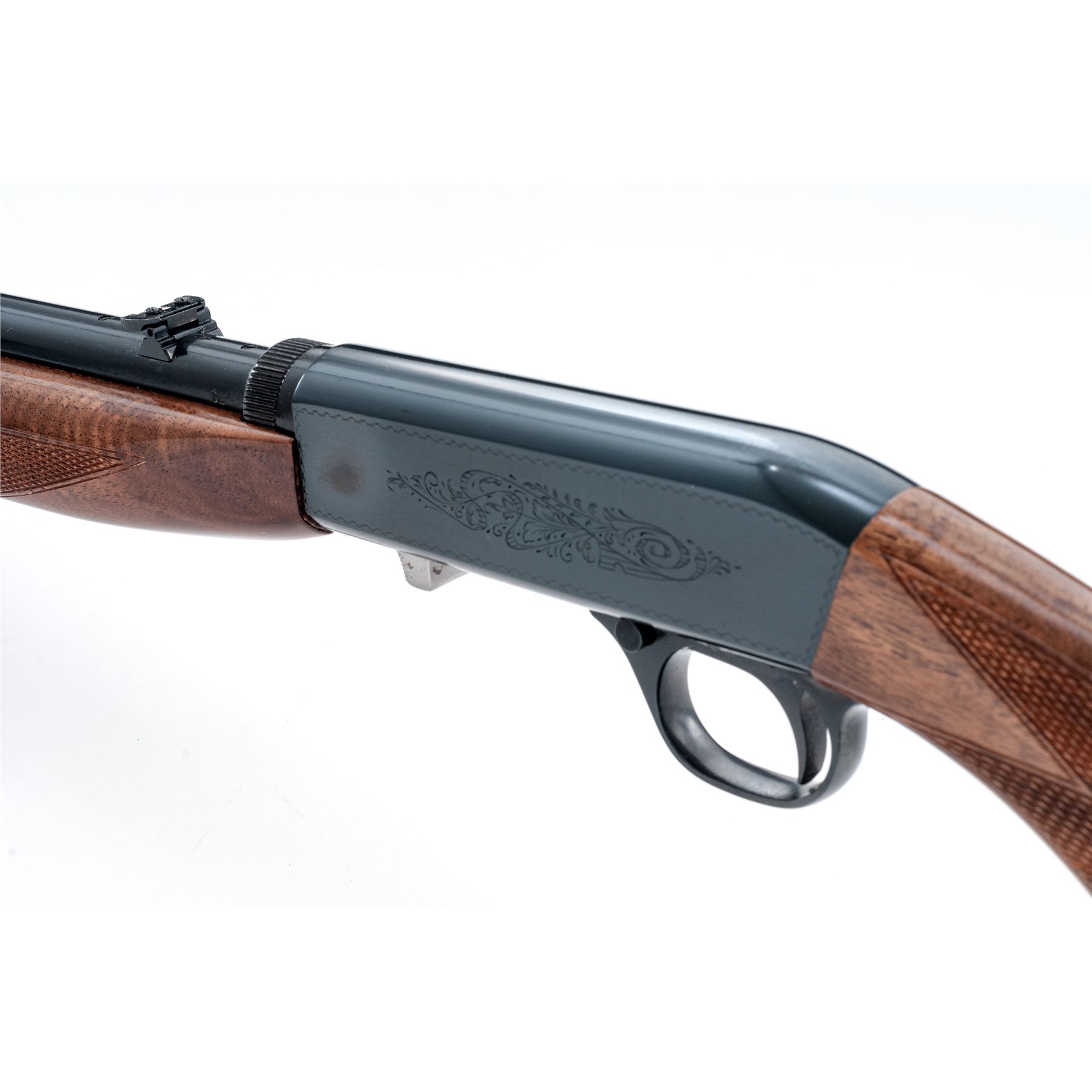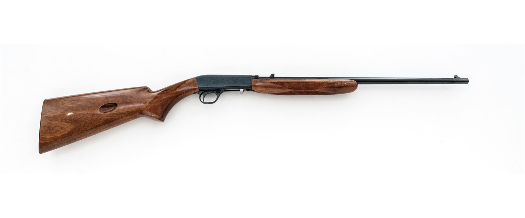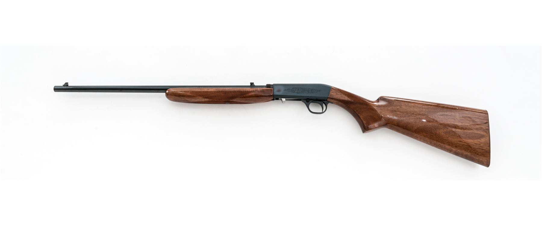 Belgian Browning Grade I Semi-Automatic Rifle, #12888T37, .22 LR cal., 19.25'' barrel, blue finish, receiver with standard Grade I engraving, checkered pistol-grip walnut stock and forend with gloss finish, grooved steel buttplate, brass beaded blade front sight and folding U-notched rear sight. Left side of barrel is marked ''BROWNING ARMS COMPANY MORGAN, UTAH & MONTREAL P.Q./MADE IN BELGIUM''; right side ''CALIBER .22 LONG RIFLE/BROWNING PATENTS''. Barrel and bottom of bolt with ''(crown)/PV'' proofmarks. Mfg'd 1973. Approx. 98% original blue finish remains and metal surfaces rate as fine overall. Bottom of barrel shows slight muzzle wear; left side of receiver with a dime-sized spot of very light oxidation (it looks like a fingerprint that may have not been wiped clean). Engraving and factory lettering is clean and clear. Buttstock with six quarter-inch long narrow impressions to the bottom edge and is otherwise excellent, with only a few very minor handling marks at the wrist and forend; checkering is clean and sharp. Action is smooth and functions properly. Bore is bright with excellent rifling. Est.: $500-$700. (Modern)