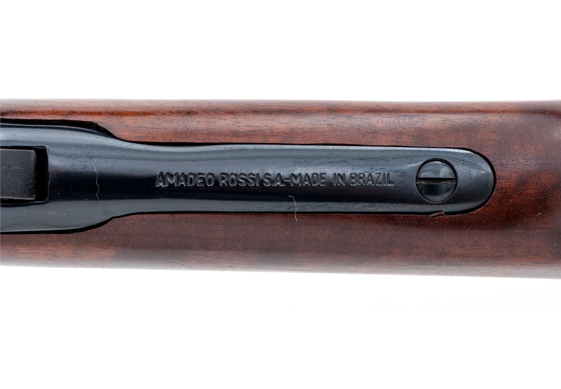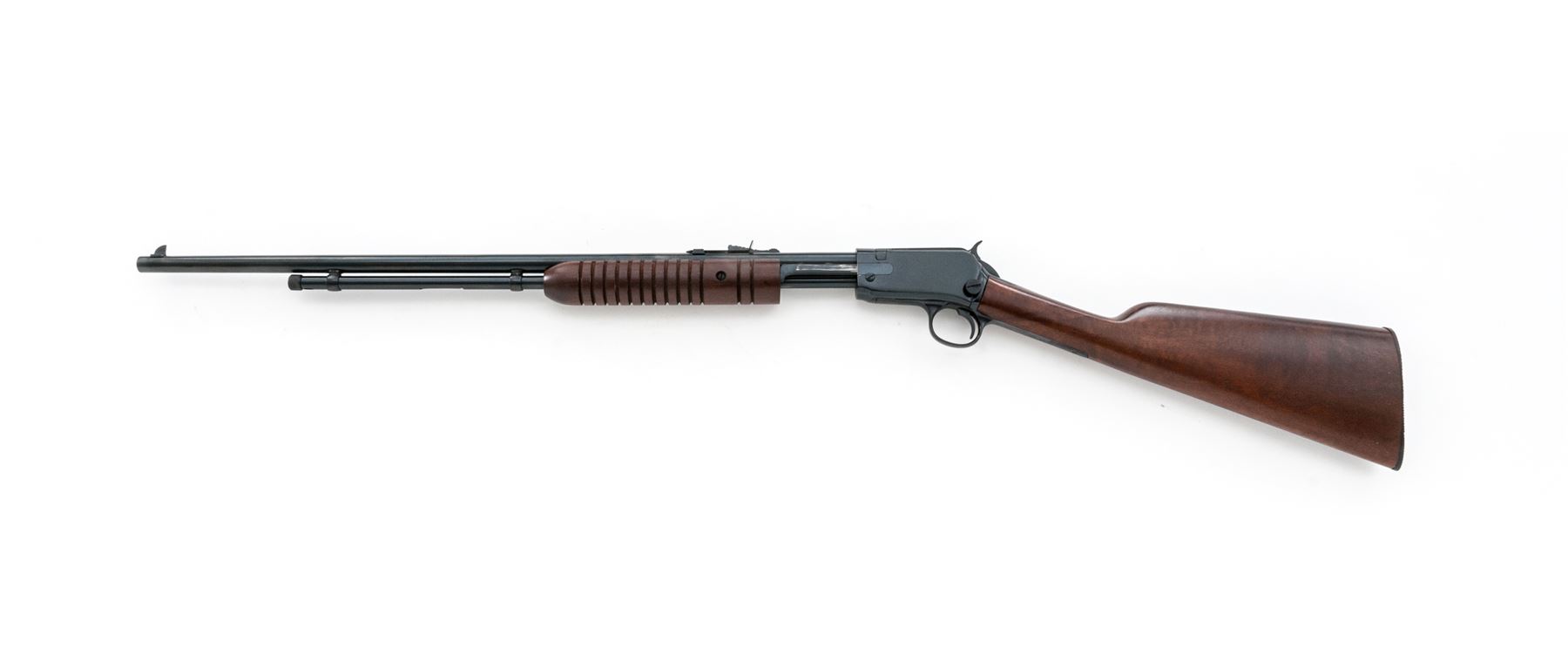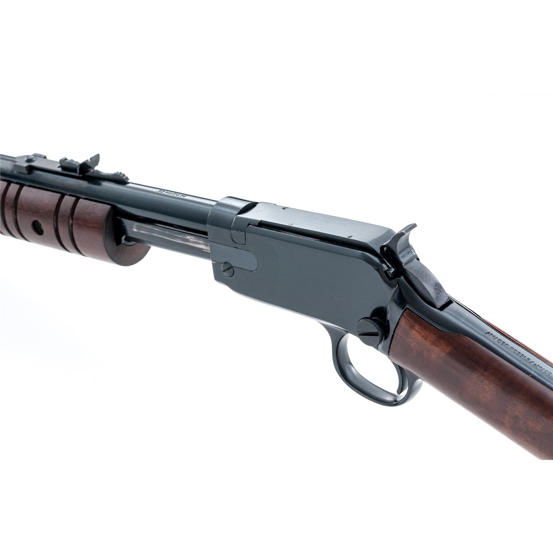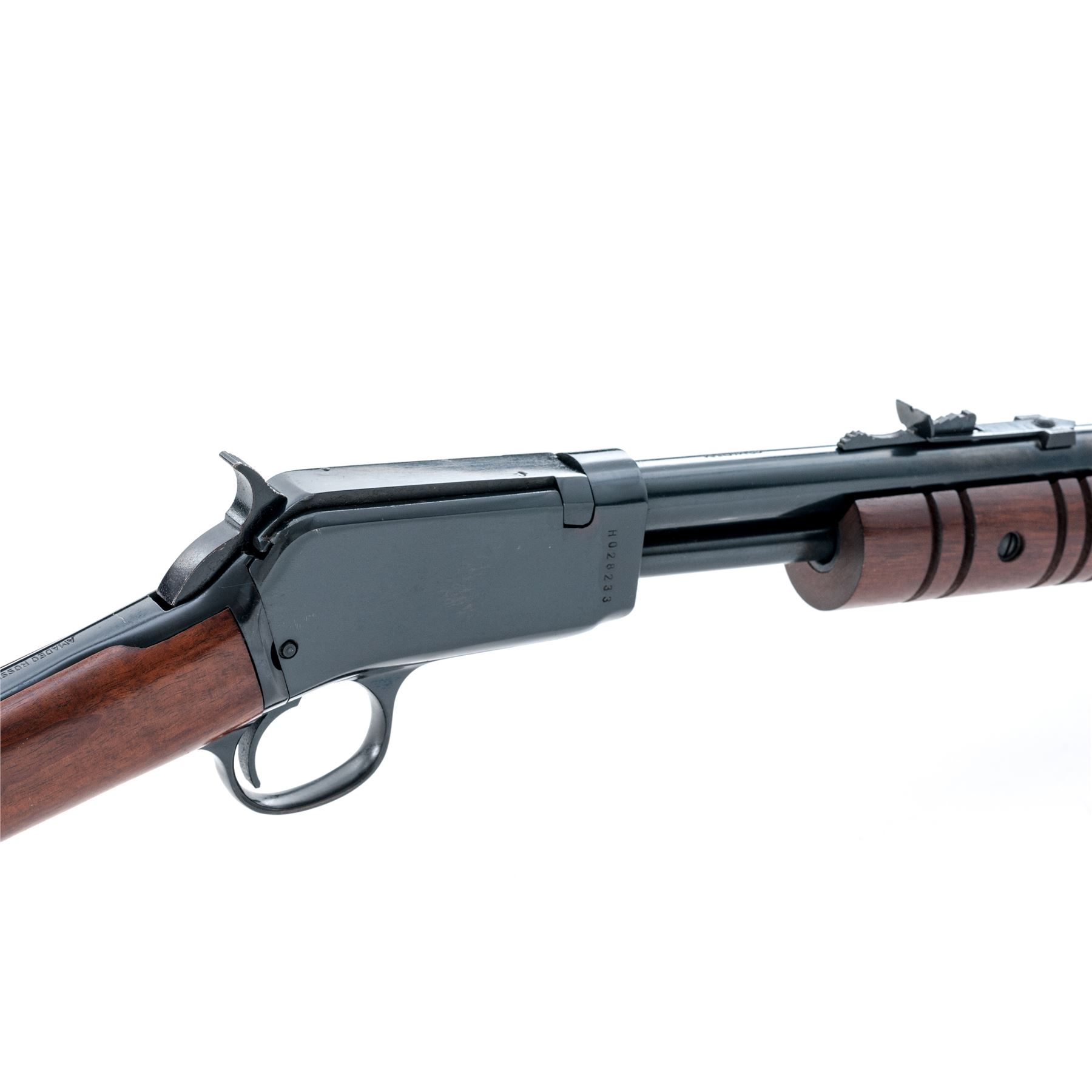 Rossi Model 59 Pump Action Rifle, #H028233, .22 WMR cal., 23'' round barrel, blue finish, straight grip hardwood stock and grooved forend, factory black plastic Rossi buttplate, dovetailed blade front sight and standard notched rear sight with elevator. Imported by Interarms. Rifle is in excellent overall condition, retaining approx. 97% original blue finish. Triggerguard with a spot of very minor pitting. Wood with a small amount of normal light handling marks, most noticeable near the toe of buttstock. Action is crisp and operates smoothly. Bore is bright with excellent rifling. Est.: $250-$400. (Modern)