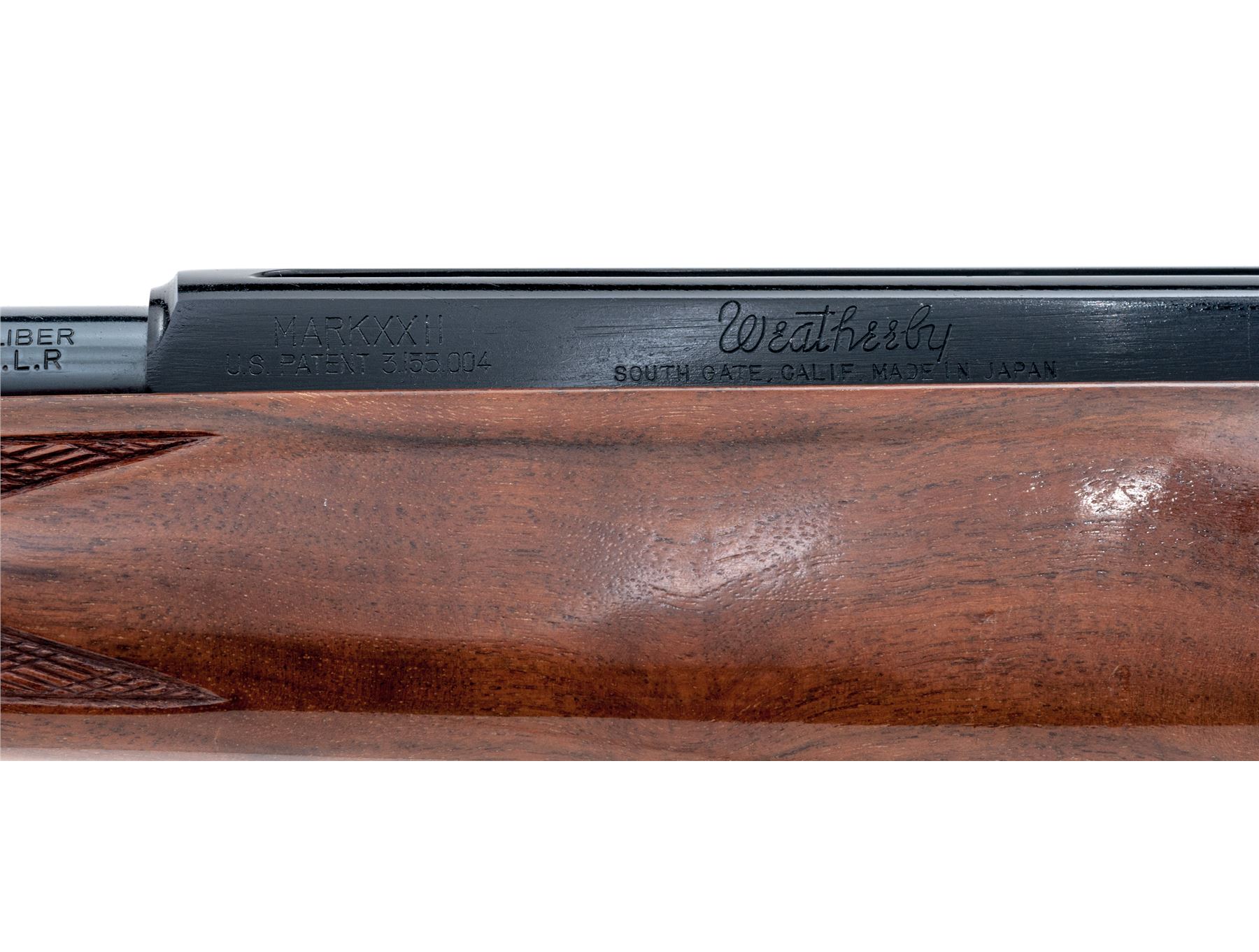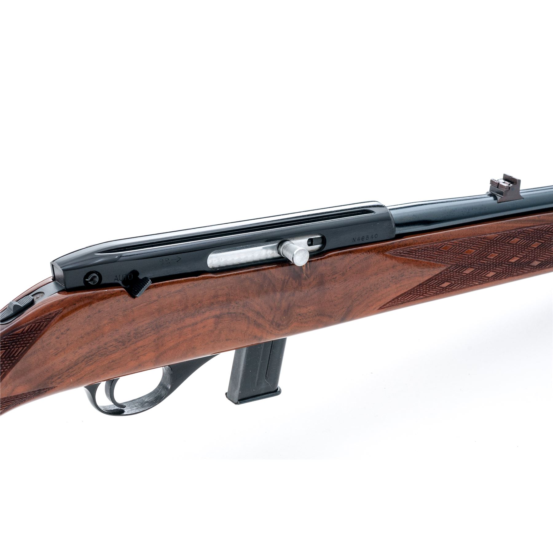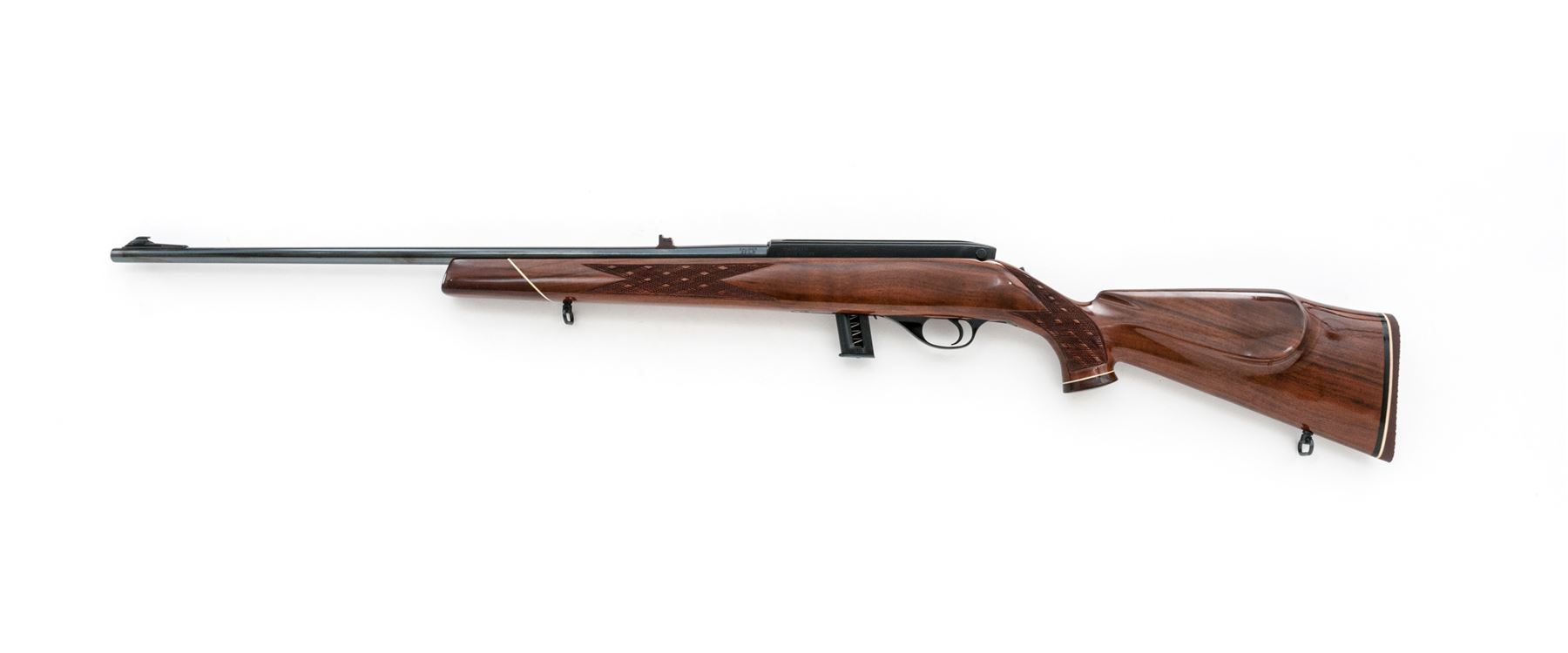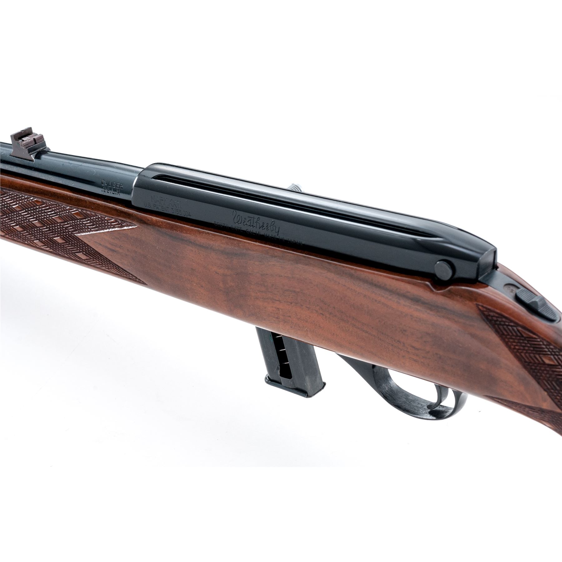 Weatherby MK XXII Magazine-Fed Semi-Automatic Rifle, #N46340, .22 LR cal., 24'' barrel with blue finish, and black factory grooved alloy receiver. One-piece walnut pistol-grip stock with Monte Carlo comb is skipline checkered at the wrist and forend, with a rosewood forend and grip cap, gloss finish, factory brown rubber basketweave pattern Weatherby recoil pad, sling swivels, with a brass beaded blade front sight; U-notched rear sight with one fixed and two folding leaves. Included is one magazine. Made in Japan. Rifle is in excellent overall condition and retains approx. 99% original blue finish. Top of receiver with a few small surface scratches. Stock with only a few minor handling marks; predominantly on the forend and left side above the triggerguard, as well as a small impression to the edge of the rosewood grip cap; checkering is sharp. Action is smooth and functions properly. Bore is bright with excellent rifling. Est.: $500-$750. (Modern)