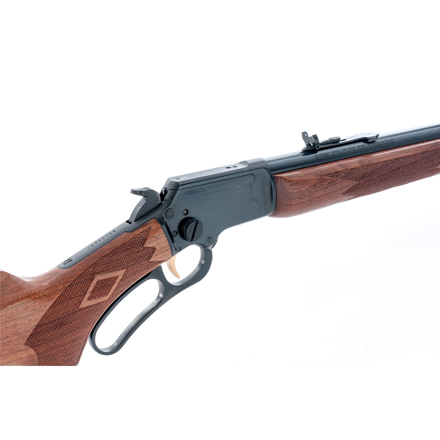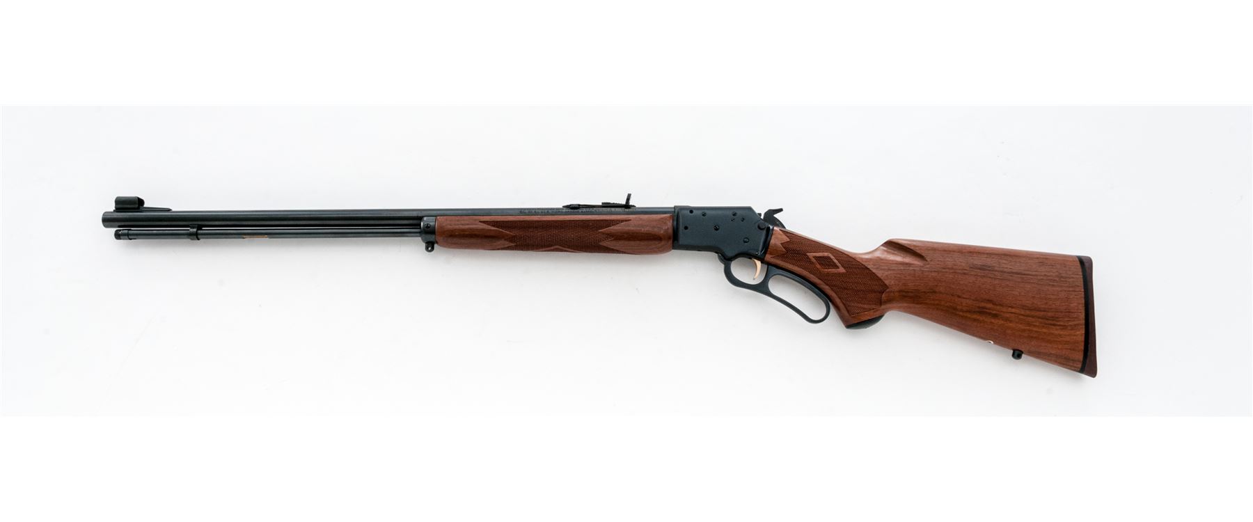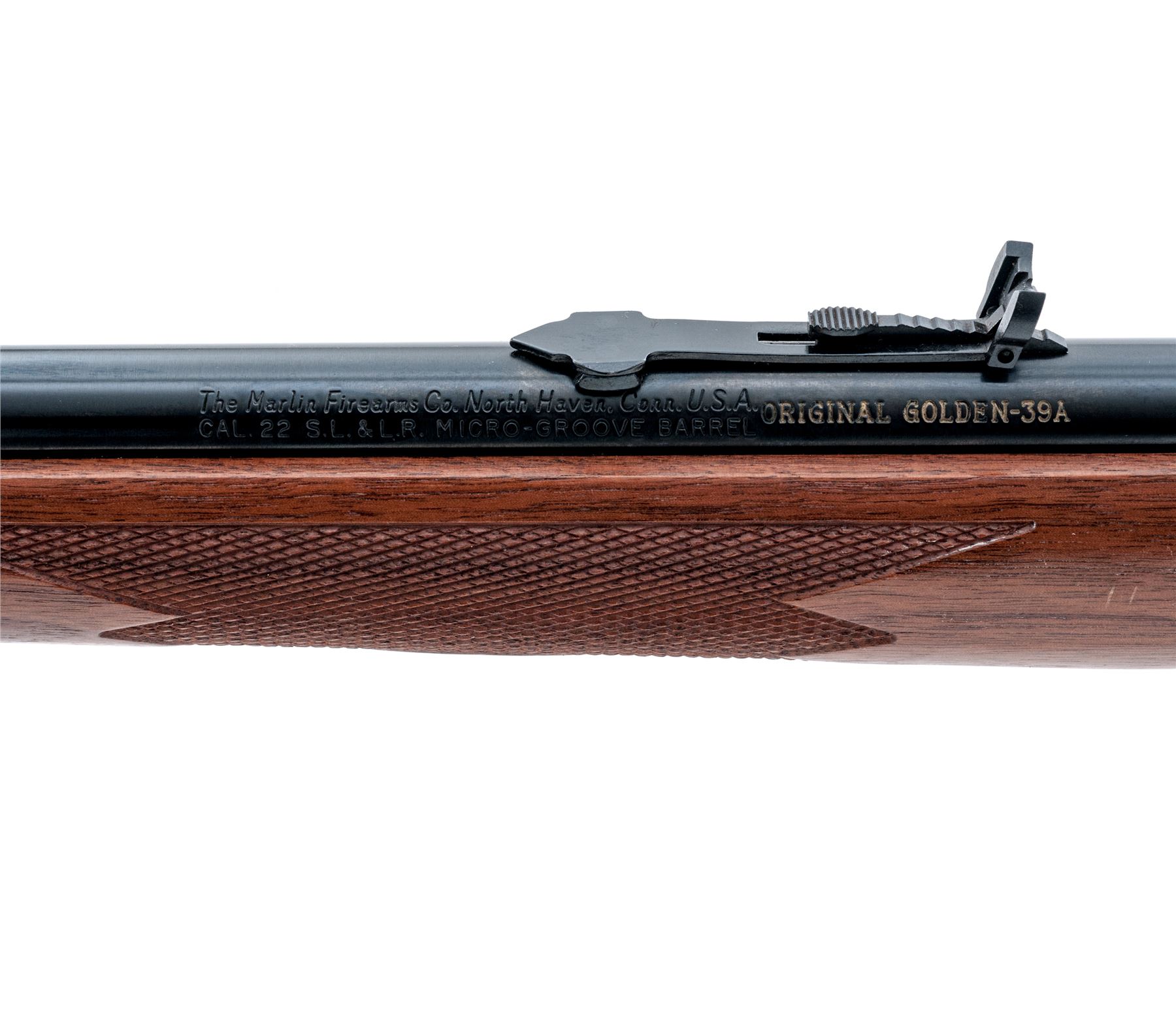 Marlin ''Original Golden'' 39A Lever Action Rifle, #99136637, .22 S-L-LR cal., 24'' round micro-groove ''JM'' marked barrel, blue finish; oil-finished pistol-grip walnut stock and forend with diamond center checkering at the wrist and forend, fluted comb, brown rubber Marlin pad with black spacer, black composite grip cap, blued steel forend cap, and sling swivel studs. Hooded blade front sight, semi-buckhorn rear sight with elevator, cross-bolt safety, and gold trigger. Top of receiver is factory drilled and tapped for a scope base. Approx. 98% original blue finish remains and metal surfaces rate as excellent, with a small quantity of light handling marks to the wood and metal; on the wood they are predominantly on the rear portion of the forend and lower half of buttstock. Checkering shows no mentionable wear and remains sharp. Top of receiver with small marks that appear to be from a previously mounted scope base. Factory lettering is crisp. Screw heads are straight. Action and bore are excellent. Est.: $400-$600. (Modern)