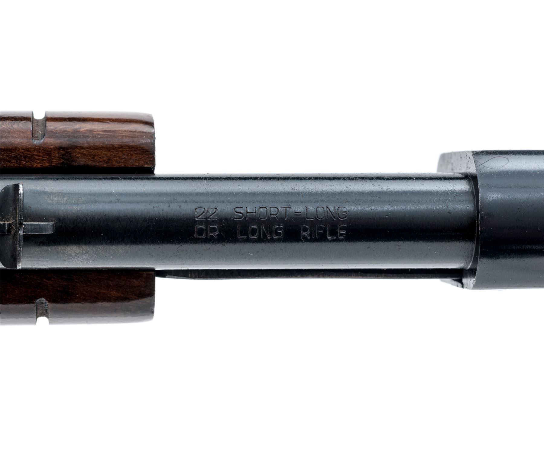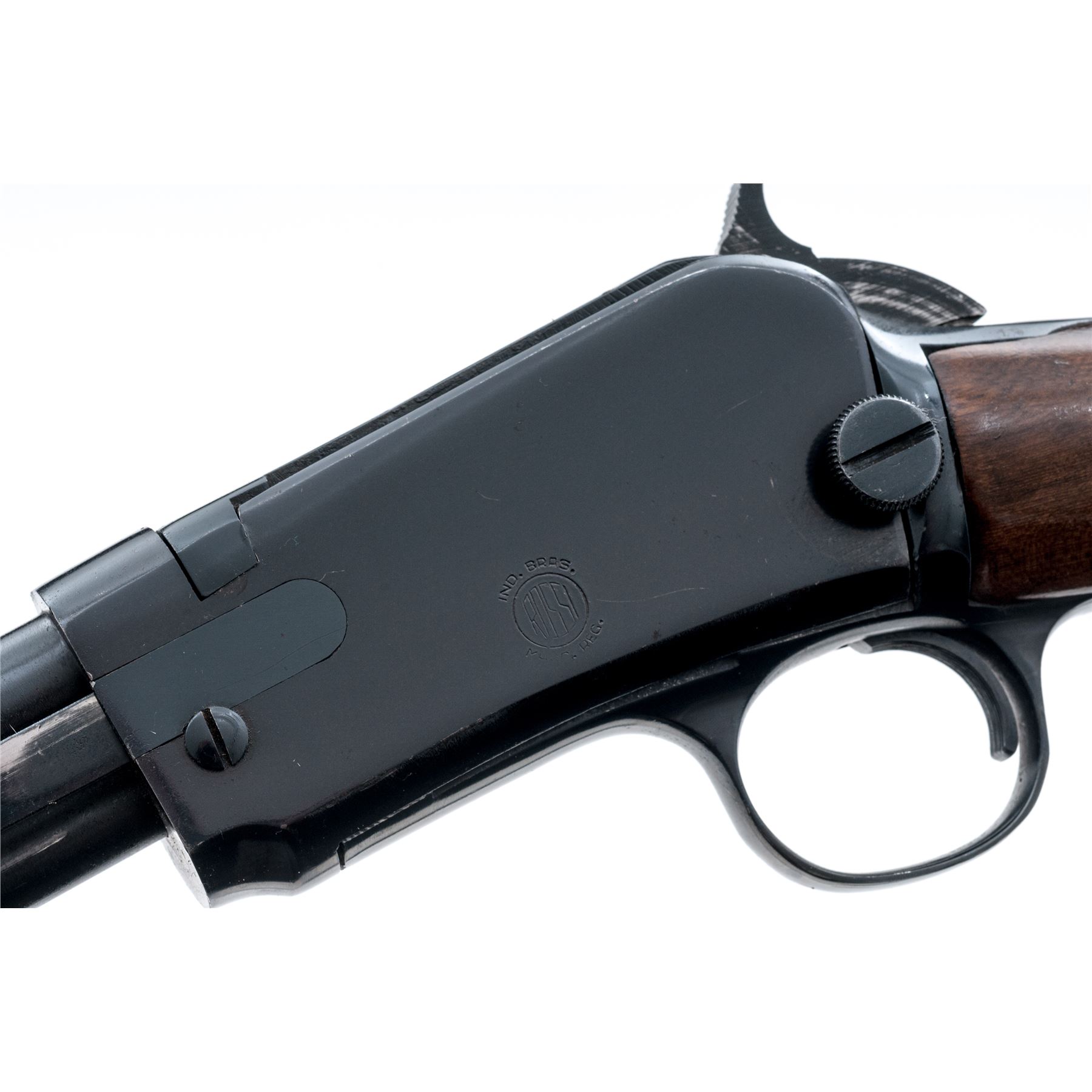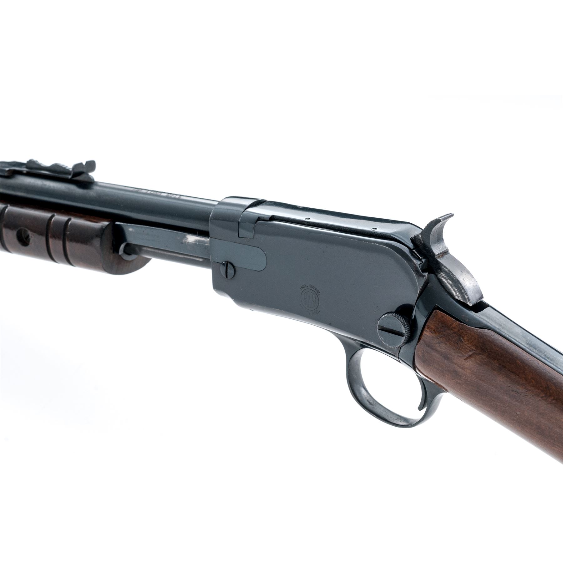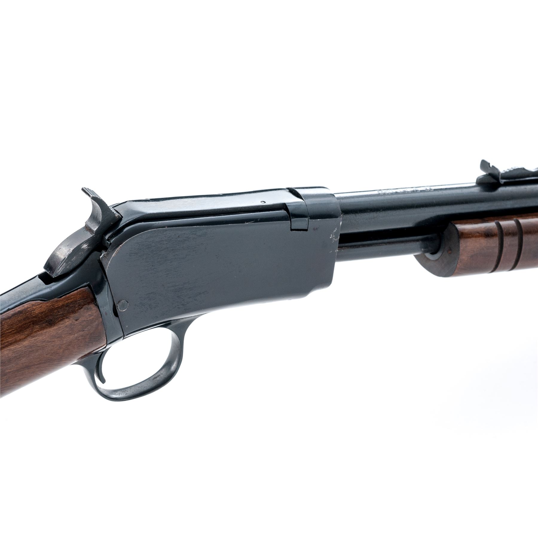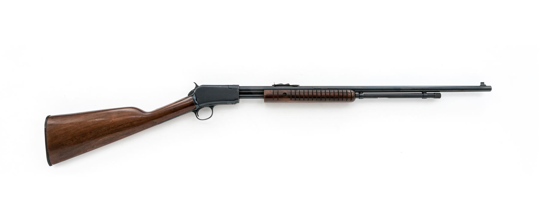 Rossi Model 62 Pump Action Rifle, #G95404, .22 S-L-LR cal., 23'' round barrel, blue finish; straight grip hardwood stock and grooved flat bottom forend with a semi-gloss finish, factory black plastic Rossi buttplate; dovetailed silver beaded blade front sight and standard notched rear sight with elevator. An earlier gun imported by The Garcia Corp. This rifle is in very good overall condition, retaining approx. 97% blue finish; barrel with intermittent specks of oxidation, receiver with light handling marks. Wood retains nearly all of the finish with general mostly shallow handling marks; the highest concentration being on the forend and at the wrist. Action is crisp and operates smoothly. Bore is bright with excellent defined rifling. Est.: $150-$250. (Modern)