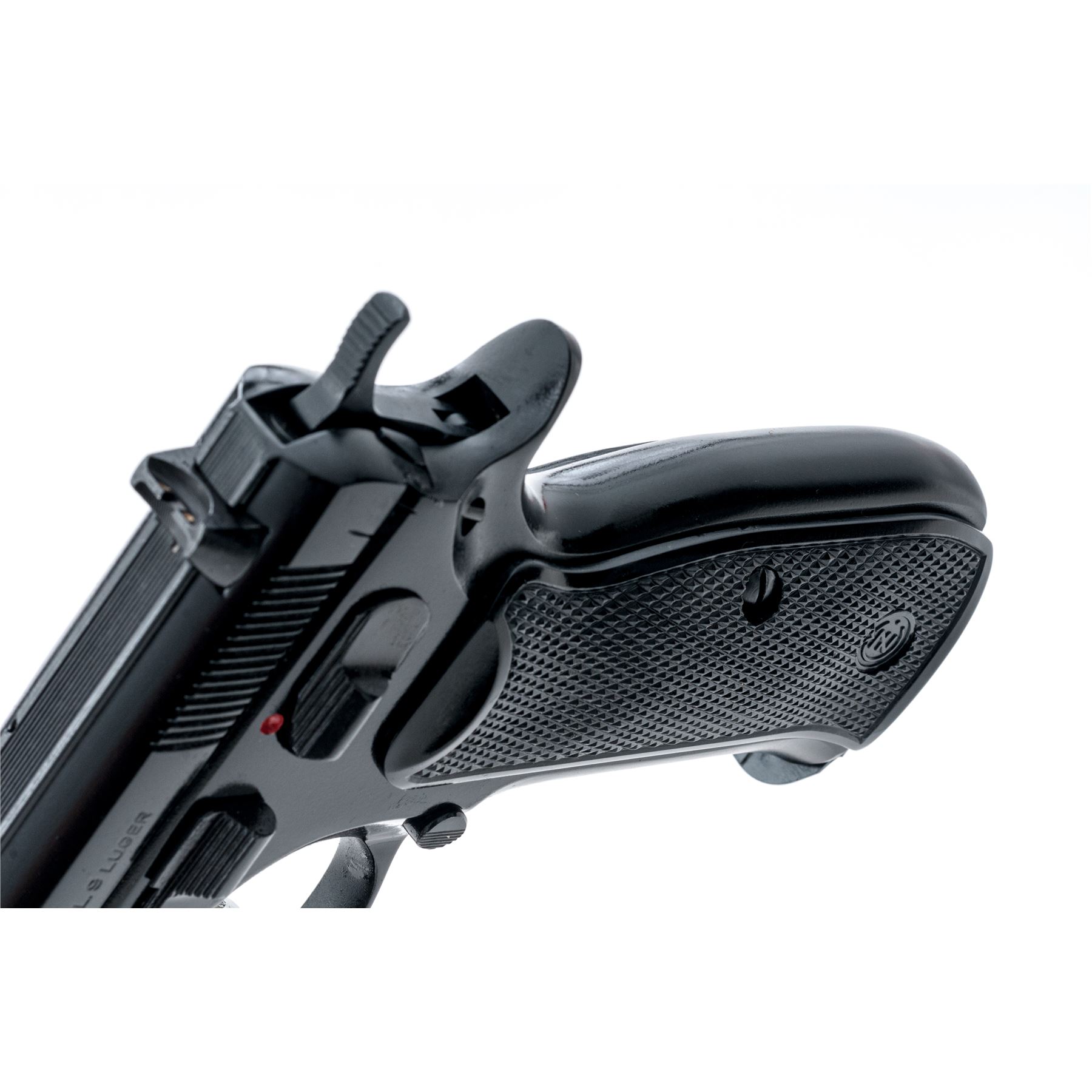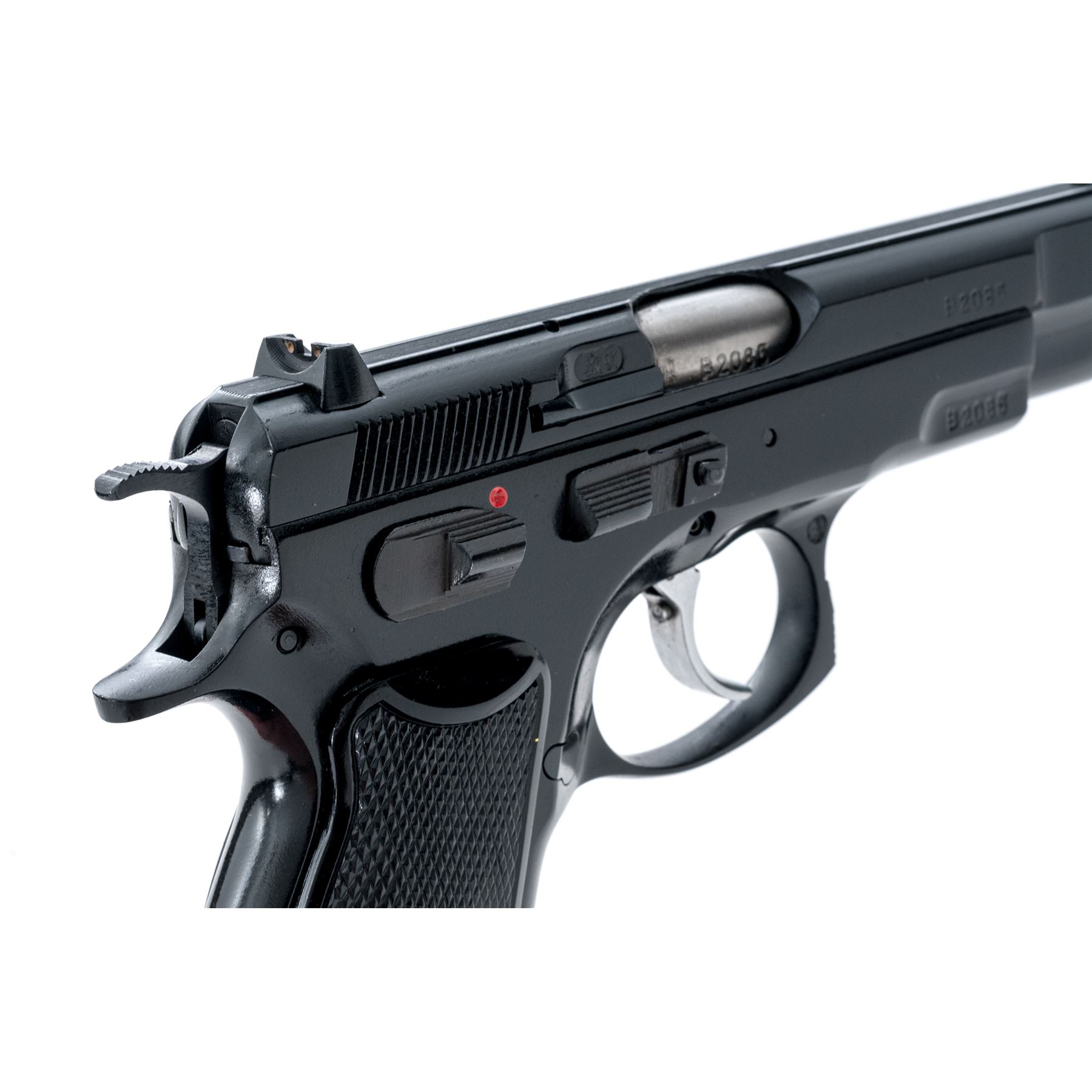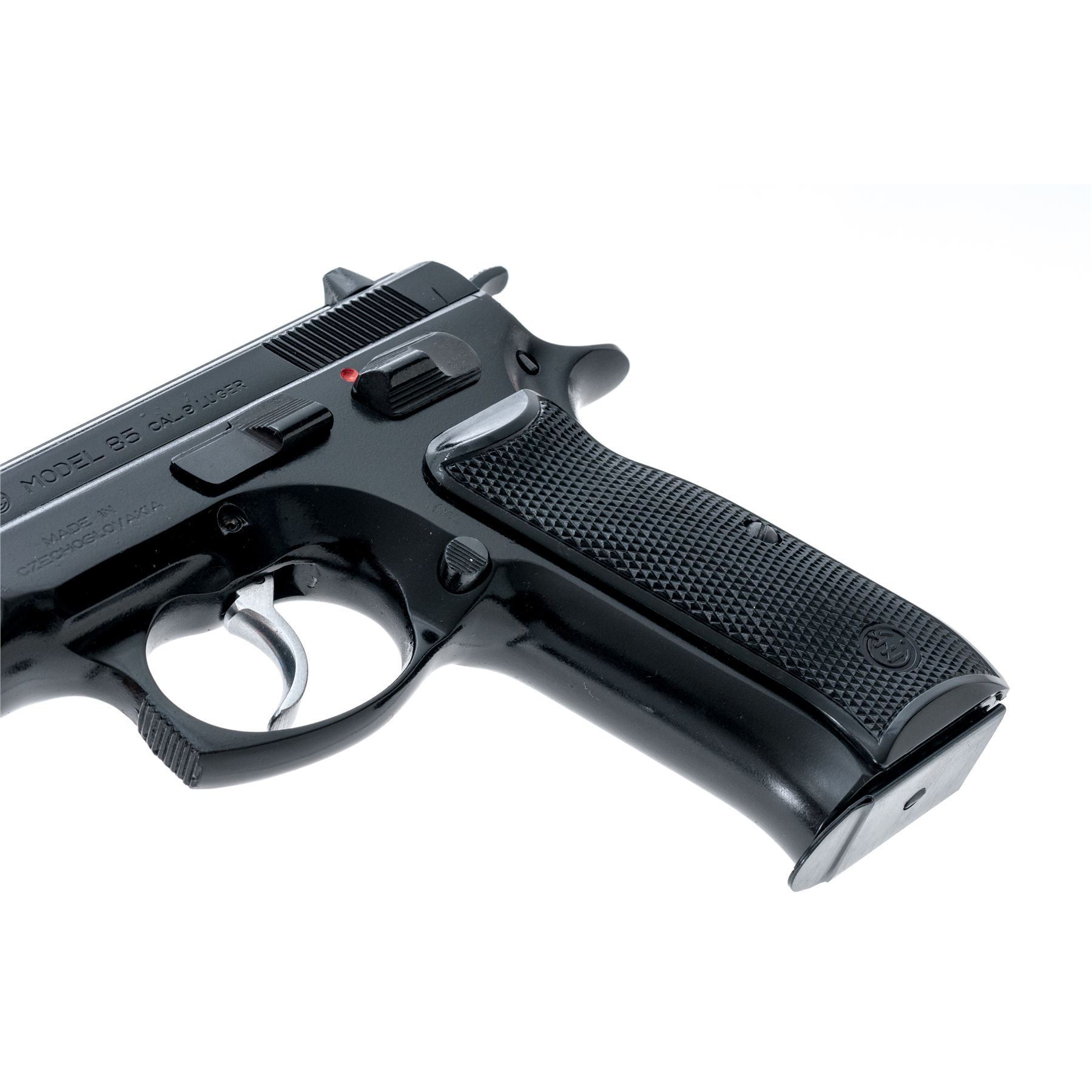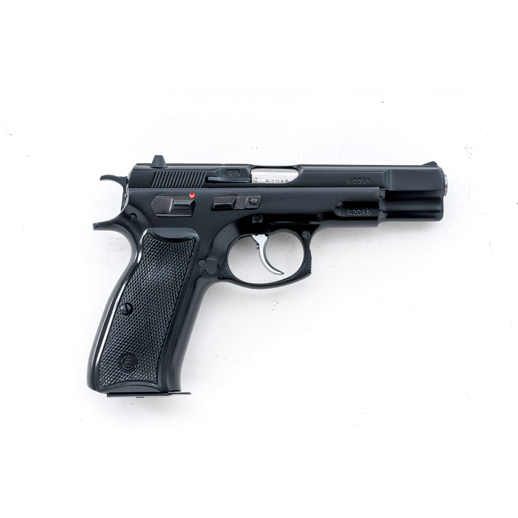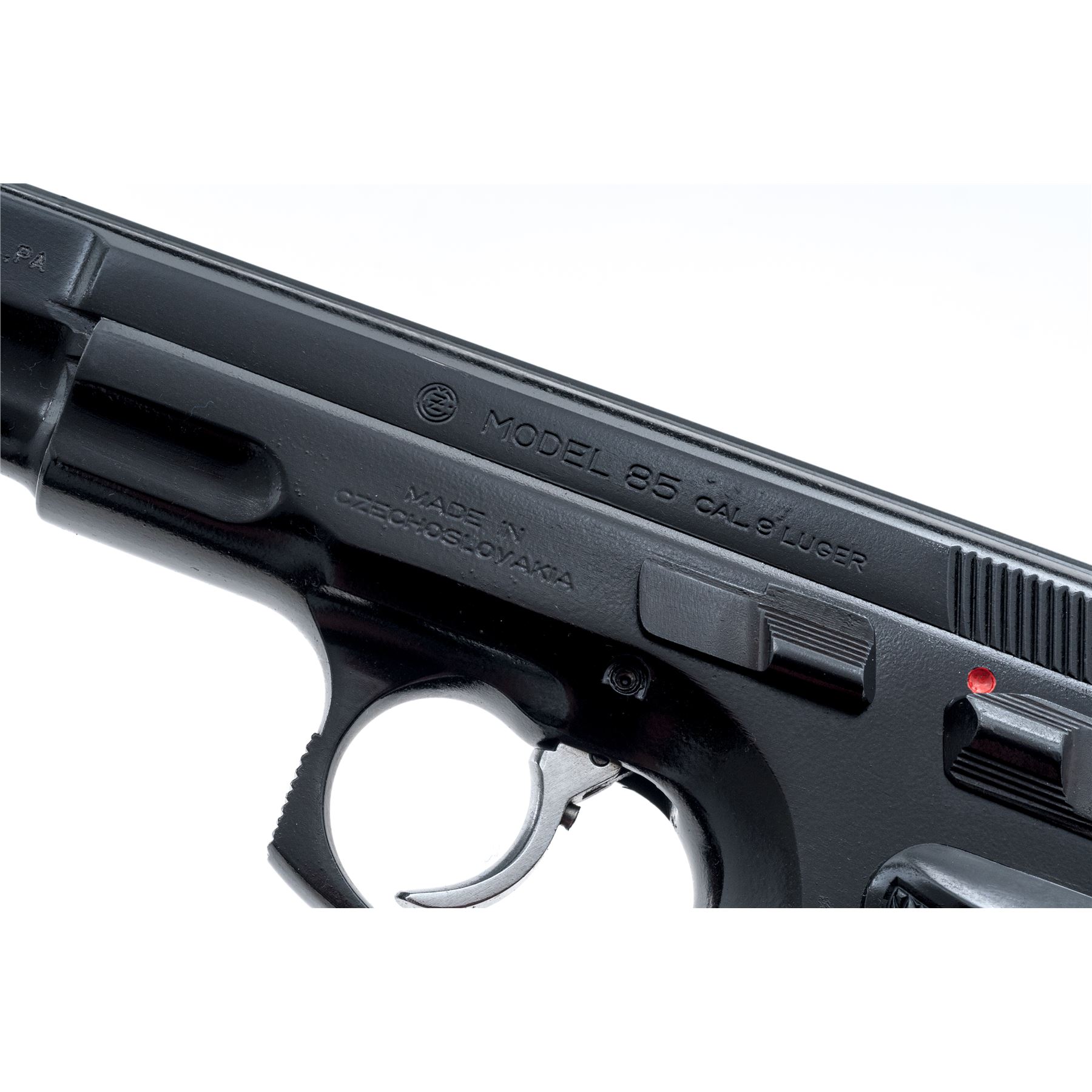 CZ Model CZ-85 Semi-Automatic Pistol, #B2085, 9mm cal., double/single action, 4.5'' barrel, gloss black finish, checkered black plastic CZ grips, ramped front sight, white two-dot square notched rear sight, ambidextrous safety and slide release, with one unmarked 16-round magazine. Condition is excellent retaining approx. 99% original metal finish, with a few slight handling marks. Grips are like new with clean sharp checkering. Smooth action, mirror bright bore with excellent rifling; overall this pistol appears to have been handled and fired very little. Est.: $400-$600. (Modern/PPT) (High-cap mag not available to Calif. residents.)