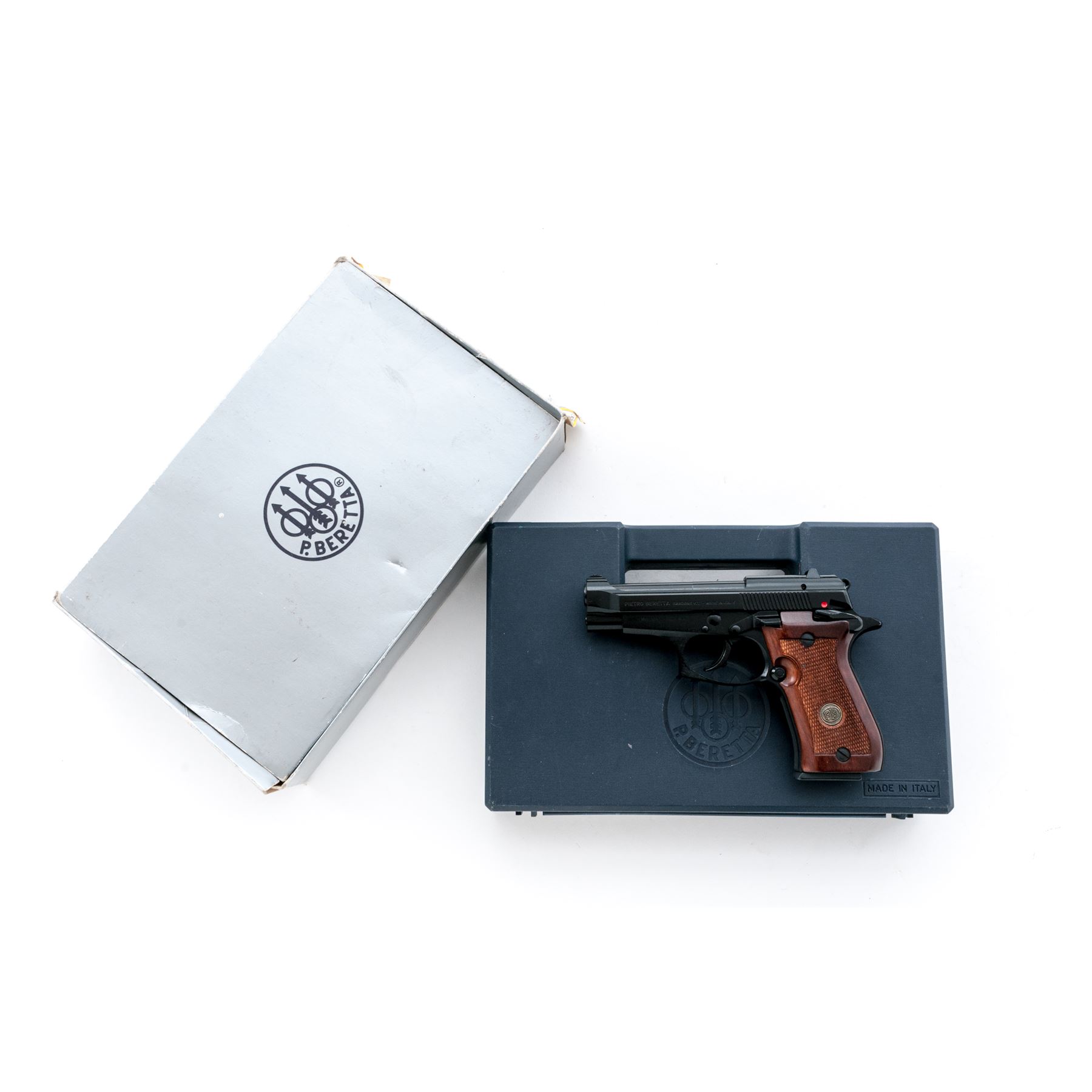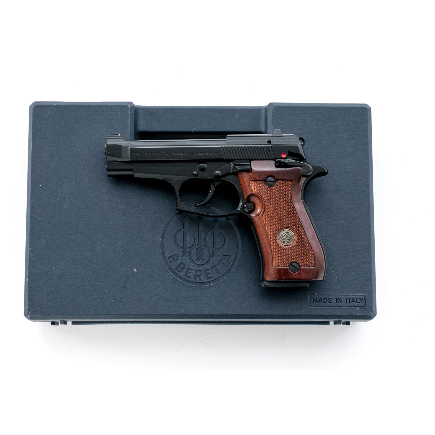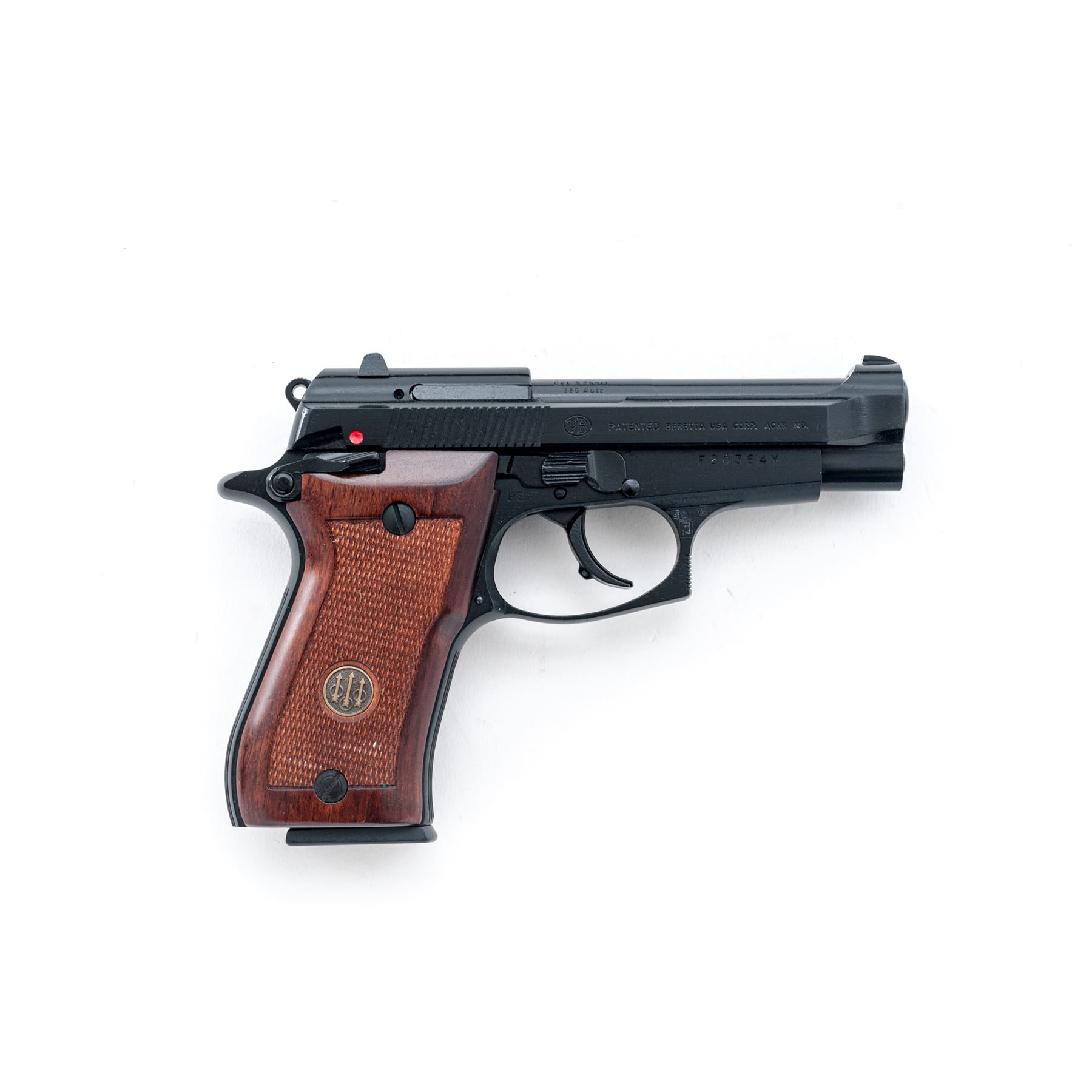 Like New Beretta Model 85F Cheetah Semi-Automatic Pistol, #F20364Y, .380 ACP cal., 3.75'' barrel, black Bruniton finish, factory checkered wood grips with Beretta medallions, white-dot sights, ambidextrous safety, with two (2) factory magazines. In original blue plastic Beretta case with owner's manual, and exterior cardboard box with matching end label. Made in Italy. In like new overall condition, pistol shows very little evidence of being fired. Black finish with no visible wear or finish loss. Left grip with a few tiny marks along the bottom edge. Breech face, chamber area, and mirror bright bore are all very clean. Cardboard box shows storage type wear. Est.: $350-$550. (Modern/PPT)