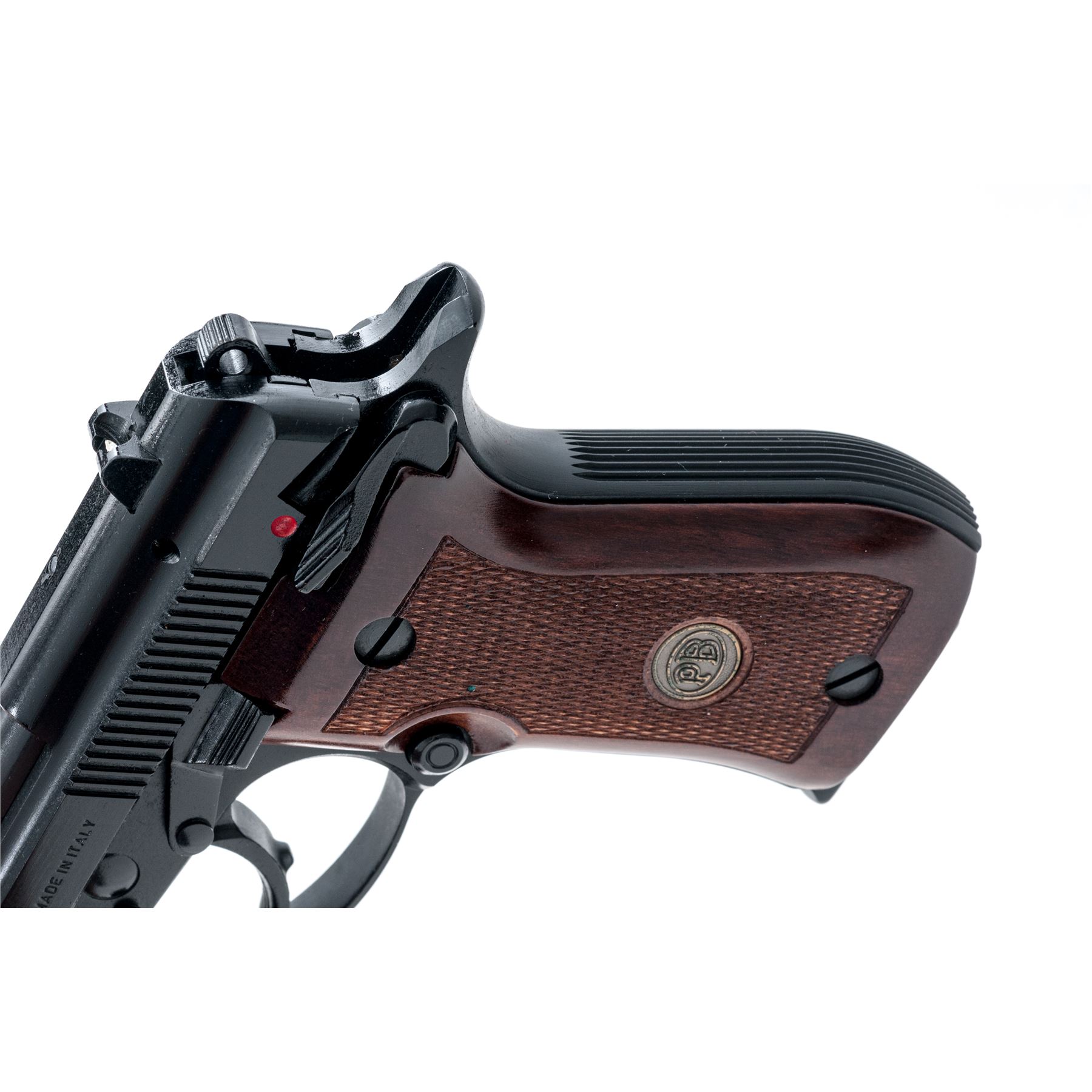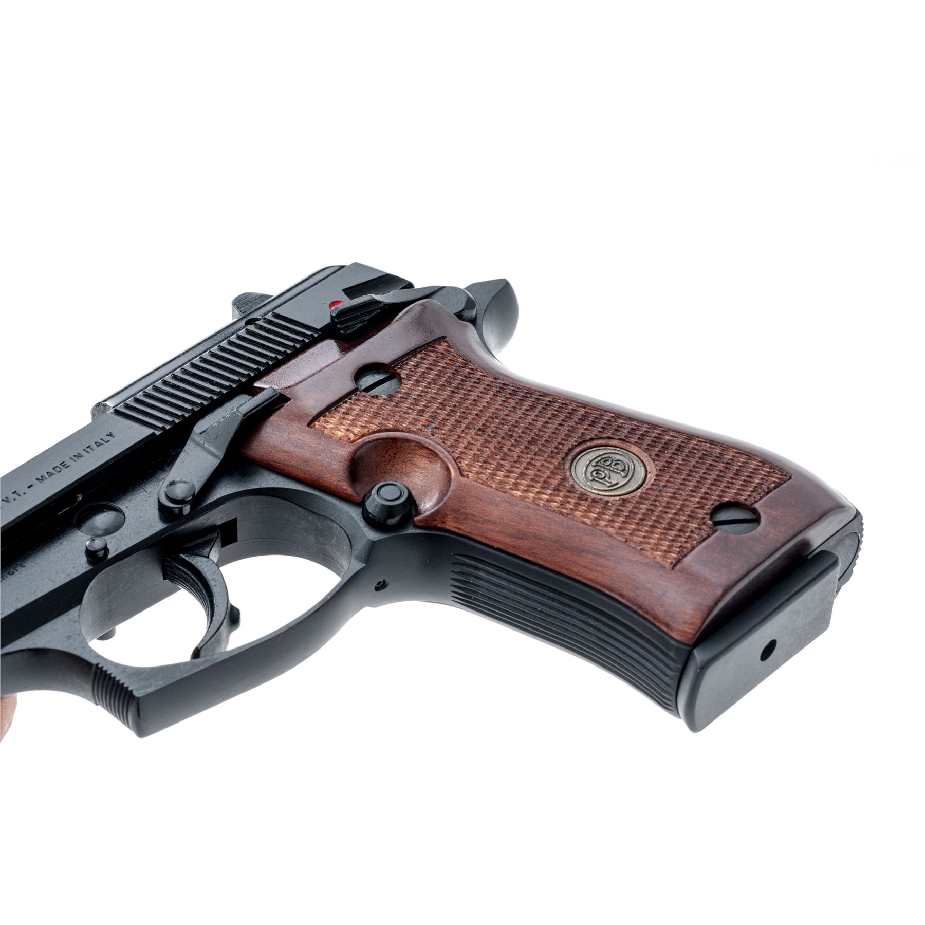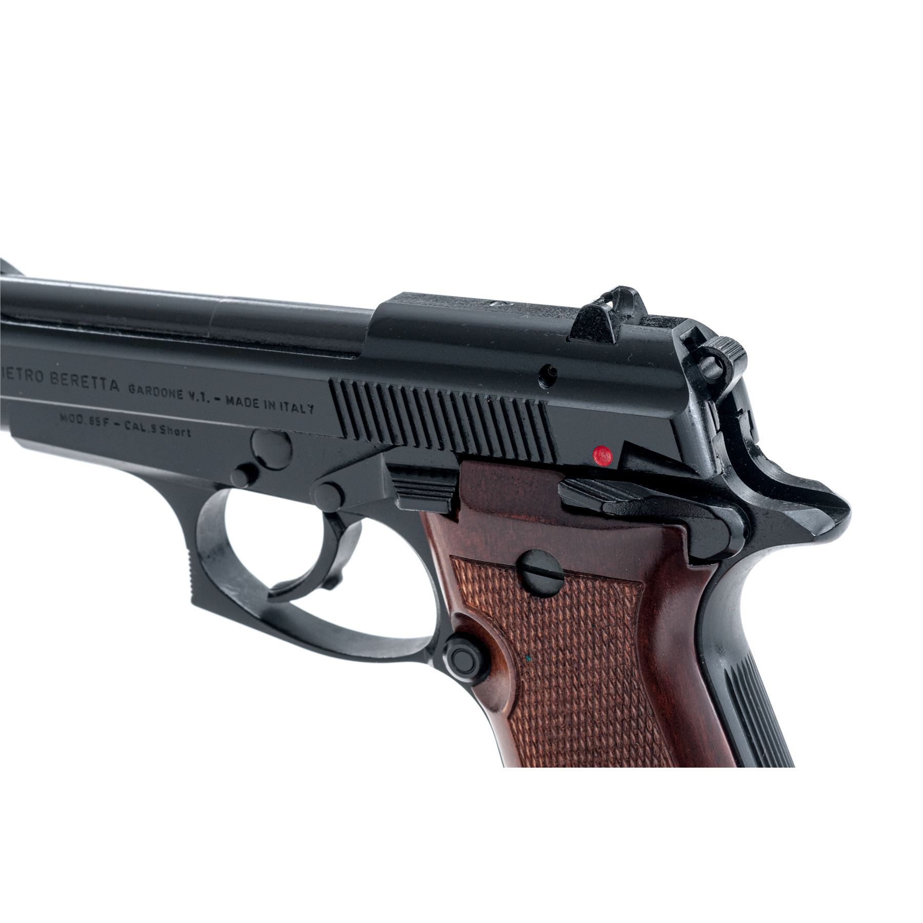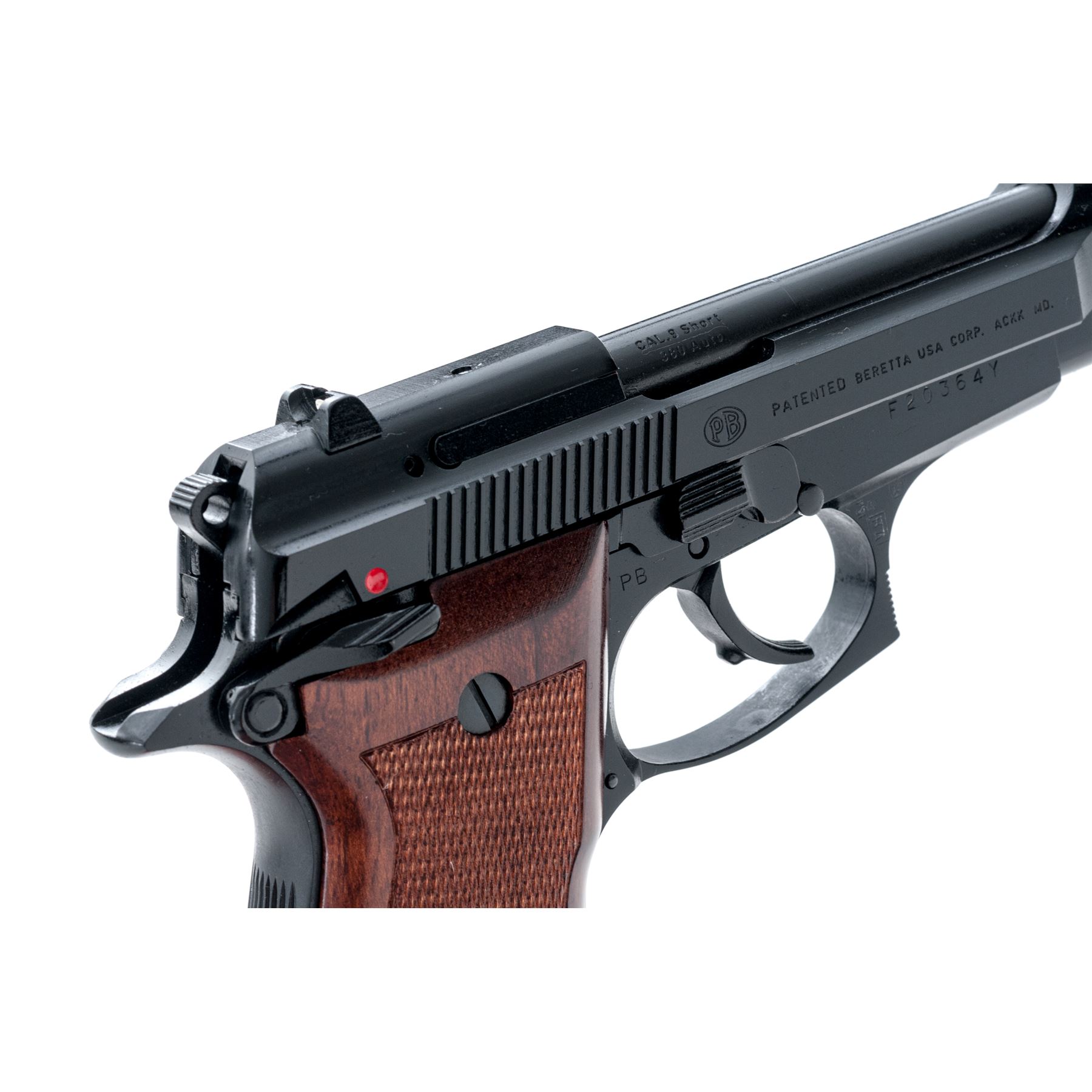 Like New Beretta Model 85F Cheetah Semi-Automatic Pistol, #F20364Y, .380 ACP cal., 3.75'' barrel, black Bruniton finish, factory checkered wood grips with Beretta medallions, white-dot sights, ambidextrous safety, with two (2) factory magazines. In original blue plastic Beretta case with owner's manual, and exterior cardboard box with matching end label. Made in Italy. In like new overall condition, pistol shows very little evidence of being fired. Black finish with no visible wear or finish loss. Left grip with a few tiny marks along the bottom edge. Breech face, chamber area, and mirror bright bore are all very clean. Cardboard box shows storage type wear. Est.: $350-$550. (Modern/PPT)