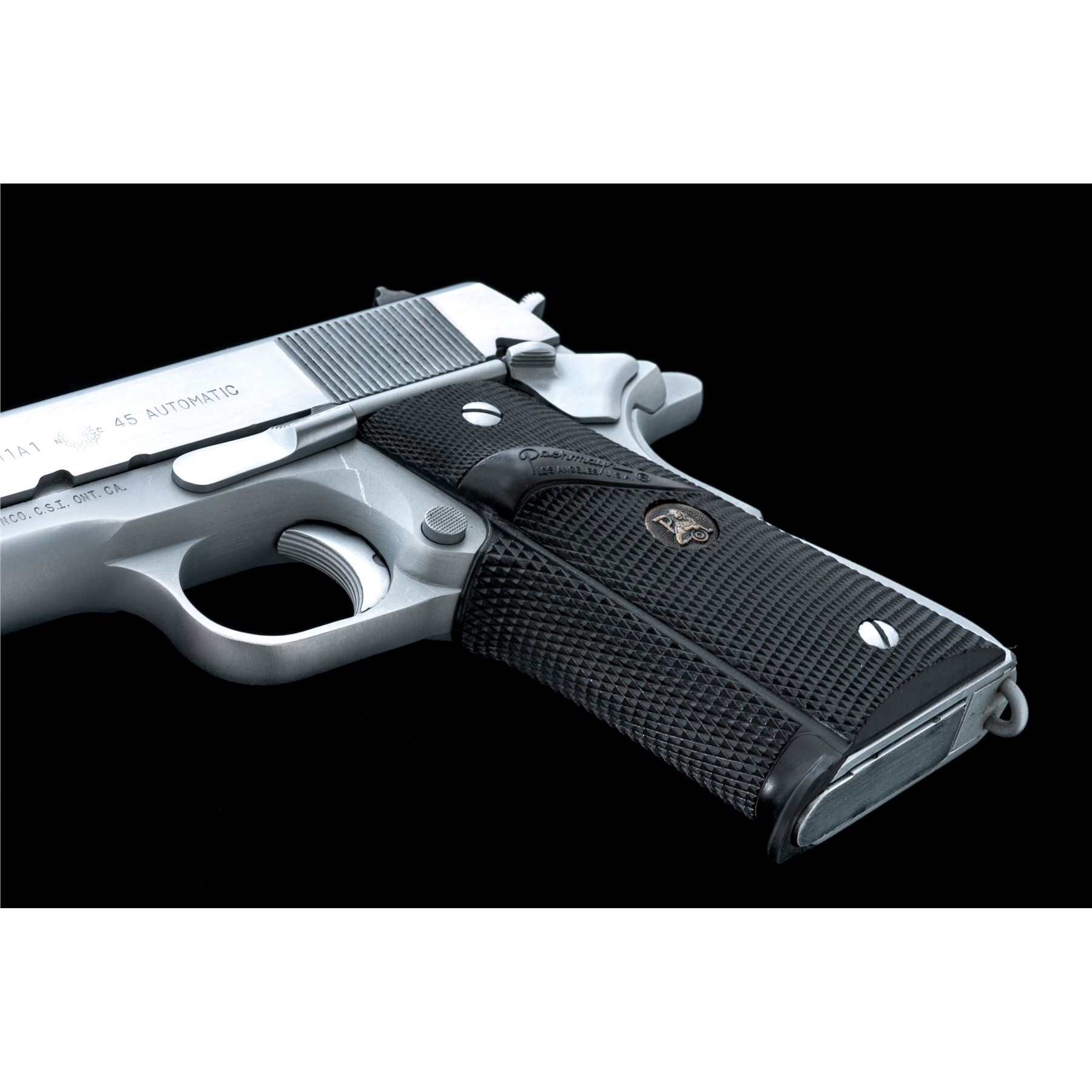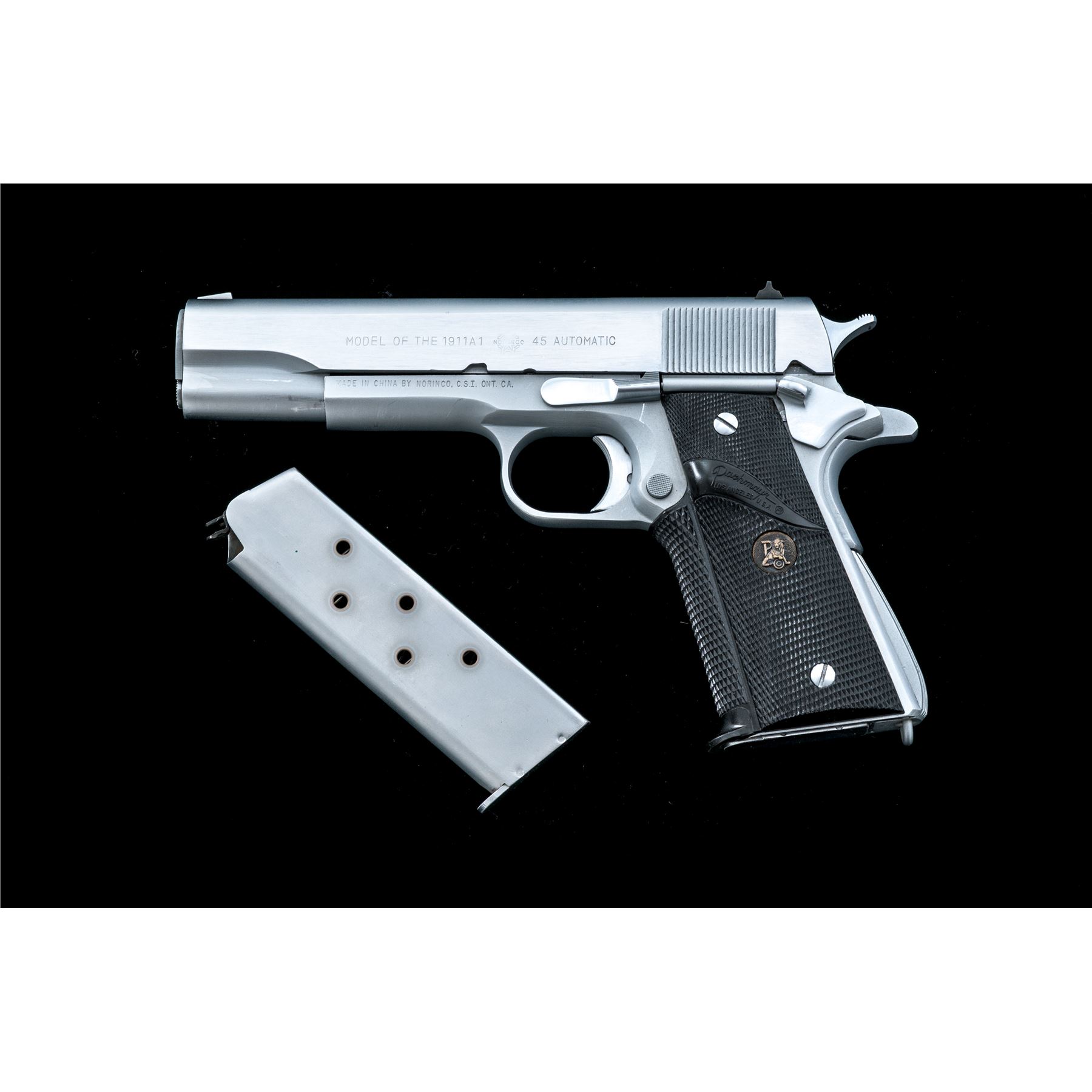 Norinco ''Model of the 1911-A1'' Semi-Automatic Pistol, #410063, .45 ACP cal., 5'' barrel, hard chrome finish, Pachmayr wraparound checkered rubber grips, arched mainspring with lanyard loop, three-dot sight system, with two (2) magazines and instruction sheet. Condition is excellent, showing little use. Est.: $500-$750. (Modern/PPT)