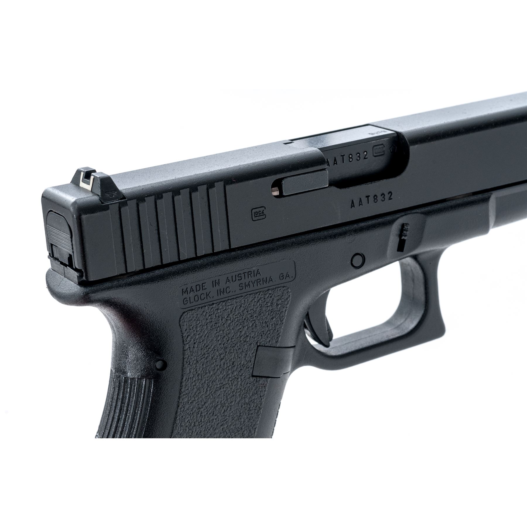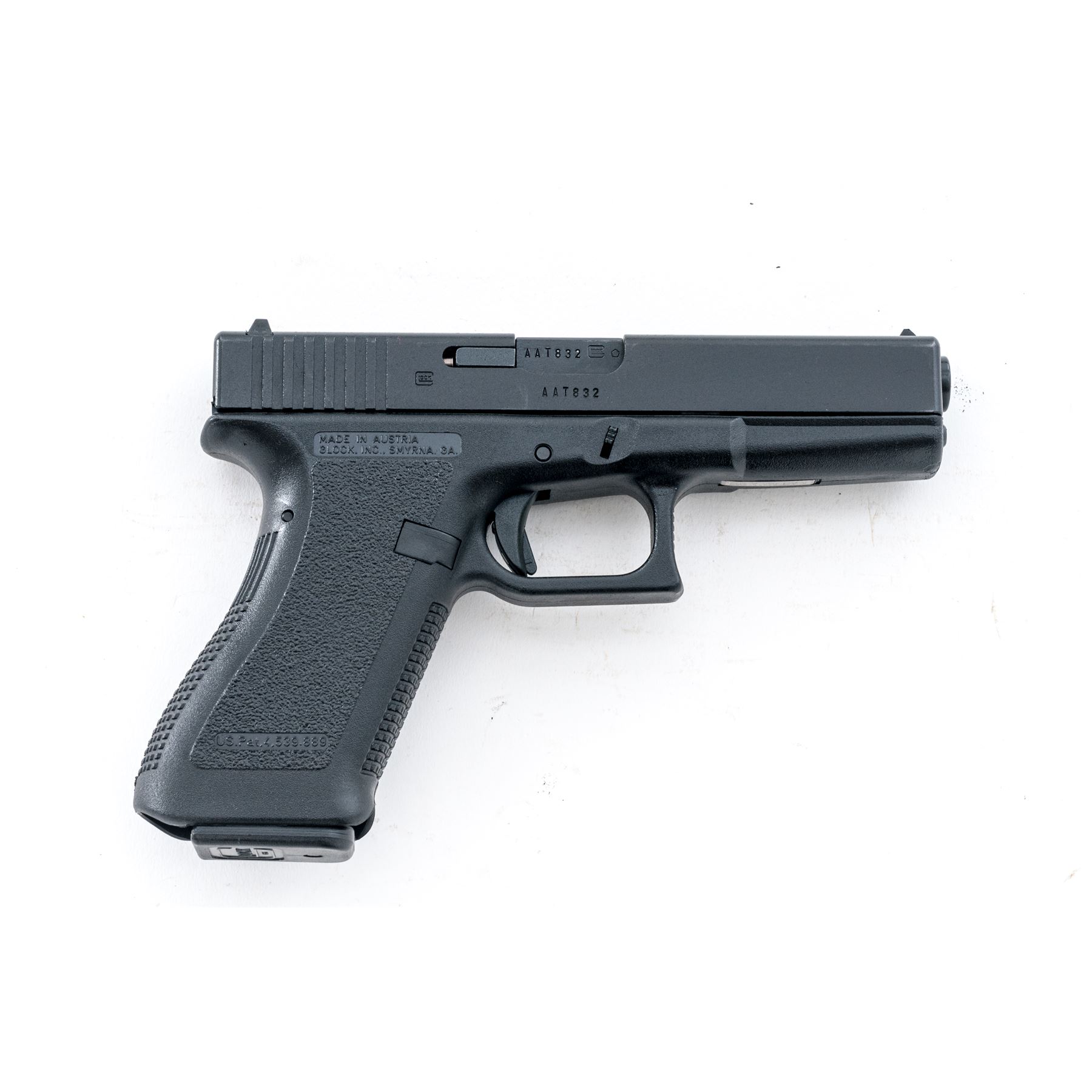 Like New Glock Model 17 Gen 2 Semi-Automatic Pistol, #AAT832US, 9mm, 4.5'' barrel, matte black slide, black polymer frame, white dot front sight and white outline rear sight, includes one 17-round Glock magazine. Pistol is in excellent as new overall condition. Bottom front tip of frame with a single small impression, otherwise the frame and slide show no mentionable handling wear. Smooth action, mirror bright bore. Est.: $350-$550. (Modern/PPT) (High-cap mags not available to Calif. residents.)