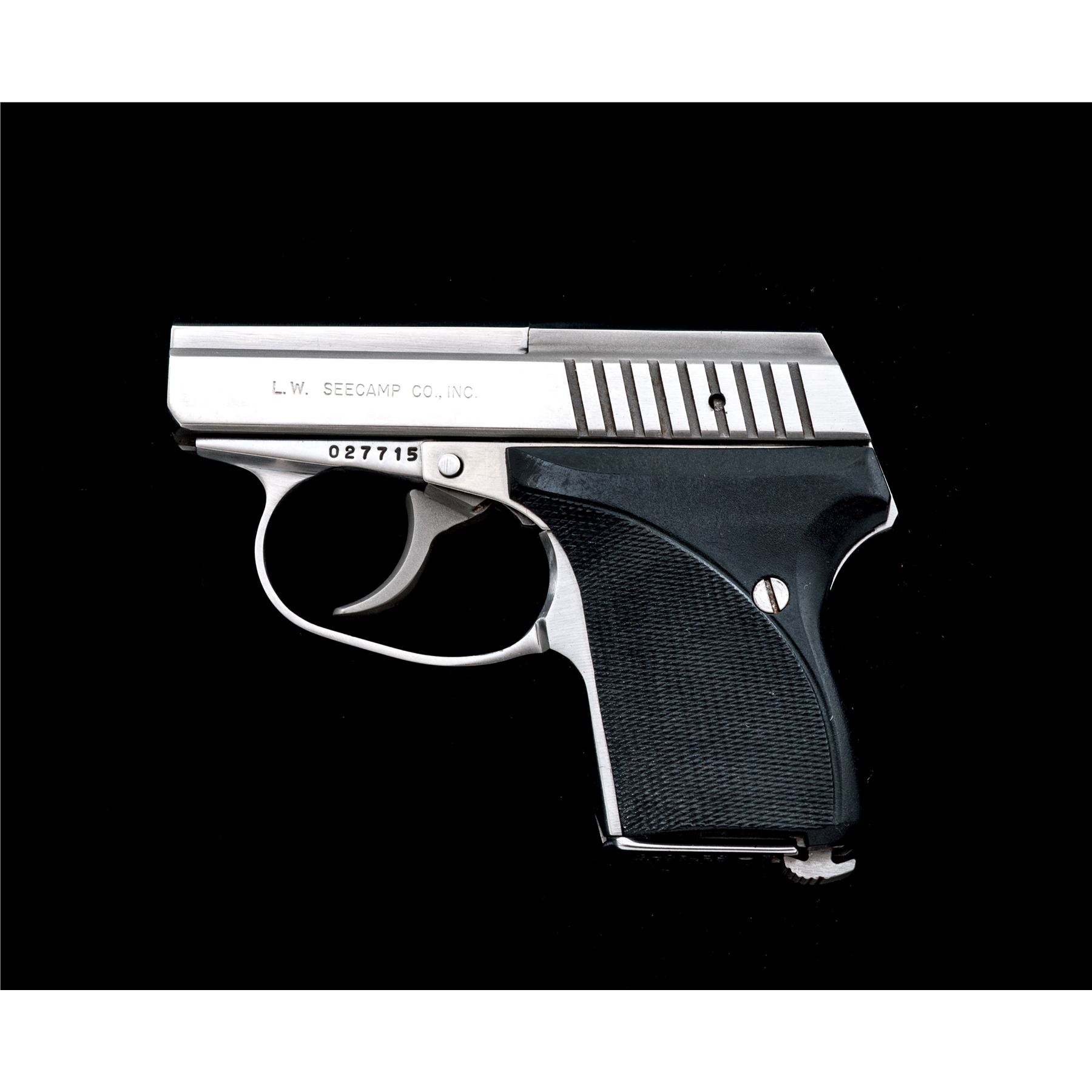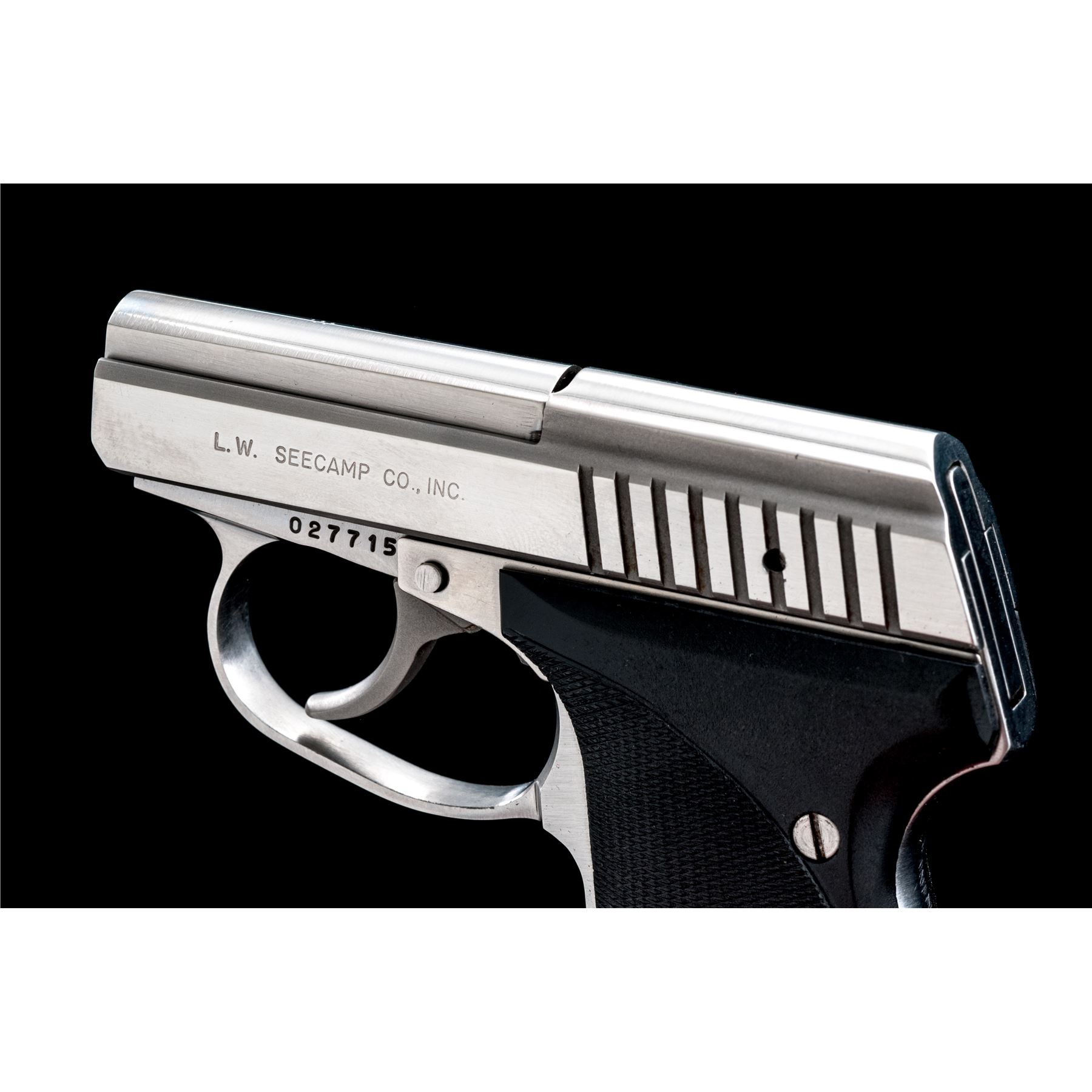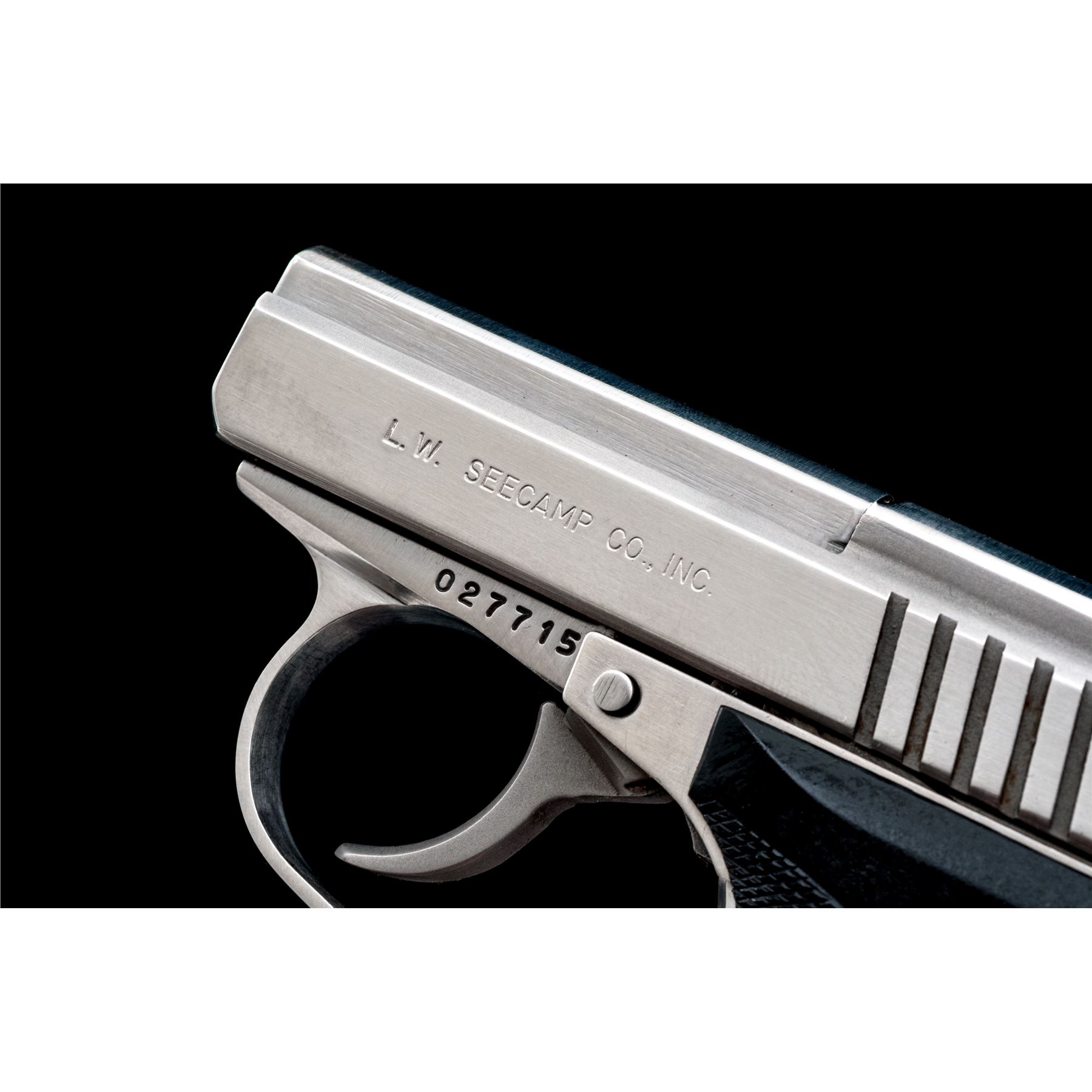 L.W. Seecamp Co. Model LWS32 Semi-Automatic Pistol, #027715, .32 ACP cal., double action only, 2.06'' barrel, stainless steel, no sights, checkered black plastic grips, with one factory magazine. Metal rates as near excellent with some fine micro-scratching on front half of slide. Grips are excellent with only a few insignificant handling marks. Smooth action, excellent bore. Est.: $300-$400. (Modern/PPT)