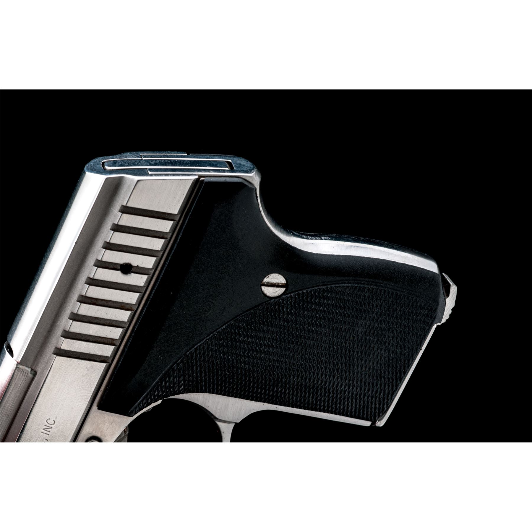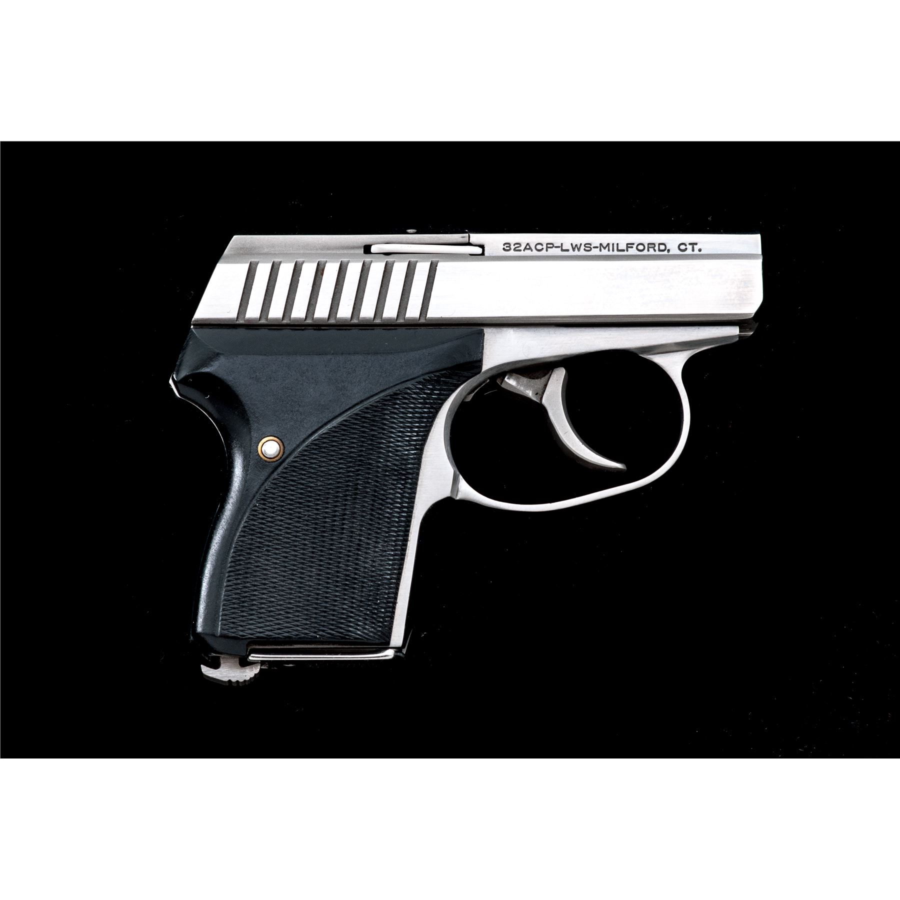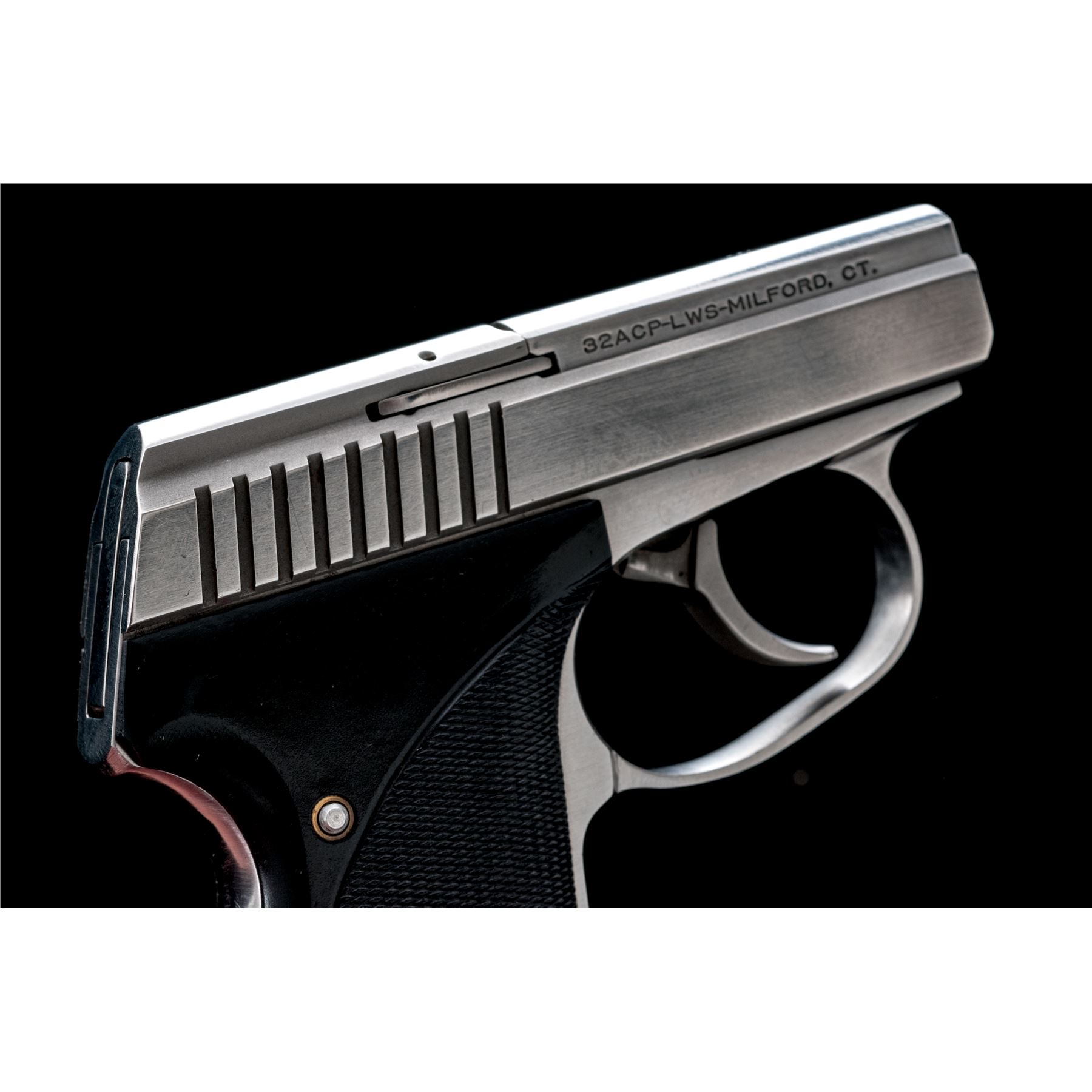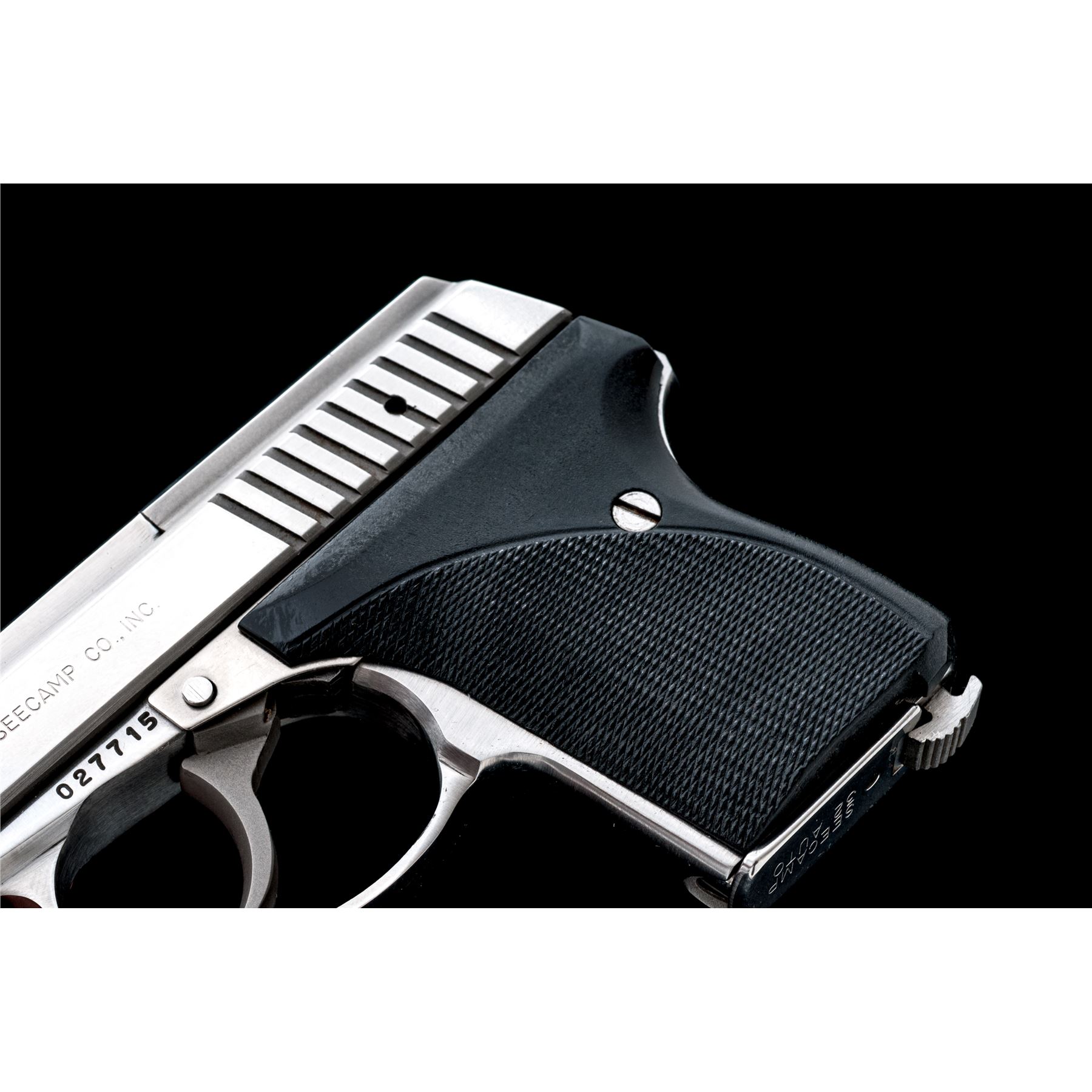 L.W. Seecamp Co. Model LWS32 Semi-Automatic Pistol, #027715, .32 ACP cal., double action only, 2.06'' barrel, stainless steel, no sights, checkered black plastic grips, with one factory magazine. Metal rates as near excellent with some fine micro-scratching on front half of slide. Grips are excellent with only a few insignificant handling marks. Smooth action, excellent bore. Est.: $300-$400. (Modern/PPT)