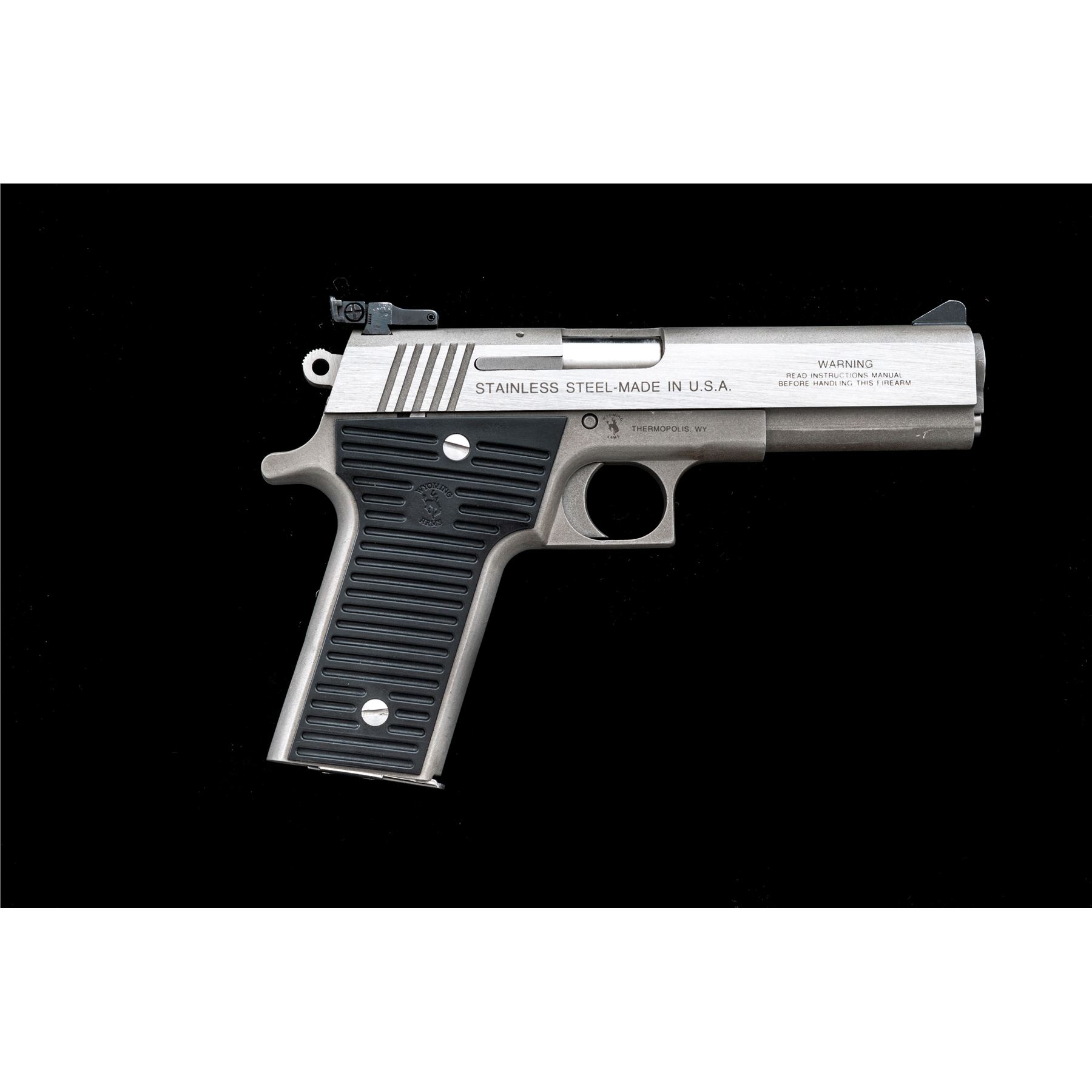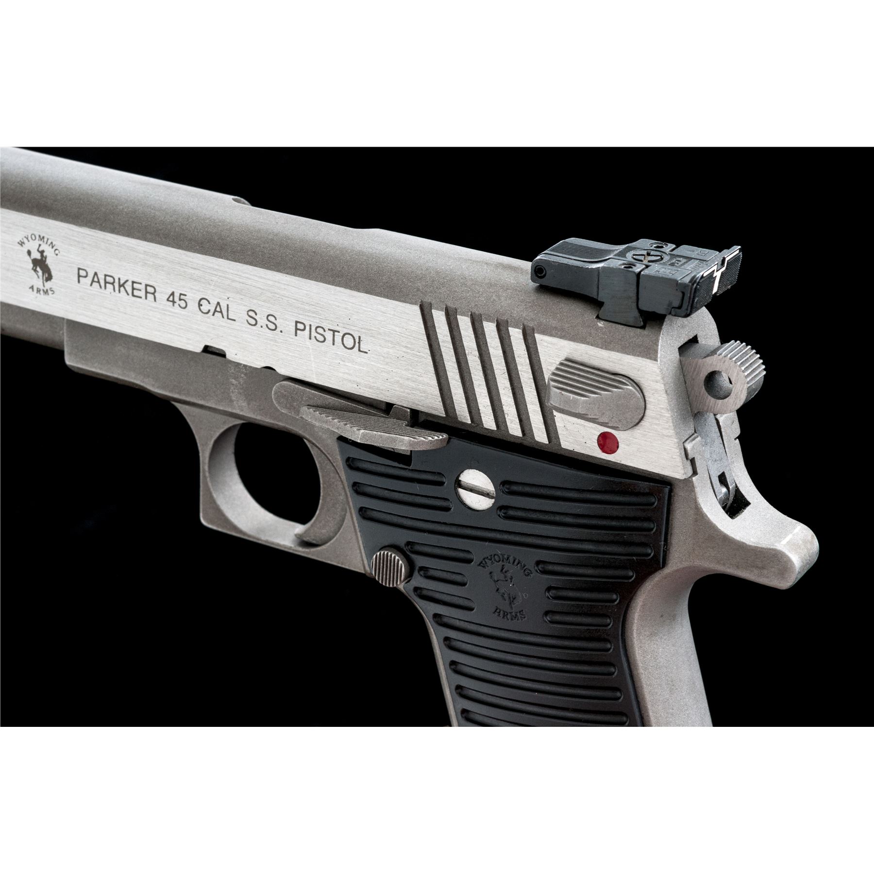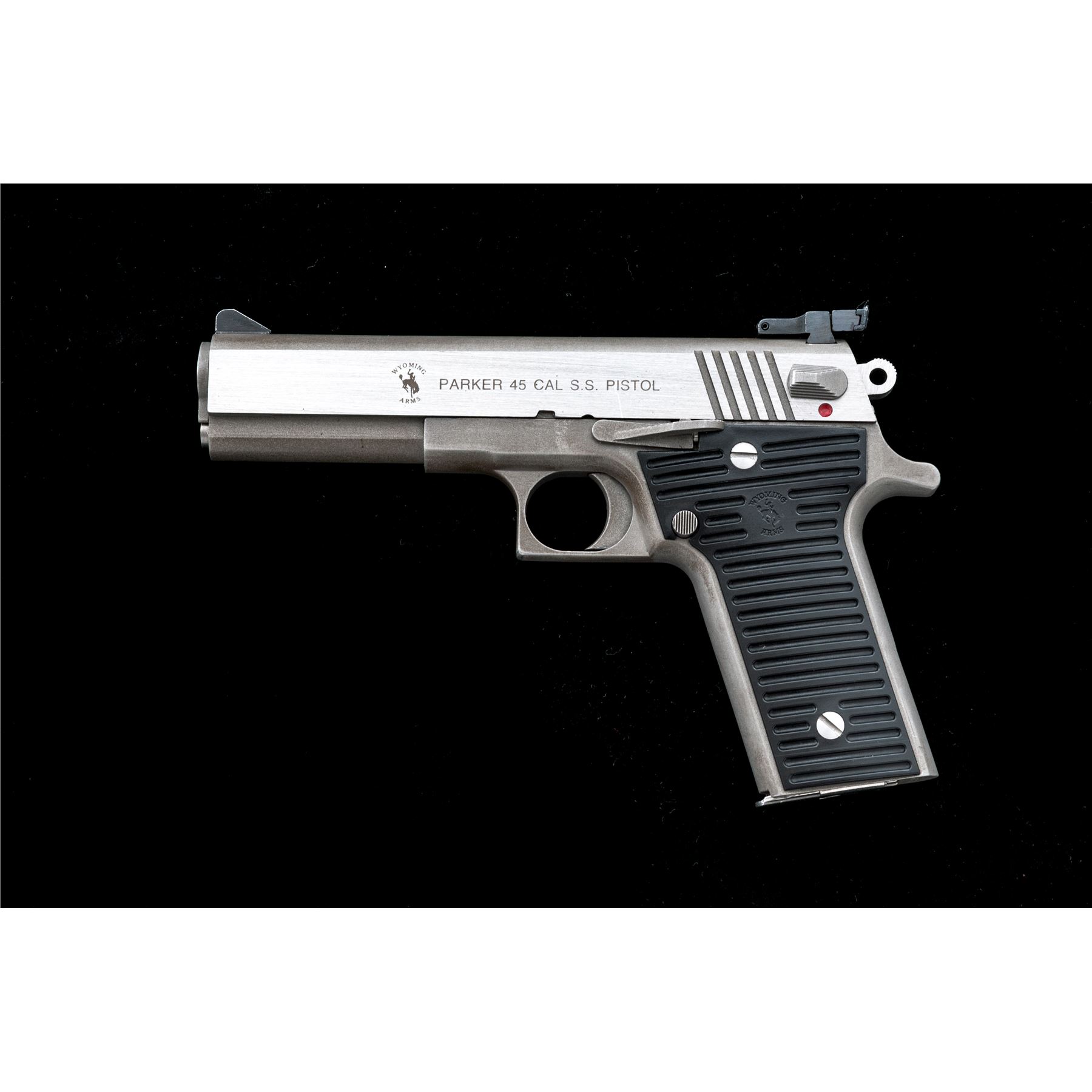 Wyoming Arms Parker Semi-Automatic Pistol, #A02618, .45 ACP cal., 5'' barrel. Frame and top of slide with a matte stainless finish, sides of slide are satin stainless; factory grooved black plastic Wyoming Arms grips, Millett blade front and adjustable rear sight, with one stainless steel magazine. Made in Thermopolis, Wyoming. Metal surfaces rate as very good+, showing normal signs of moderate range use, with scattered light scuffs and small scratches, mainly to the matte surfaces. Grips are excellent with only a few very minor marks from handling. Right side of rear sight with a little thinning to the finish. Smooth action, very good bore. Est.: $300-$400. (Modern)(Not available to Calif. residents.)