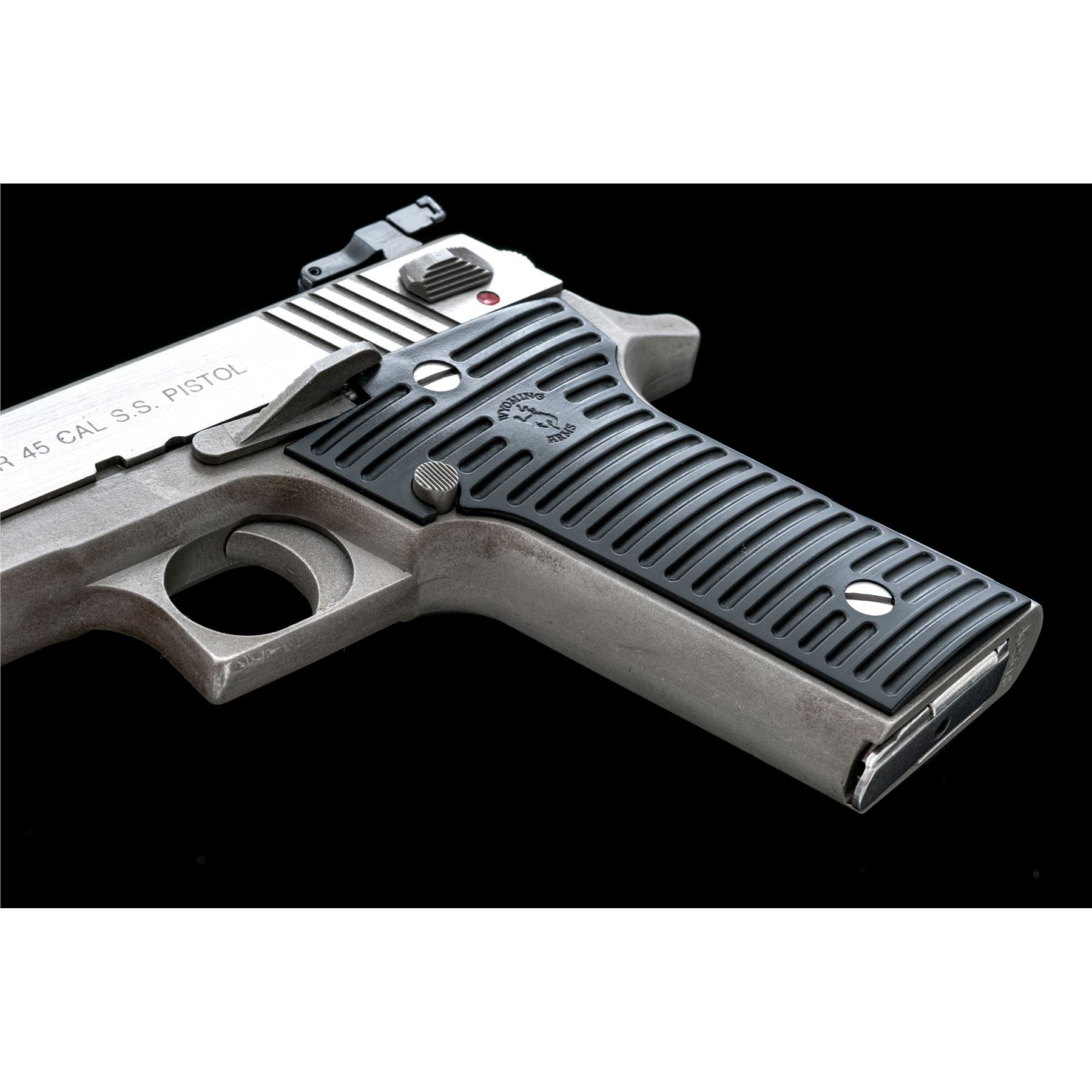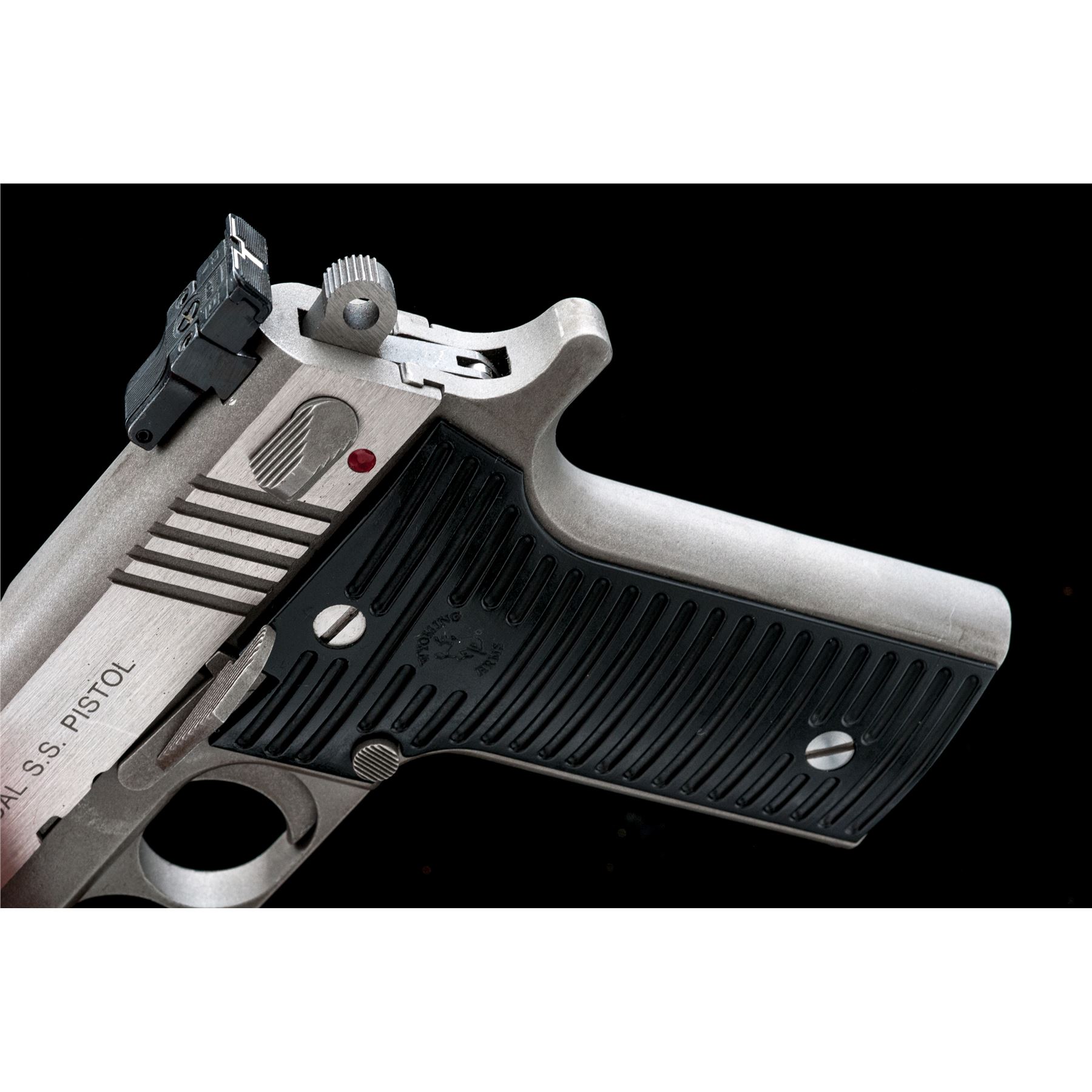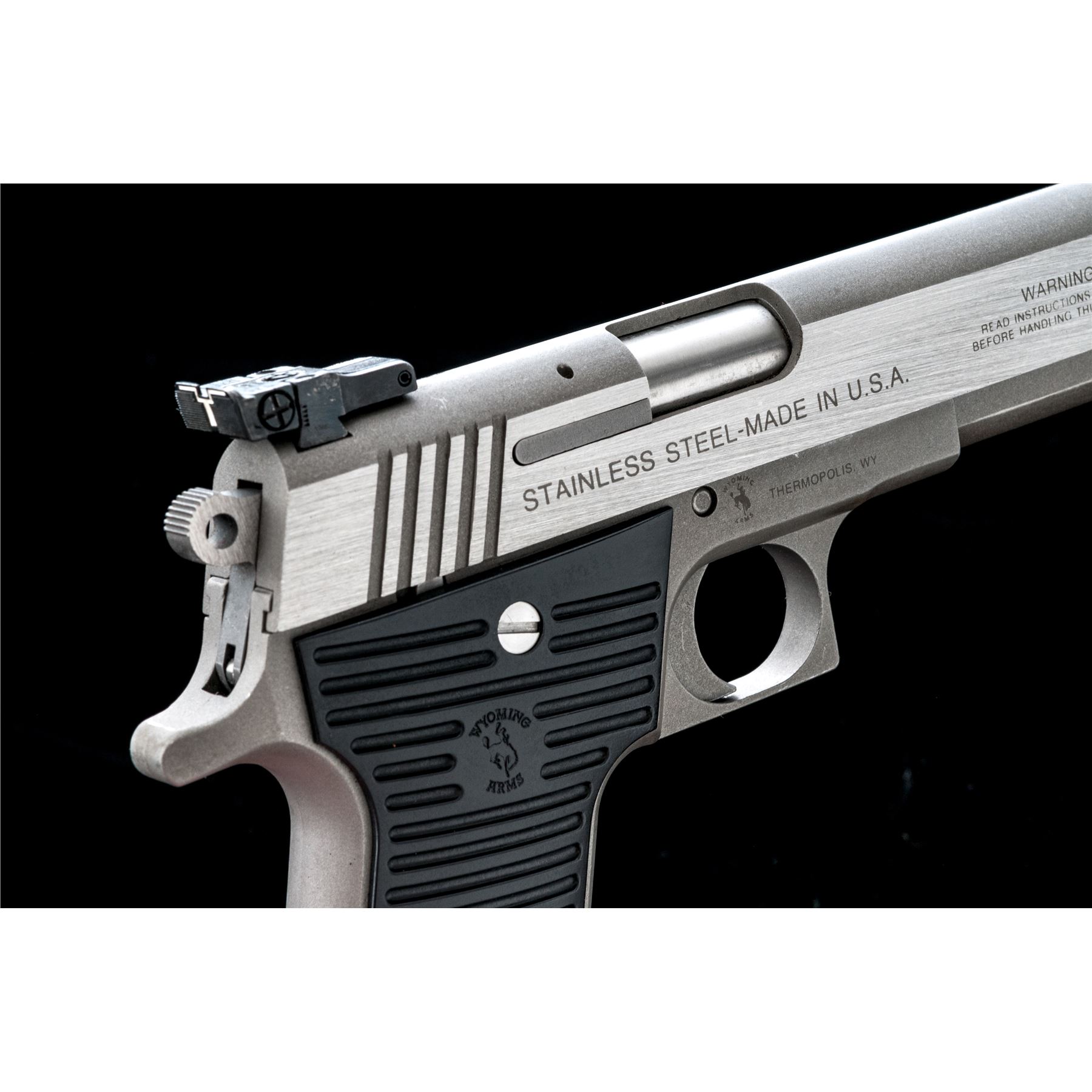 Wyoming Arms Parker Semi-Automatic Pistol, #A02618, .45 ACP cal., 5'' barrel. Frame and top of slide with a matte stainless finish, sides of slide are satin stainless; factory grooved black plastic Wyoming Arms grips, Millett blade front and adjustable rear sight, with one stainless steel magazine. Made in Thermopolis, Wyoming. Metal surfaces rate as very good+, showing normal signs of moderate range use, with scattered light scuffs and small scratches, mainly to the matte surfaces. Grips are excellent with only a few very minor marks from handling. Right side of rear sight with a little thinning to the finish. Smooth action, very good bore. Est.: $300-$400. (Modern)(Not available to Calif. residents.)
