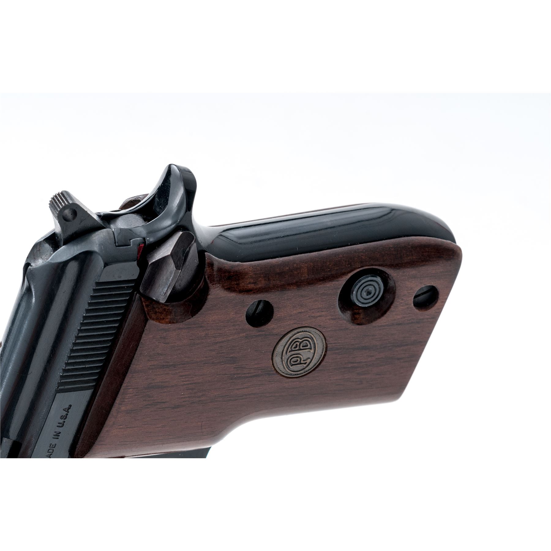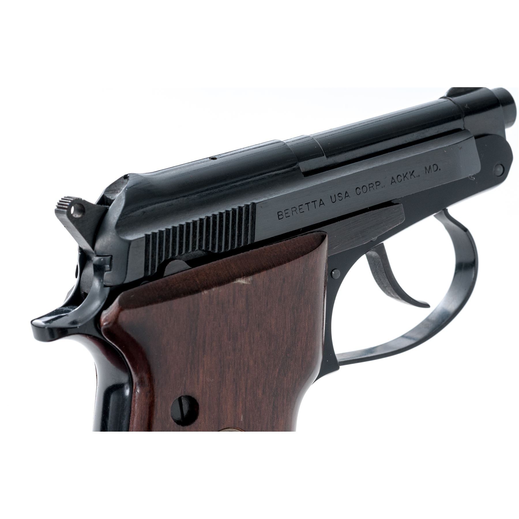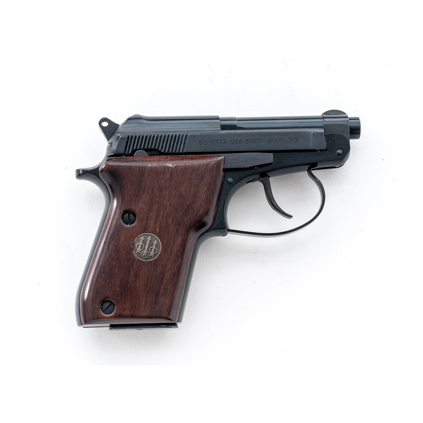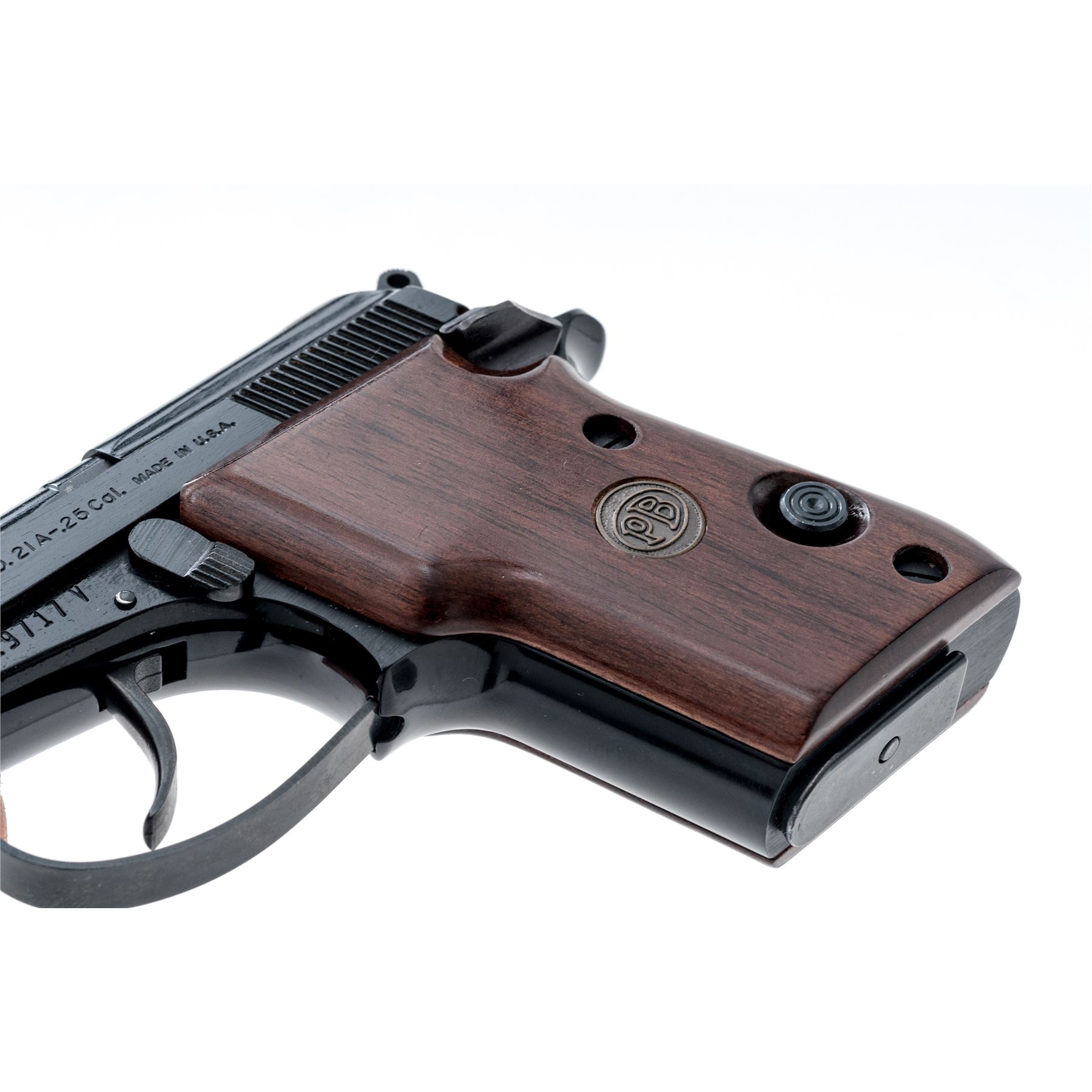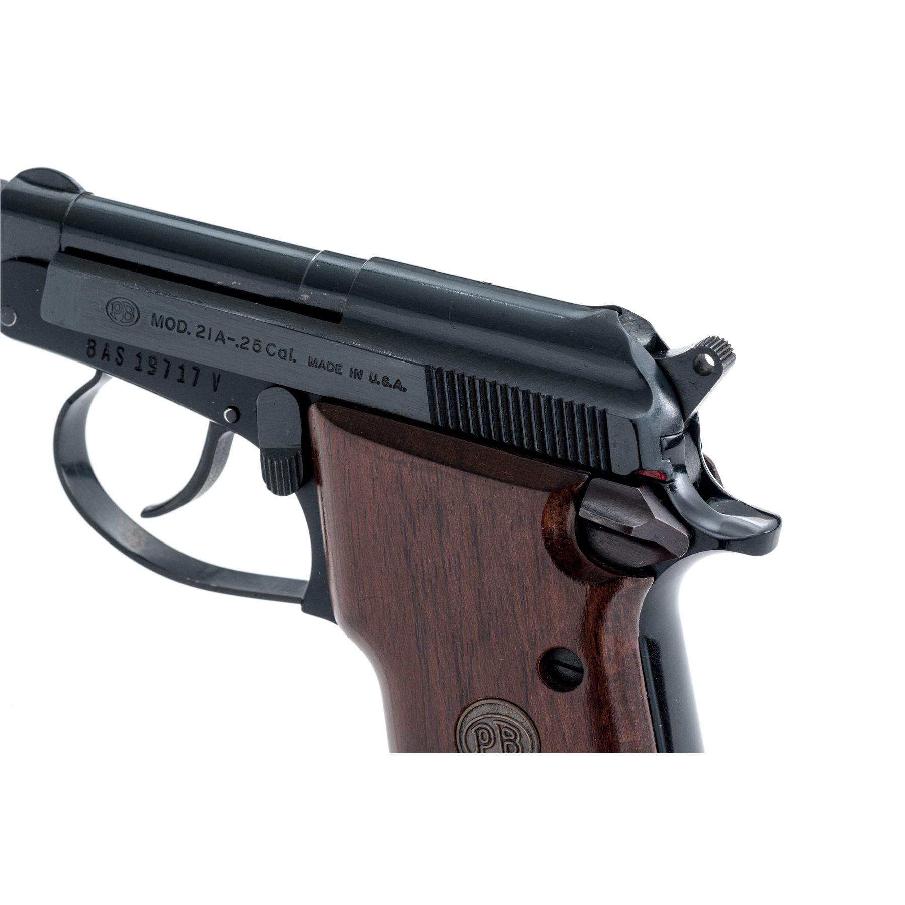 Beretta Model 21A Semi-Automatic Pistol, #BAS19717V, .25 ACP cal., 2.5'' tip-up barrel, alloy frame, blue finish, smooth wood grips with Beretta medallions, standard fixed sights, with one magazine. In original box with matching end label, owner's manual, and cleaning brush. Condition is excellent with approx. 98%+ original blue finish. Right grip with a few shallow surface dents and scratches near the top edge. Action and bore are both excellent. Box shows moderate storage type wear, end label is clear. Est.: $200-$300. (Modern/PPT) (Consecutive to the Next Lot)