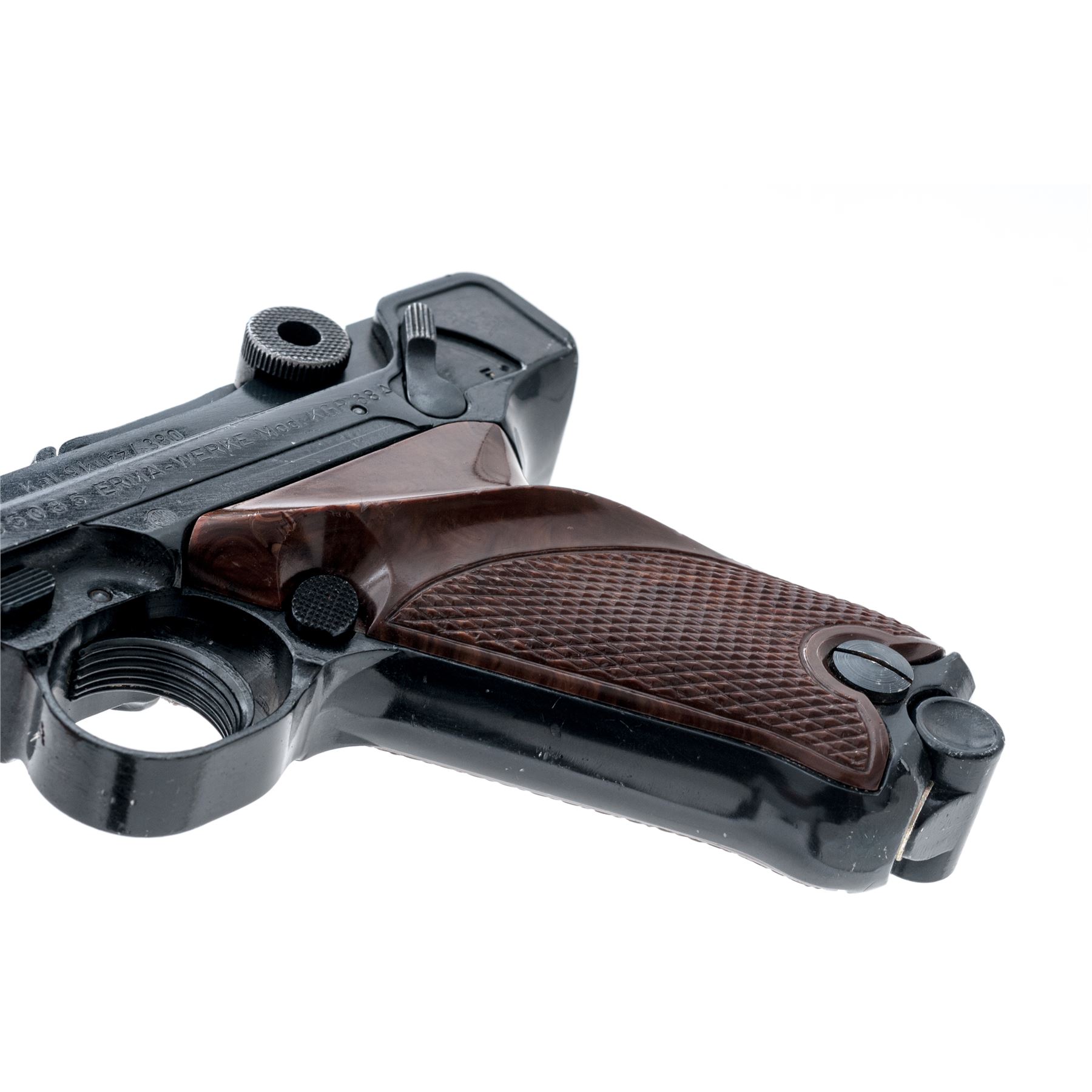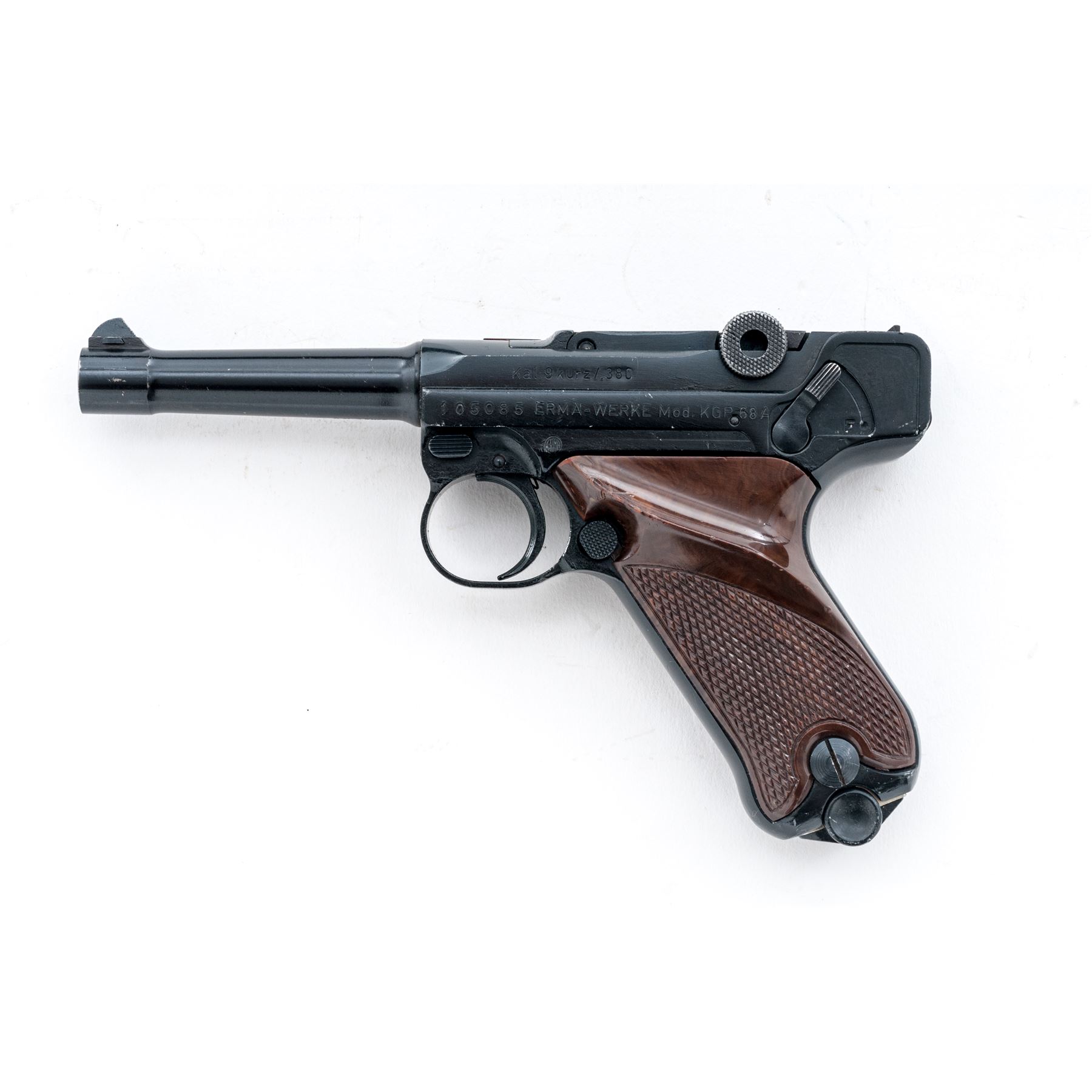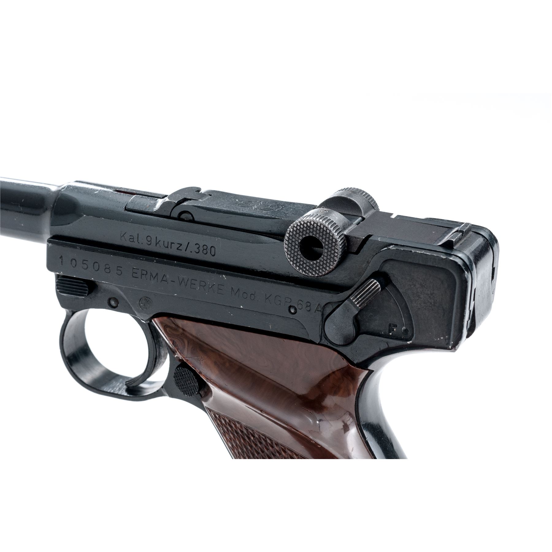 Erma Model KGP68A Semi-Automatic Pistol, #105085, .380 ACP cal., 3.5'' barrel, dark blue finish, factory checkered brown plastic grips, standard markings, standard fixed sights, with one magazine. Made in Germany. Condition overall is very good retaining approx. 96% blue; metal with general small surface nicks and scratches. Grips with tiny impressions along the edge of the thumbrest and are otherwise excellent. Smooth action, bright bore with excellent rifling. Est.: $250-$400. (Modern/PPT)