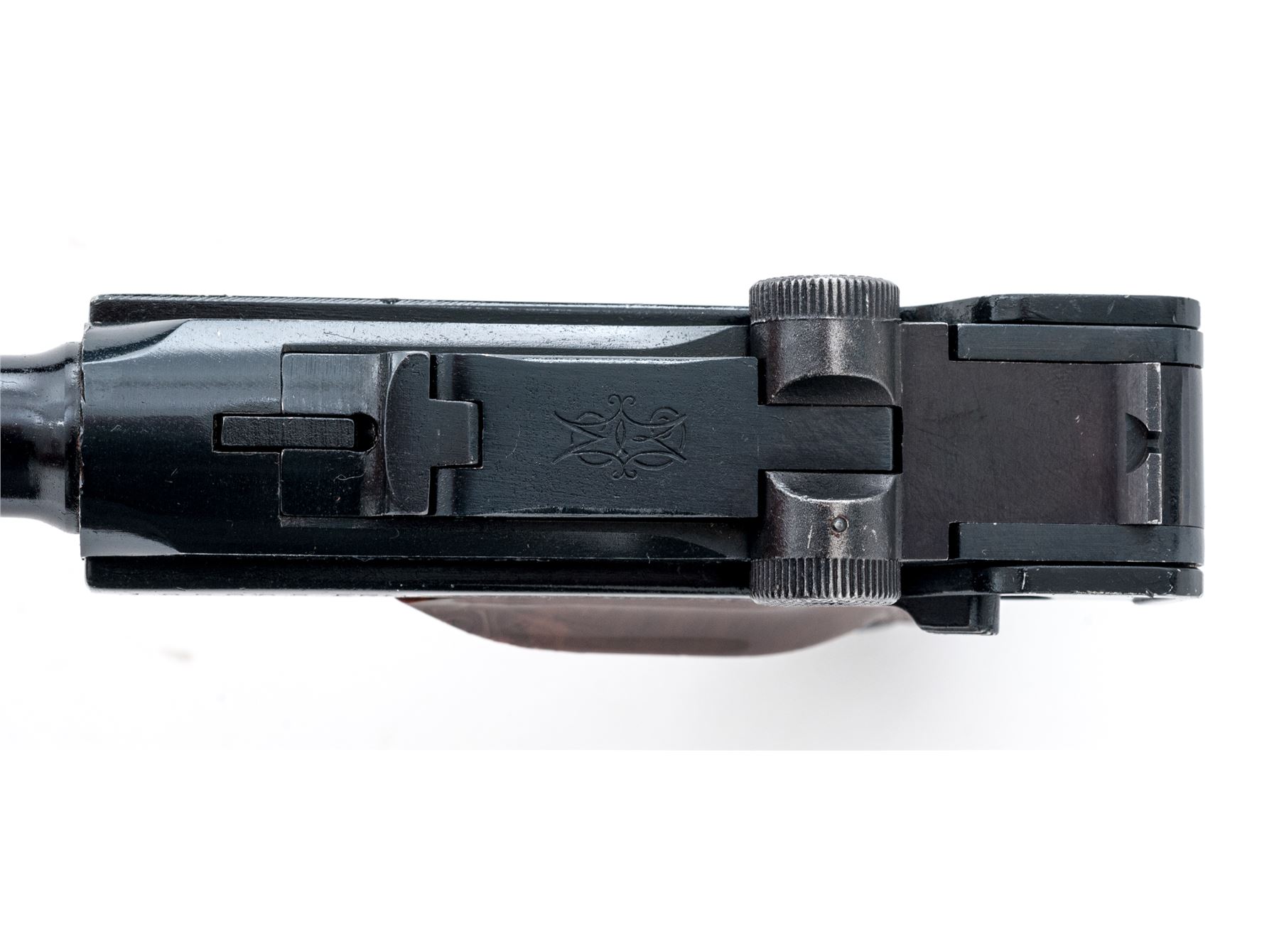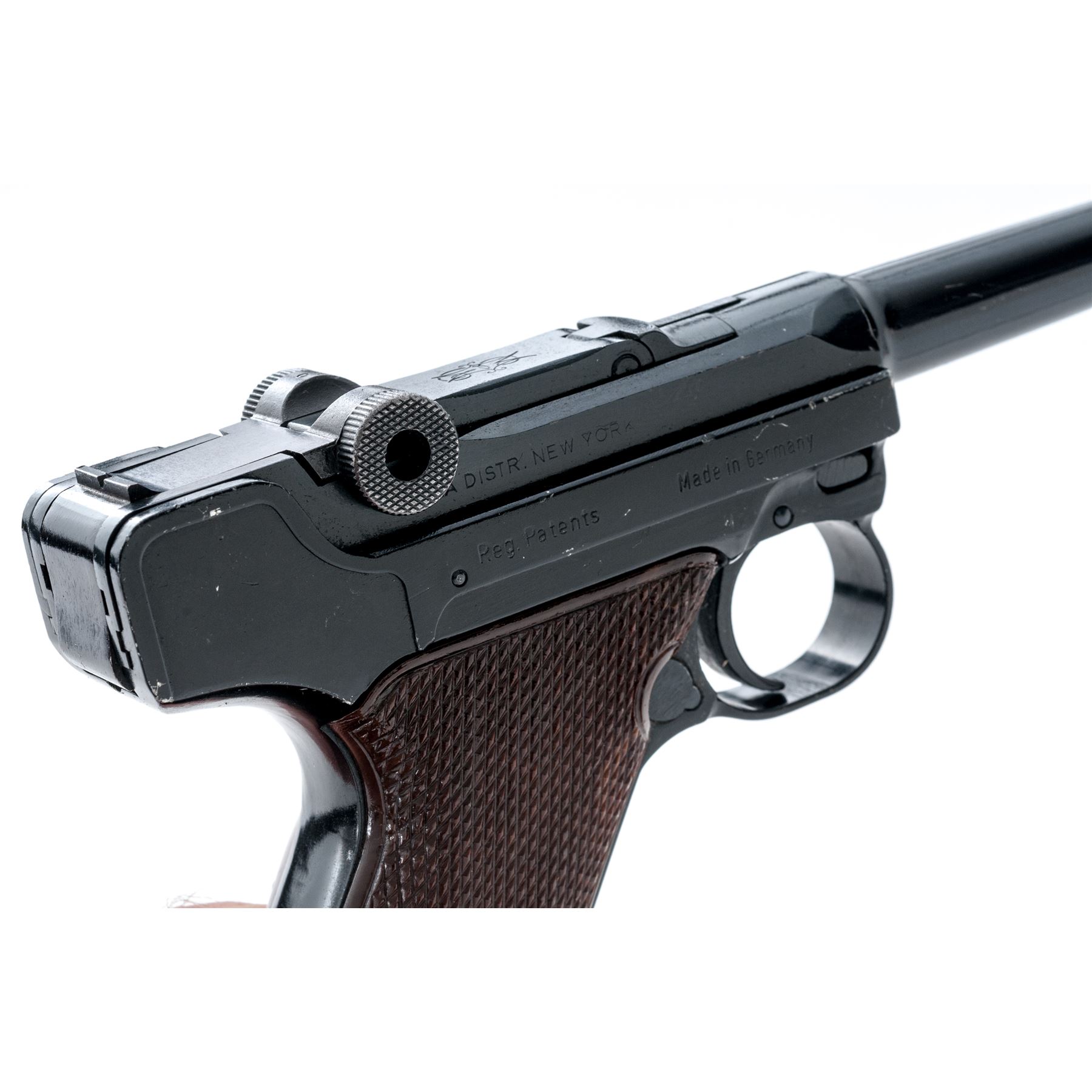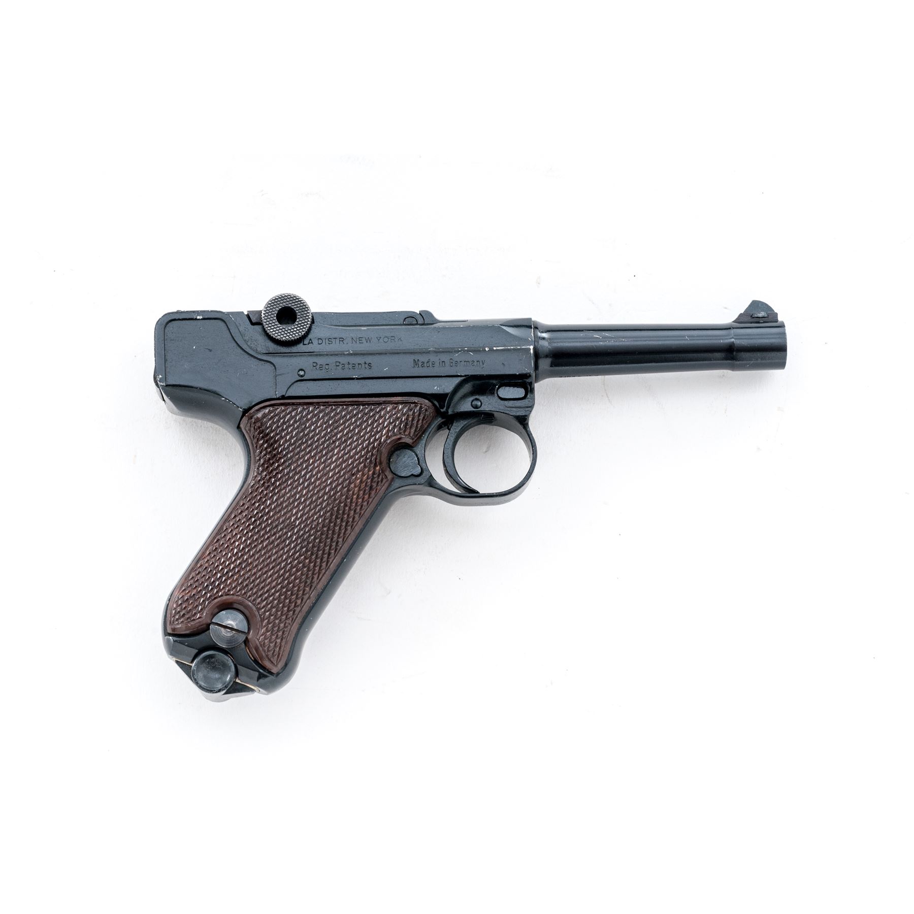 Erma Model KGP68A Semi-Automatic Pistol, #105085, .380 ACP cal., 3.5'' barrel, dark blue finish, factory checkered brown plastic grips, standard markings, standard fixed sights, with one magazine. Made in Germany. Condition overall is very good retaining approx. 96% blue; metal with general small surface nicks and scratches. Grips with tiny impressions along the edge of the thumbrest and are otherwise excellent. Smooth action, bright bore with excellent rifling. Est.: $250-$400. (Modern/PPT)