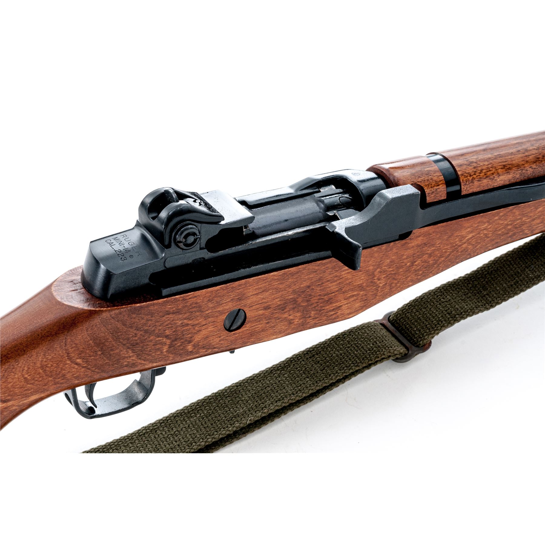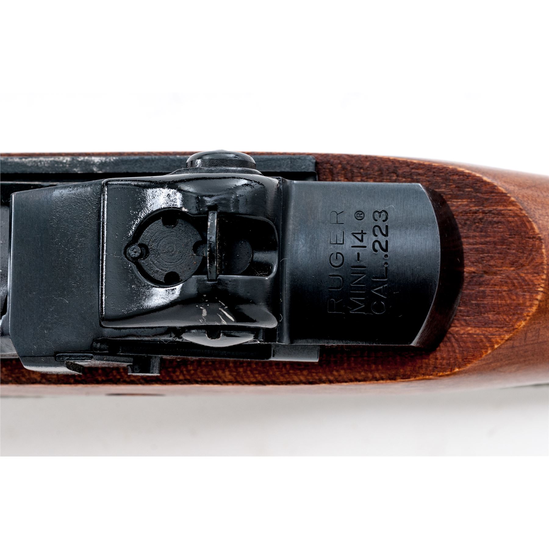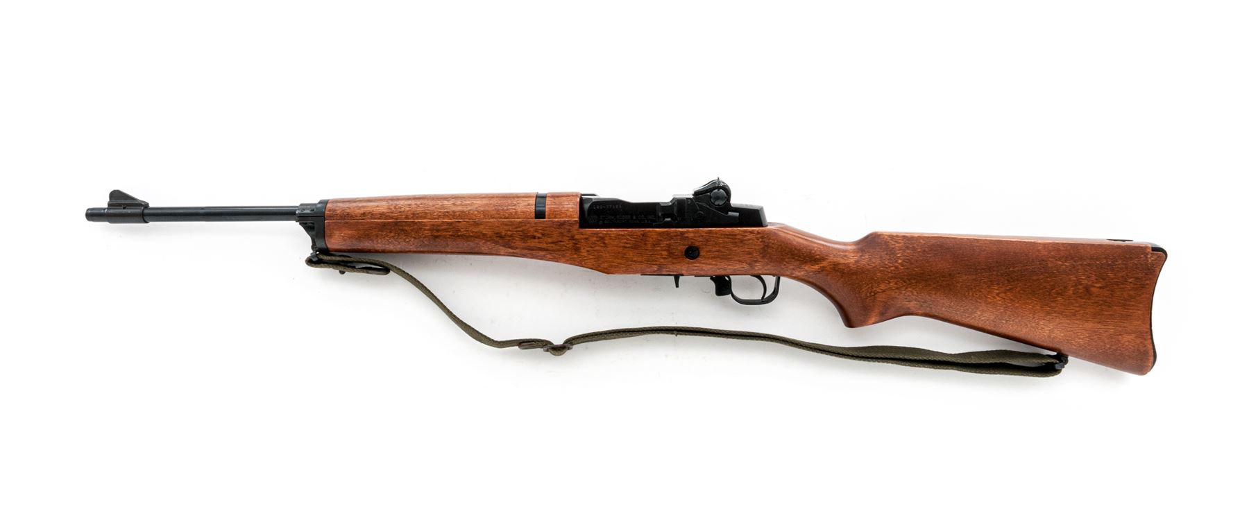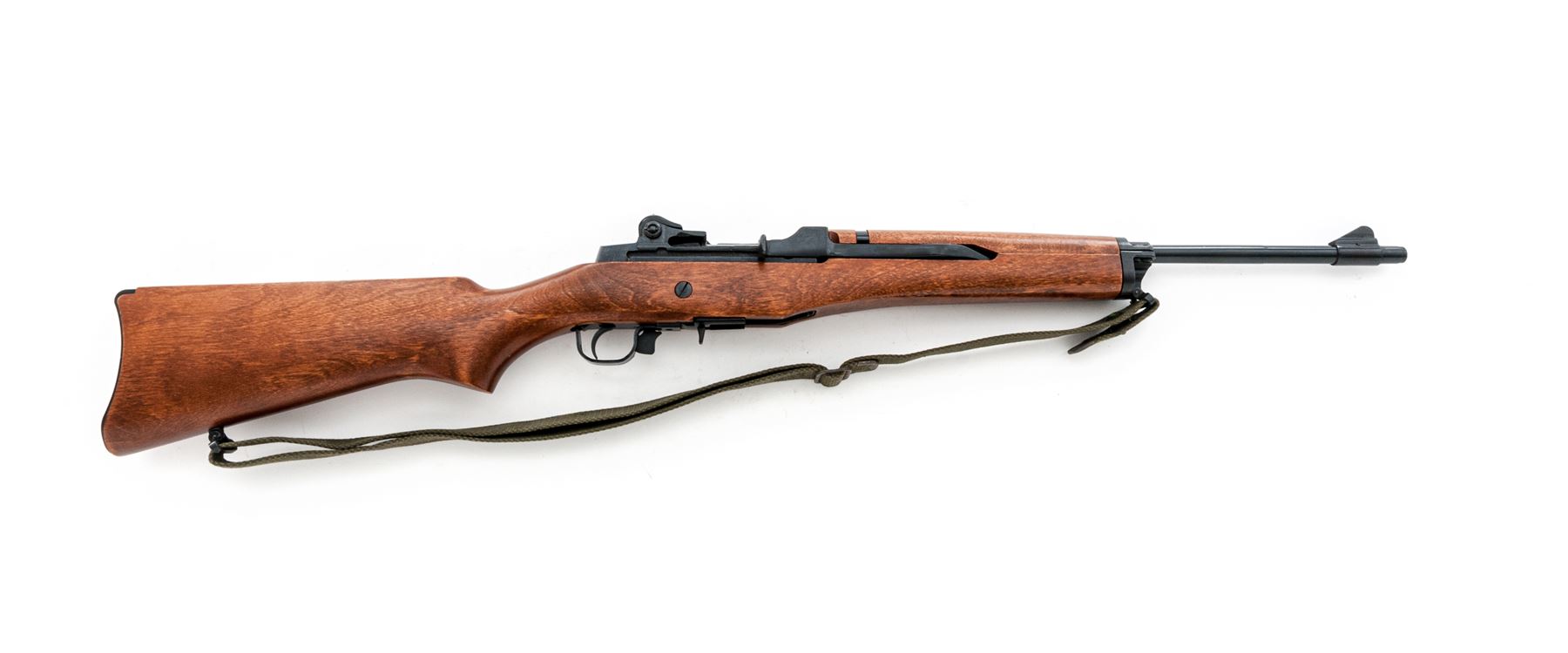 Ruger Mini-14 Semi-Automatic Rifle, #180-77964, .223 cal., 18.5'' barrel, blue finish, factory birch stock and upper handguard with black plastic buttplate, sling swivels, and green canvas sling. Standard sights include a blade front and rear peep sight; no magazine. Metal is near excellent retaining approx. 98% original finish with intermittent light handling marks; rear sight base is scratched on the left side. Stock is very good with moderate shallow impressions and normal handling/range wear; upper handguard with a little more noticeable pressure dent. Smooth action, bright bore with excellent rifling. Est.: $400-$600. (Modern)