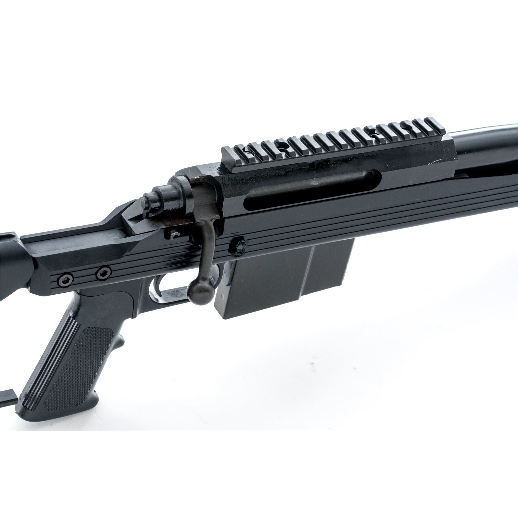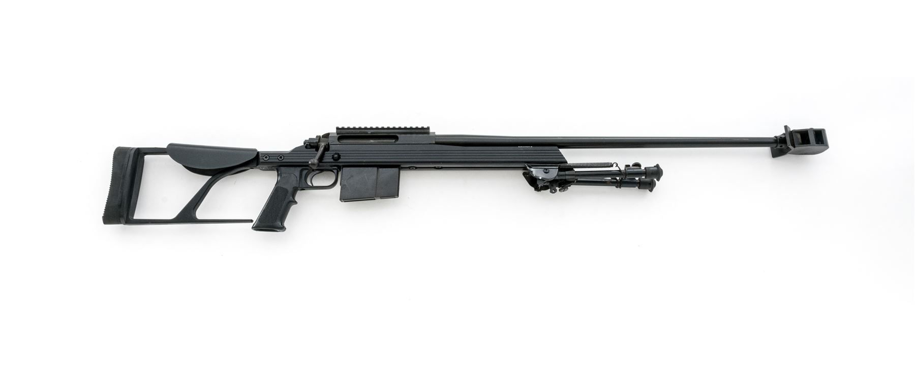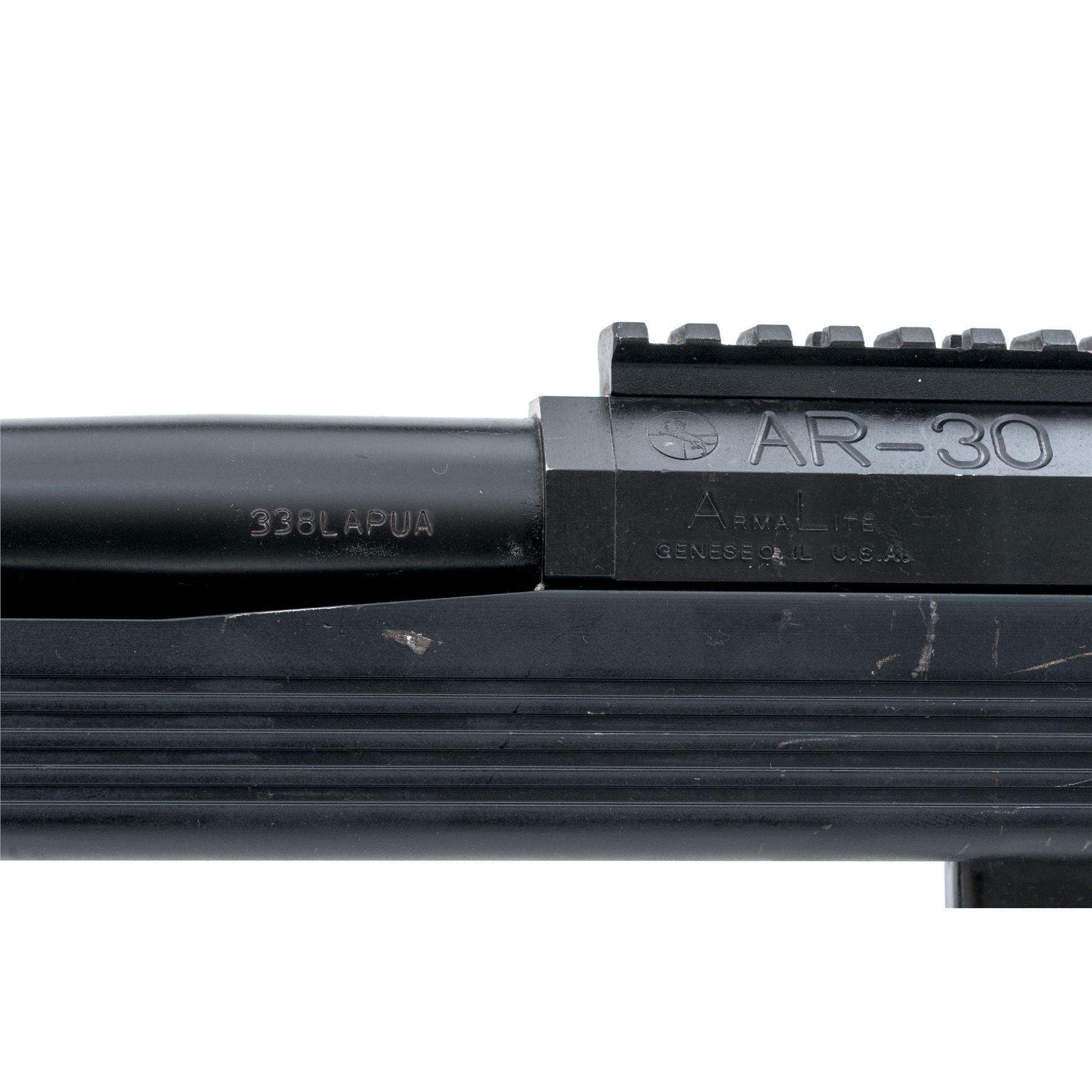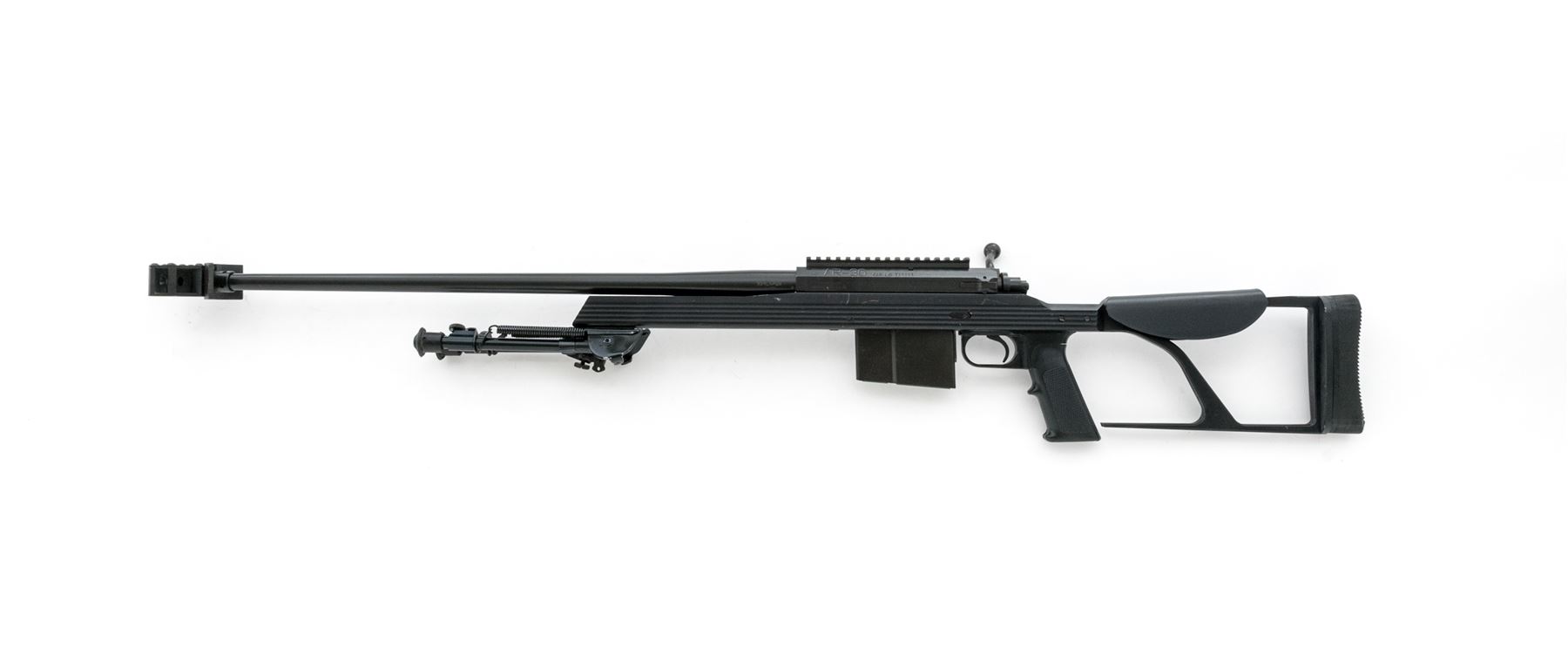Armalite AR-30 Bolt Action Rifle, #210268, .338 Lapua cal., 26'' barrel with muzzle brake, matte black finish, black aluminum stock with skeletonized buttstock, full pistol grip, black rubber recoil pad. Mfg'd without sights, with a receiver mounted 6.5'' scope rail, bi-pod and one magazine. Rifle appears to be in excellent mechanical condition, but the exterior of the rifle shows evidence of poor storage. Metal with several scuffs and scratches, as well as a few spots of surface rust. Thorough cleaning should improve the overall condition to very good. All of the factory lettering is visible and clear. Action is smooth, bore is bright with sharp rifling. Est.: $900-$1,400. (Modern)