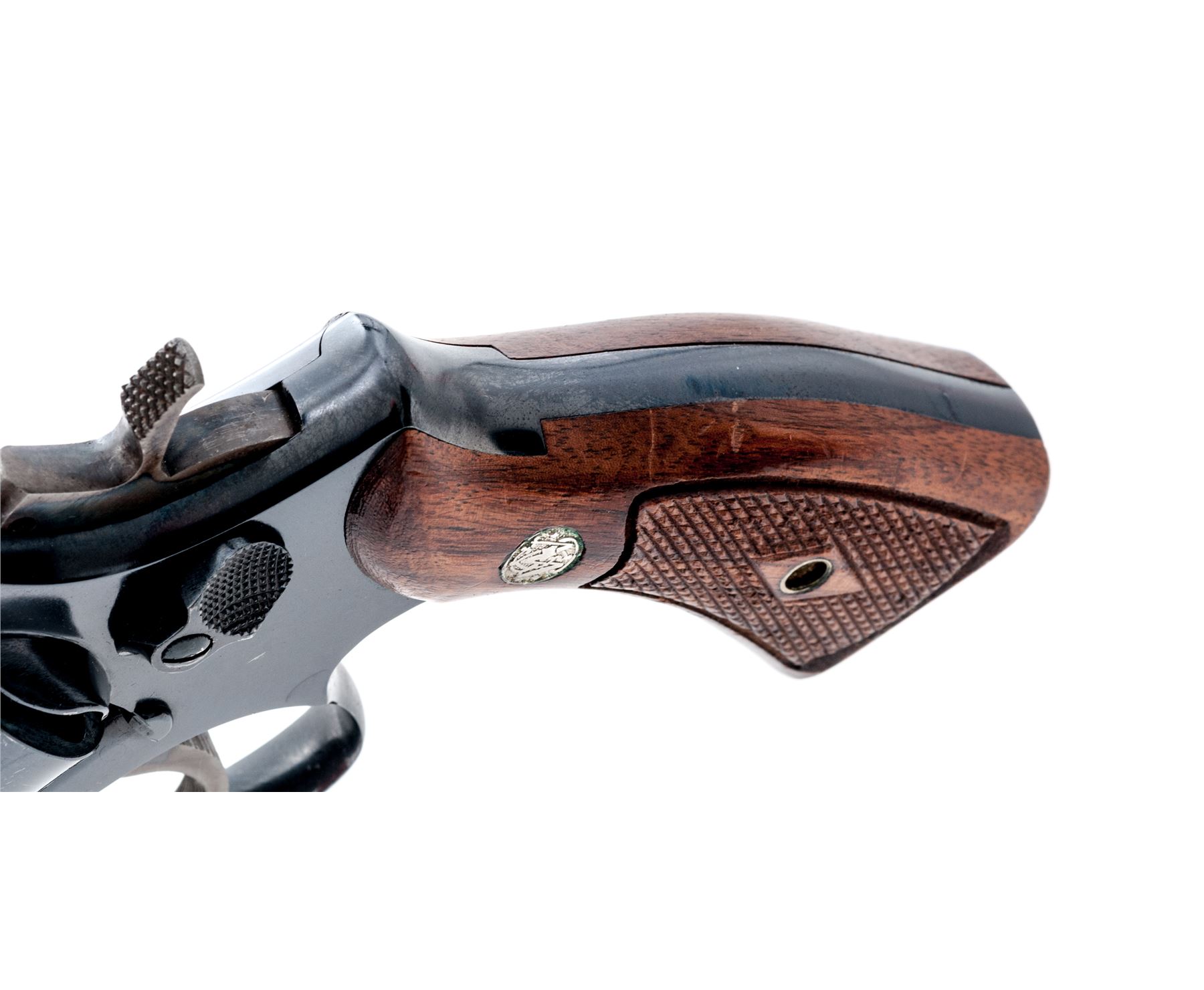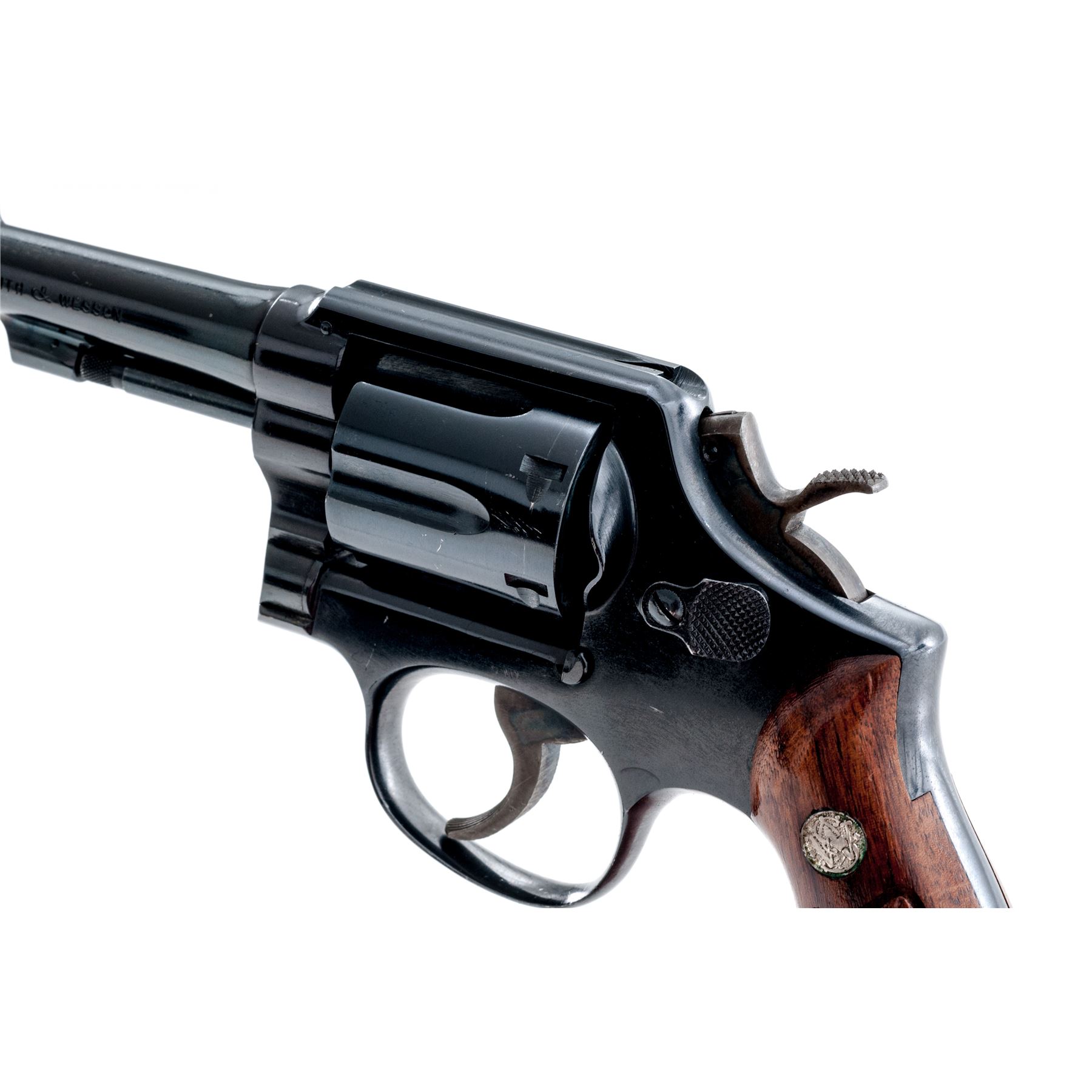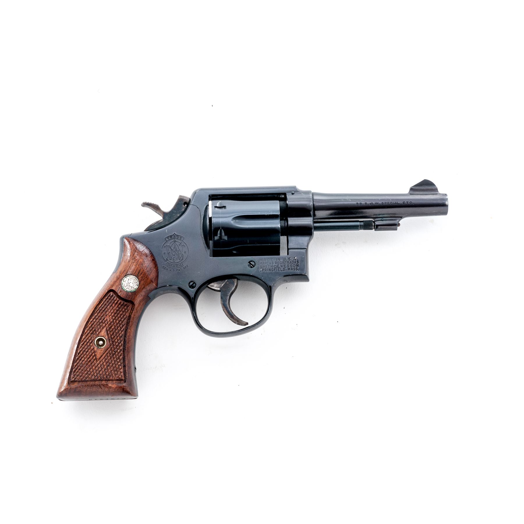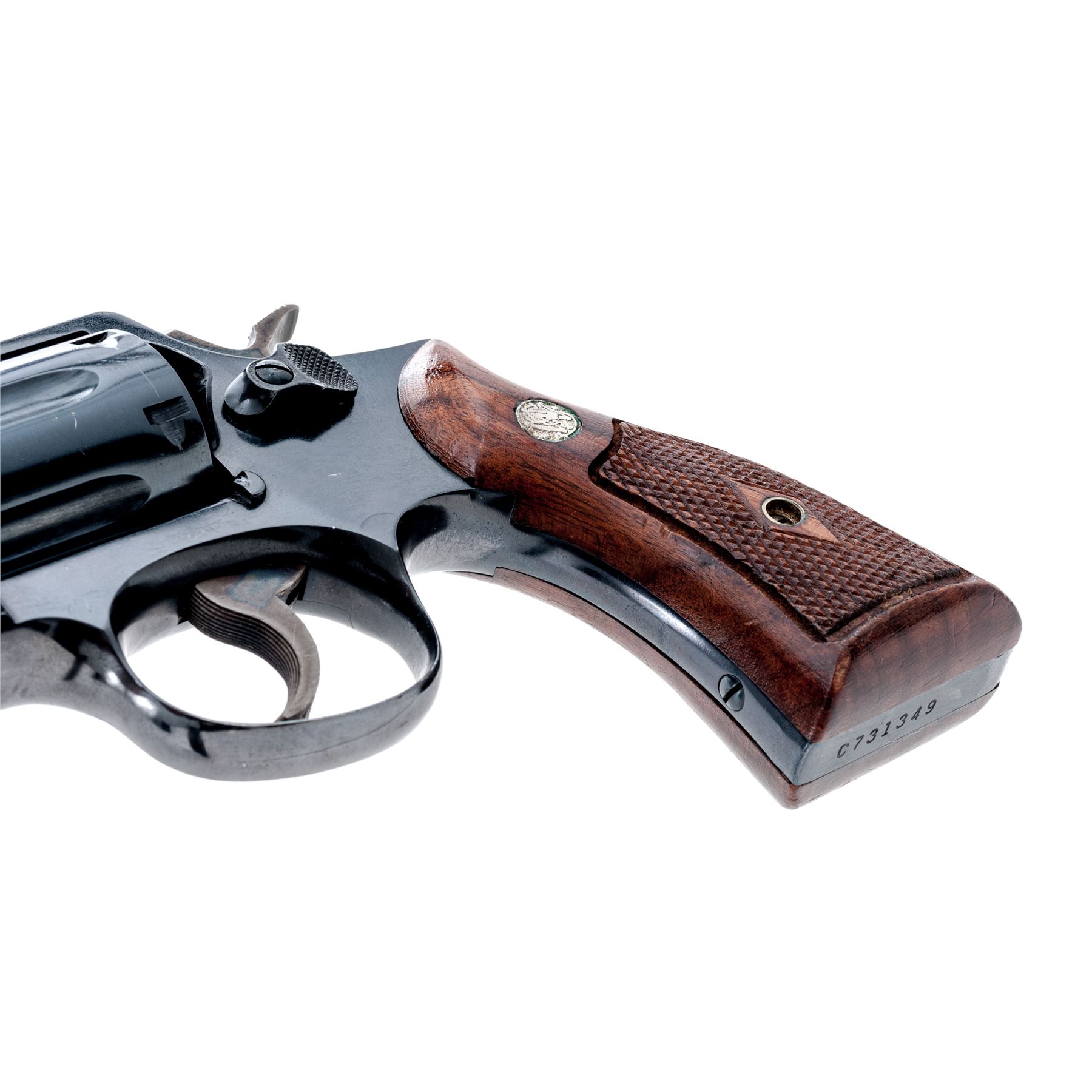 Smith & Wesson Model 10-5 Double Action Revolver, #C731349, .38 Spec. cal., 4'' pinned barrel, dark blue finish; factory checkered walnut Magna grips with diamond center and S&W medallions, grips are numbered to the gun. Color case hardened checkered hammer and serrated trigger, standard fixed sights include a ramped front and square-notched rear. Mfg'd circa 1963-1965. Condition is very good retaining approx. 95% original blue, muzzle wear and general light scratching accounts for most of the finish loss; highest volume of scratches are visible on the cylinder and right side of the barrel; cylinder with a thin index line. Factory lettering is crisp and clear. Grips retain most of their original finish with scattered impressions and handling marks; left grip checkering is excellent, right grip with a spot of mild flattening. Hammer and trigger with approx. 97% rich case colors. Smooth action, bright near excellent bore. Est.: $250-$400. (C&R/PPT)