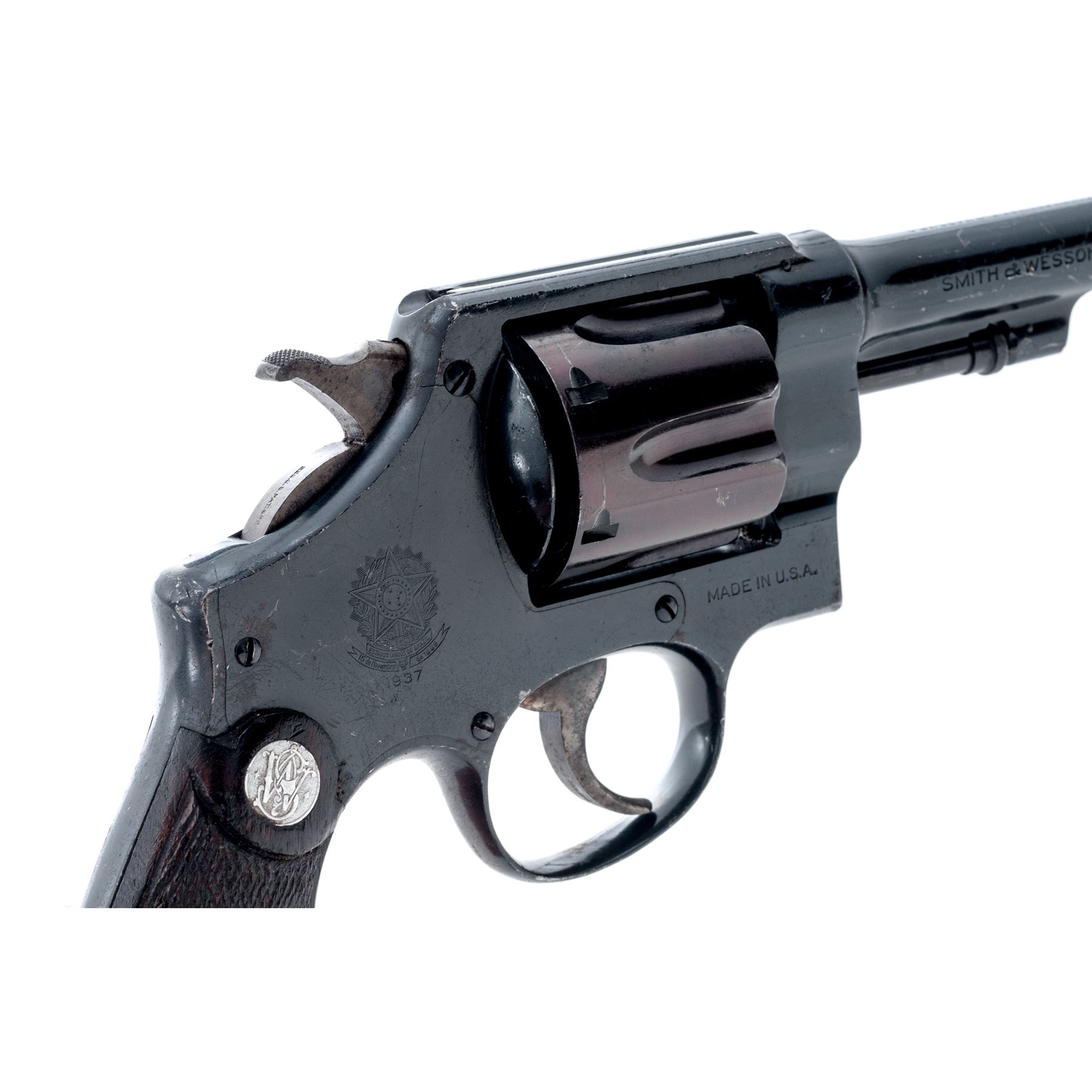 Smith & Wesson Commercial Model 1917 Double Action Revolver, #188419, .45 ACP cal., 5.5'' barrel, blue finish, earlier diamond checkered walnut grips with bright S&W medallions; lanyard loop in butt, sideplate with Brazilian crest (1937). Condition is very good as refinished and importer marked, retaining approx. 92% later added blue finish. Grips with moderate to near heavy wear. Matching numbered cylinder is a slightly more plum finish. Good action, fine bore. Est.: $300-$500. (C&R/PPT)