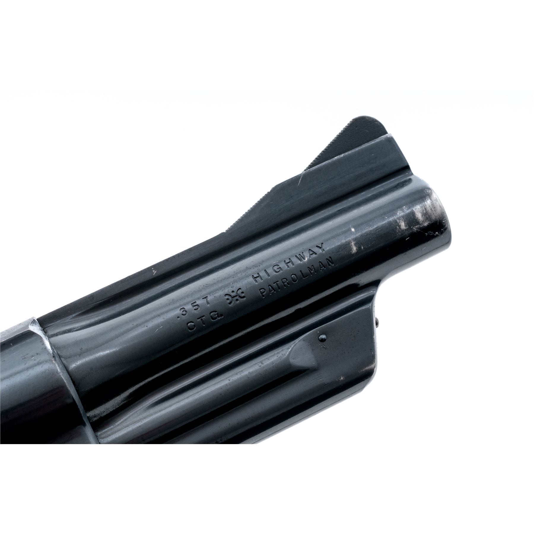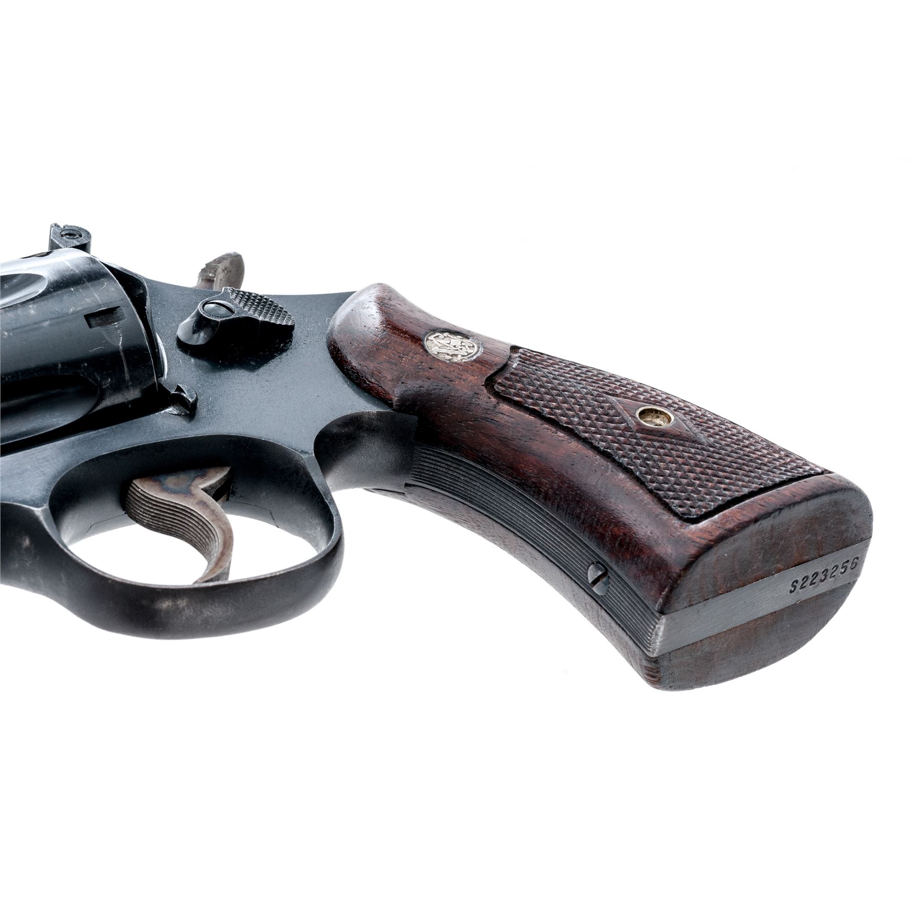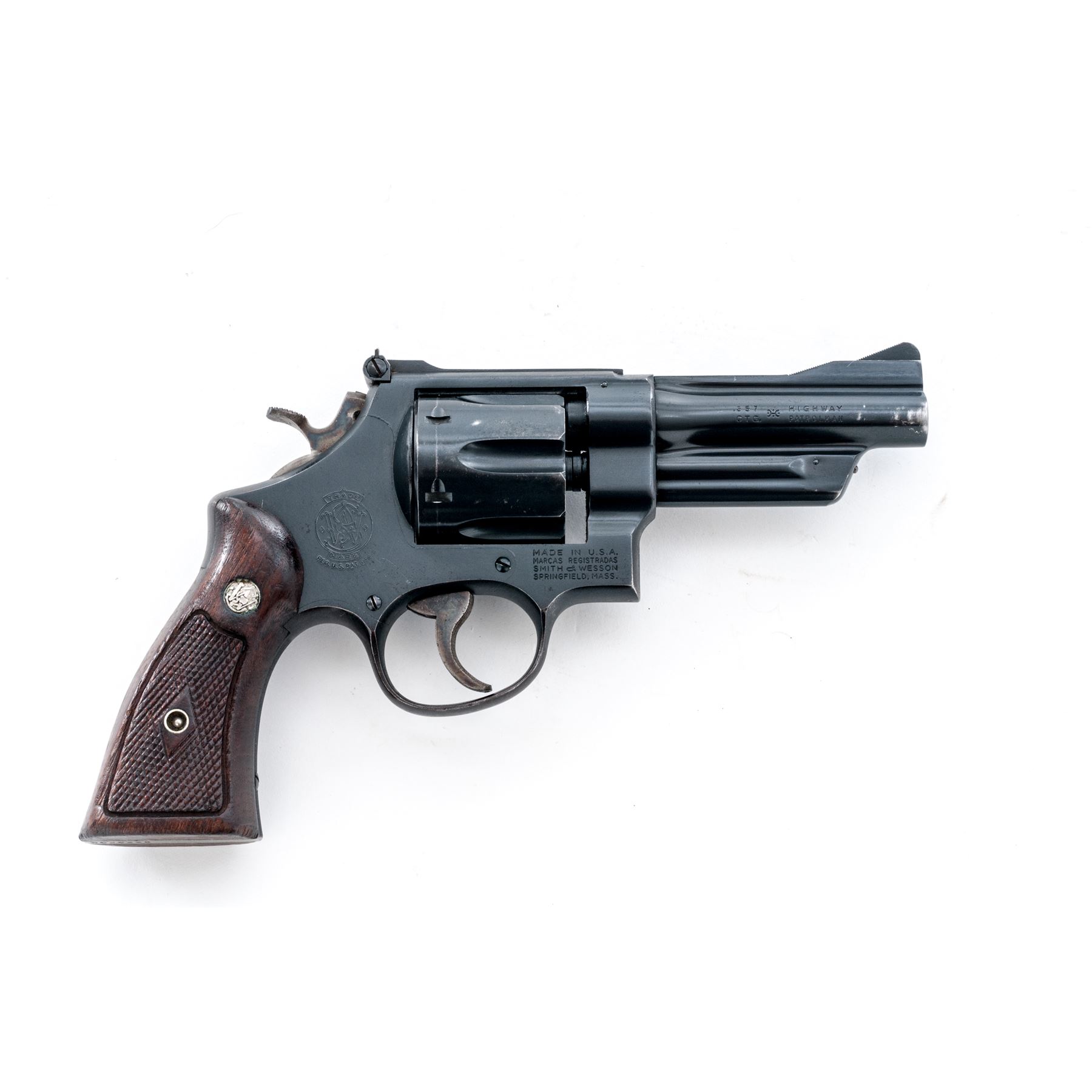 Smith & Wesson Model 28-2 Highway Patrolman Double Action Revolver, #S223256, .357 mag. cal., 4'' pinned barrel, satin blue finish; factory checkered diamond center walnut grips are numbered to the gun. Sights include a Baughman quick-draw front sight and fully adjustable rear sight, with case hardened semi-target hammer and serrated trigger. Mfg'd ca. 1961-1962. Approx. 93% factory blue finish remains and the overall condition is very good. Finish on the triggerguard, front and backstrap have toned light brown. Cylinder with a moderate index line. Factory lettering is clear and defined. Screw heads are straight. Approx. 90% mostly bright case colors remain with a little fading to the left side of the trigger. Grips show moderate age and wear consistent with the rest of the revolver, including scattered shallow handling marks and mild darkening to their original finish. Crisp action; bright bore rates near excellent. Est.: $500-$700. (C&R)