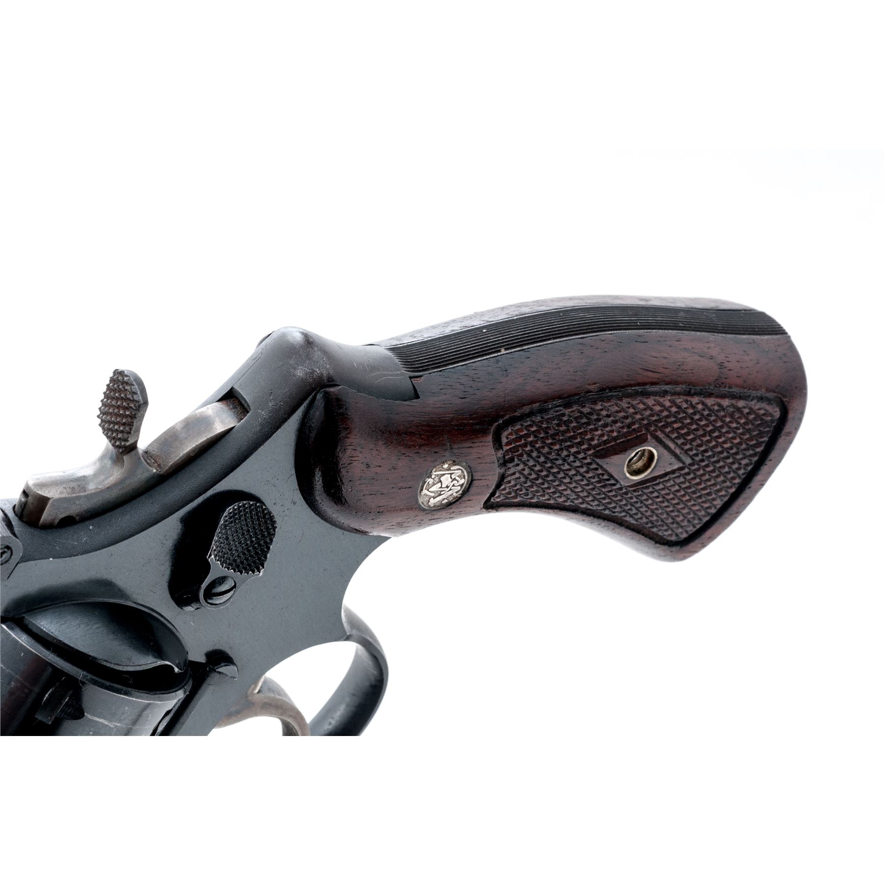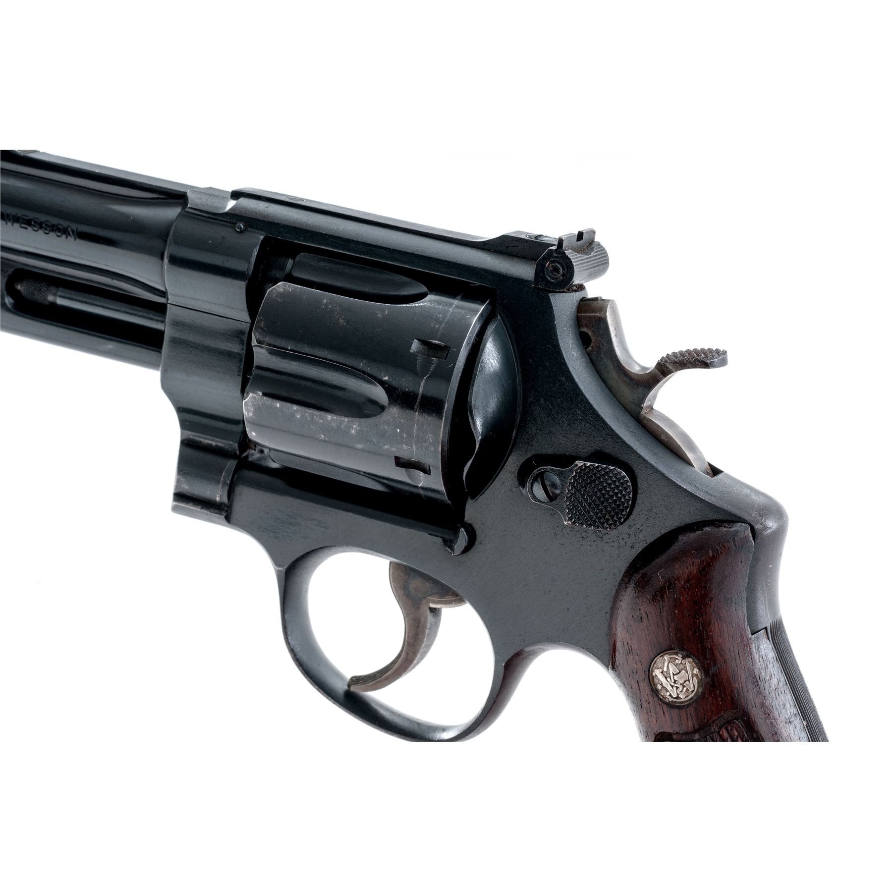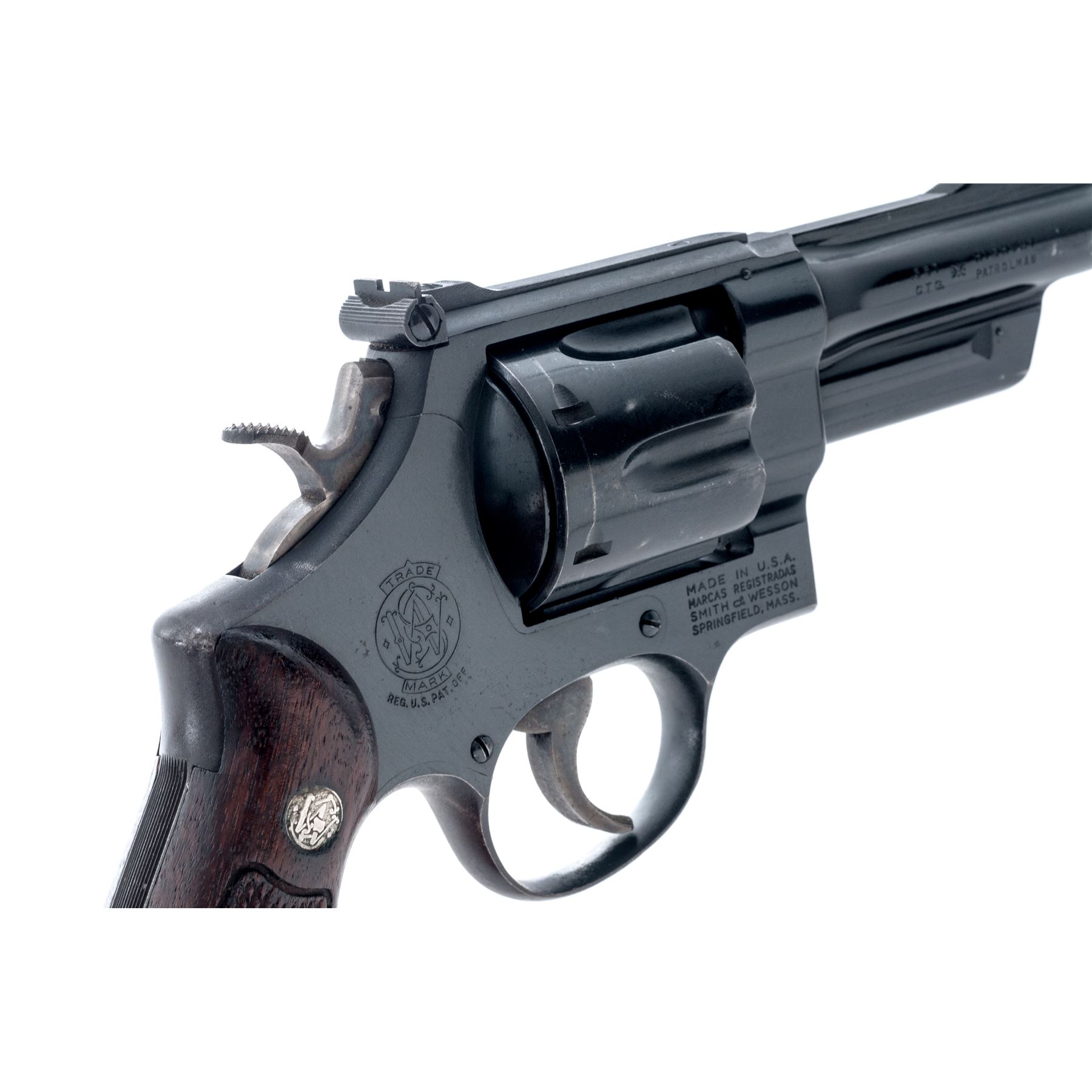 Smith & Wesson Model 28-2 Highway Patrolman Double Action Revolver, #S223256, .357 mag. cal., 4'' pinned barrel, satin blue finish; factory checkered diamond center walnut grips are numbered to the gun. Sights include a Baughman quick-draw front sight and fully adjustable rear sight, with case hardened semi-target hammer and serrated trigger. Mfg'd ca. 1961-1962. Approx. 93% factory blue finish remains and the overall condition is very good. Finish on the triggerguard, front and backstrap have toned light brown. Cylinder with a moderate index line. Factory lettering is clear and defined. Screw heads are straight. Approx. 90% mostly bright case colors remain with a little fading to the left side of the trigger. Grips show moderate age and wear consistent with the rest of the revolver, including scattered shallow handling marks and mild darkening to their original finish. Crisp action; bright bore rates near excellent. Est.: $500-$700. (C&R)