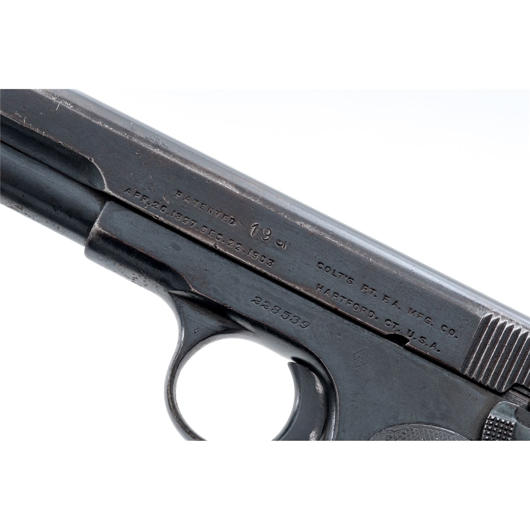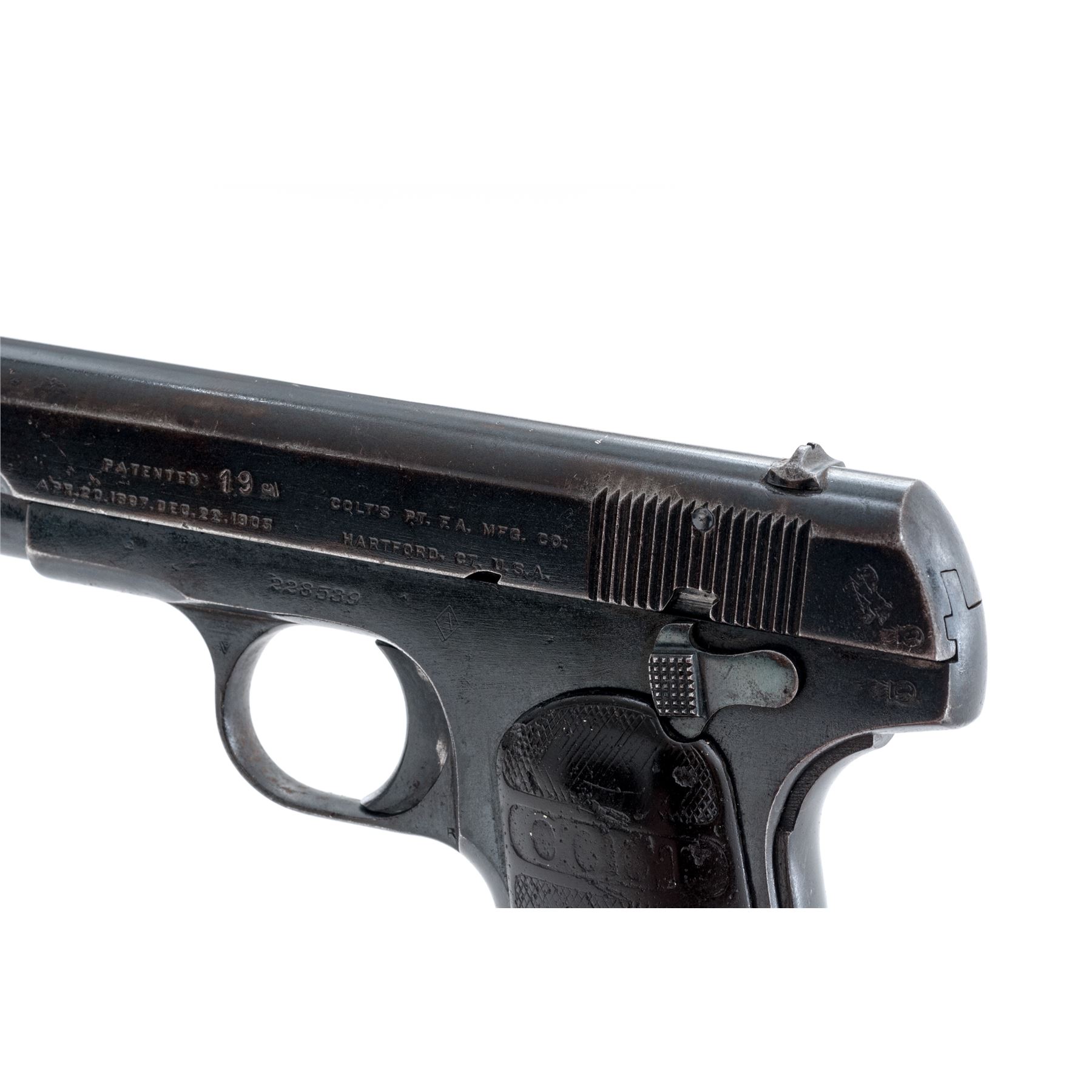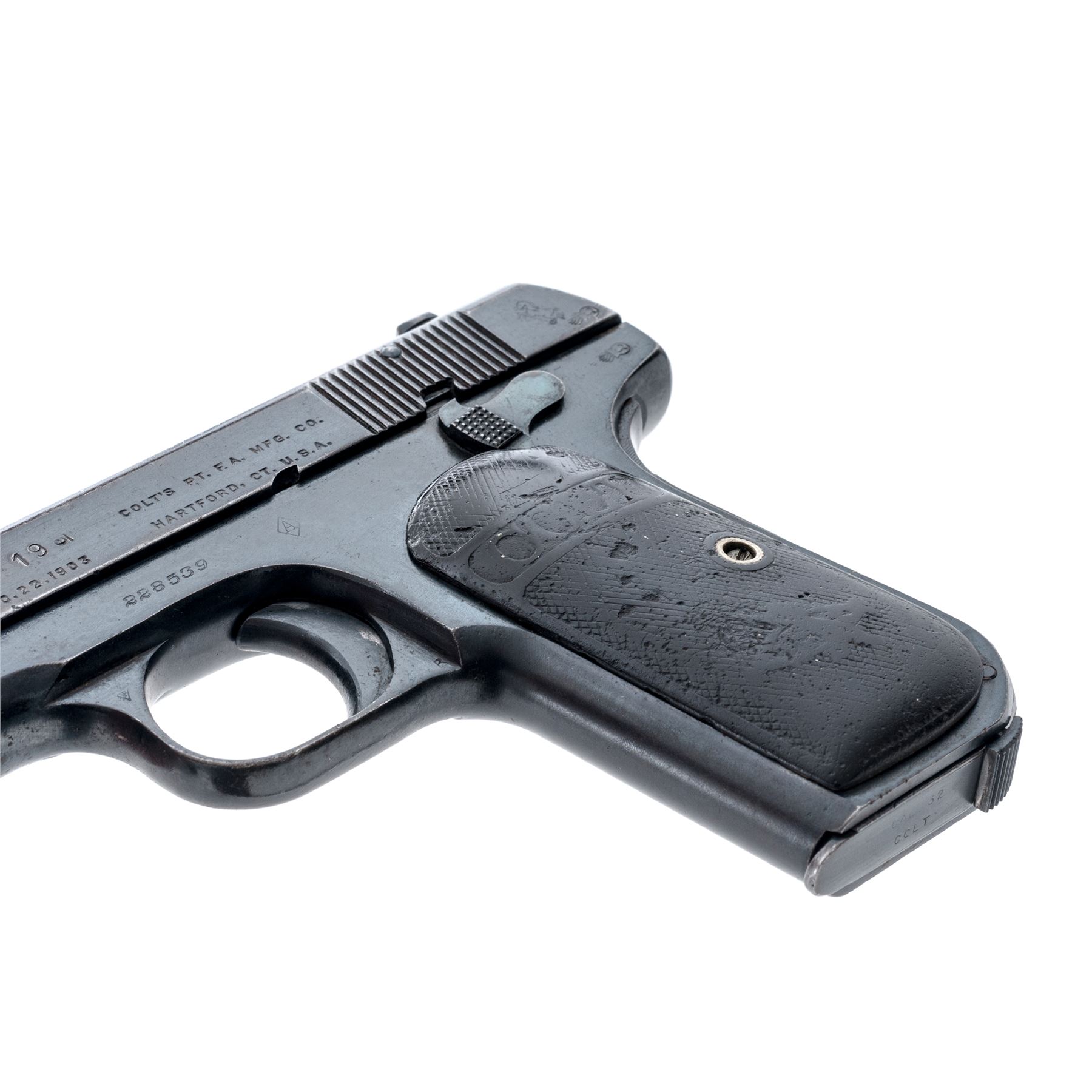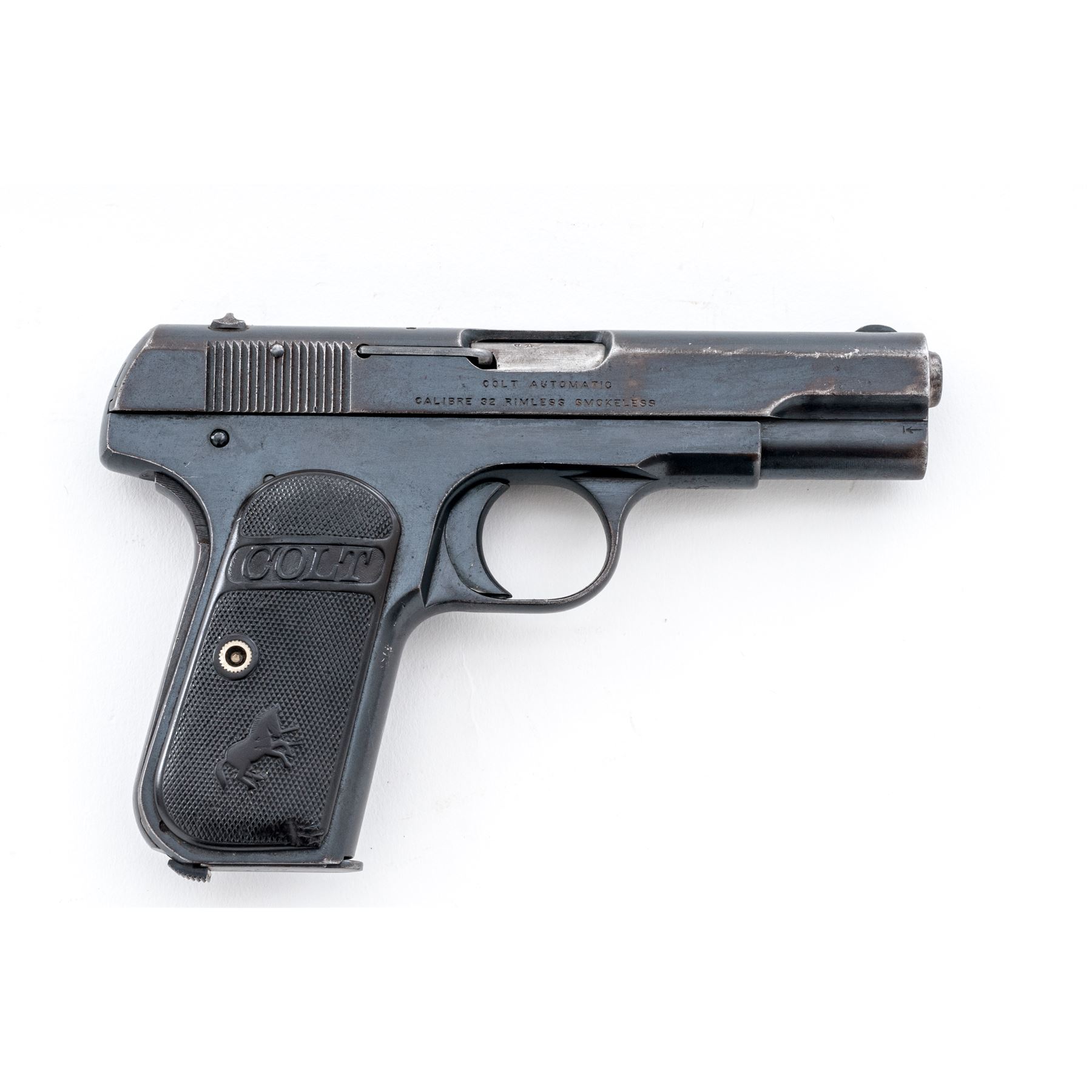 Belgian Contract Colt Model 1903 Pocket Hammerless Semi-Automatic Pistol, #228539, .32 ACP cal., 3.75'' barrel, blue finish, factory checkered hard rubber grips, with one factory ''.32 Cal.'' marked magazine. Belgian proofmarks to frame, slide and barrel. Frame marked just behind serial number with diamond ''A'' acceptance mark, and an additional mark ''19'' to left side of slide. Shipped to the Belgian government in very late 1916 or early 1917. Mfg'd 1916. Condition is very good as refinished, retaining approx. 85% of a moderate quality arsenal type blue. Grips with heavy wear. Good action and very good bore. An interesting Pocket Hammerless variation that often saw service in both wars. Est.: $500-$750. (C&R/PPT)