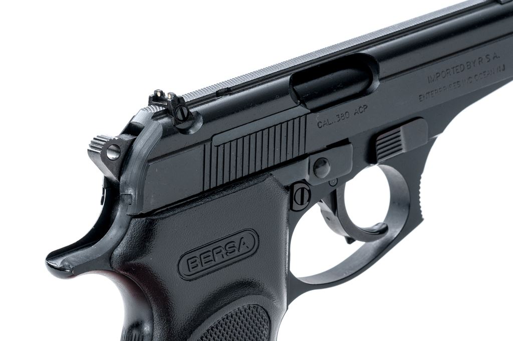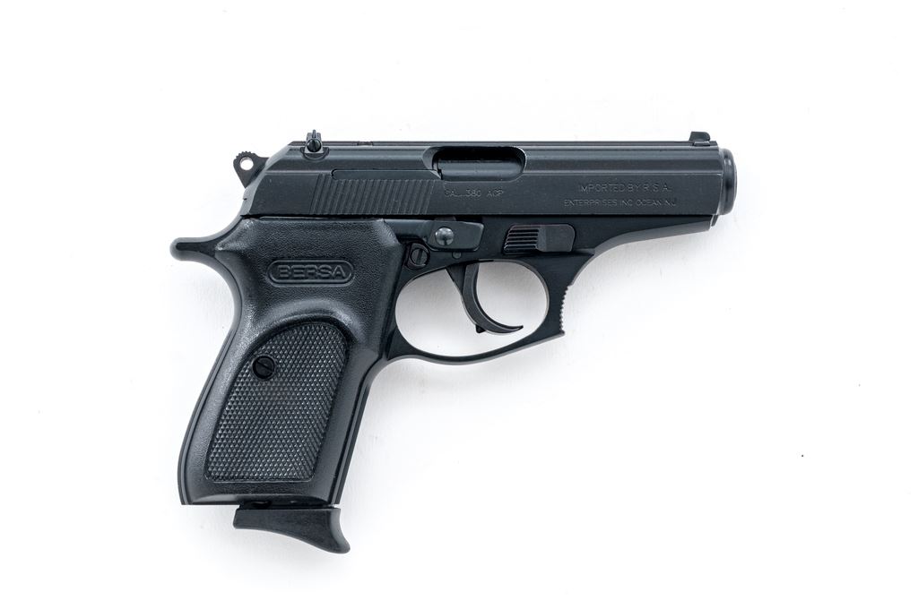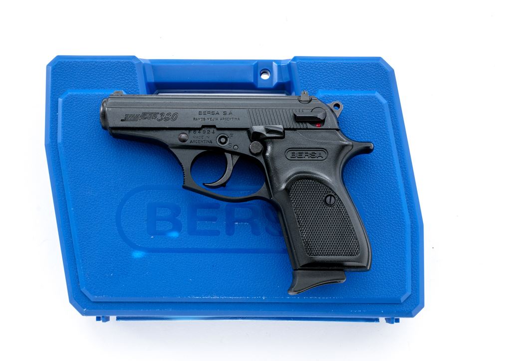 Bersa Thunder 380 Semi-Automatic Pistol, #F64924, .380 ACP cal., 3.5'' barrel, matte/satin dark blue/black finish, factory checkered black plastic grips with slight thumbrest, white 3-dot sights; including a windage adjustable rear sight. Includes one factory 7-shot magazine with black plastic finger extension, original blue plastic case with matching end label, owner's manual, spent test shell, and sealed safety key. Pistol is in excellent overall condition. Metal shows only a few minor marks from handling. Action is smooth; bore is bright with a few shallow marks along the top portion (could have come from the factory this way as it appears to have been handled and fired very little). Est.: $200-$300. (Modern) (Not available to Calif. residents.)