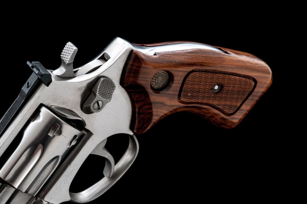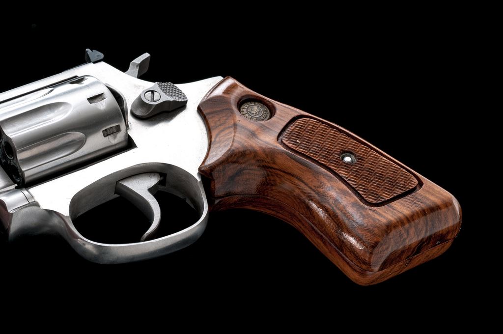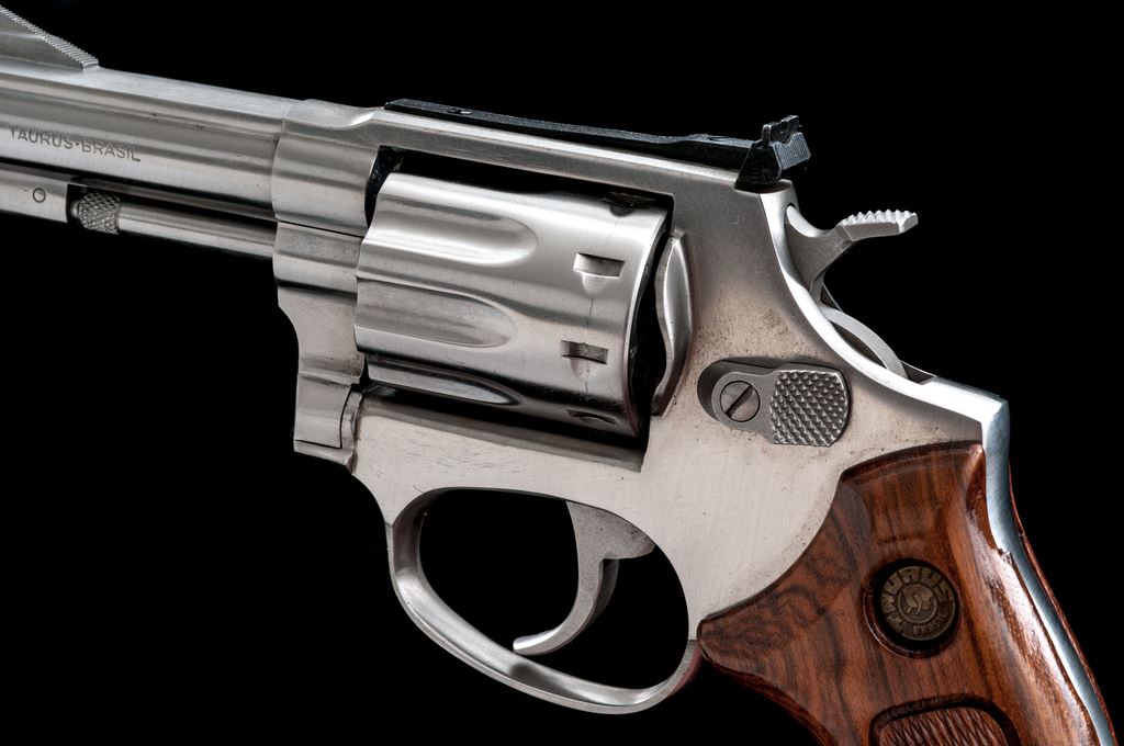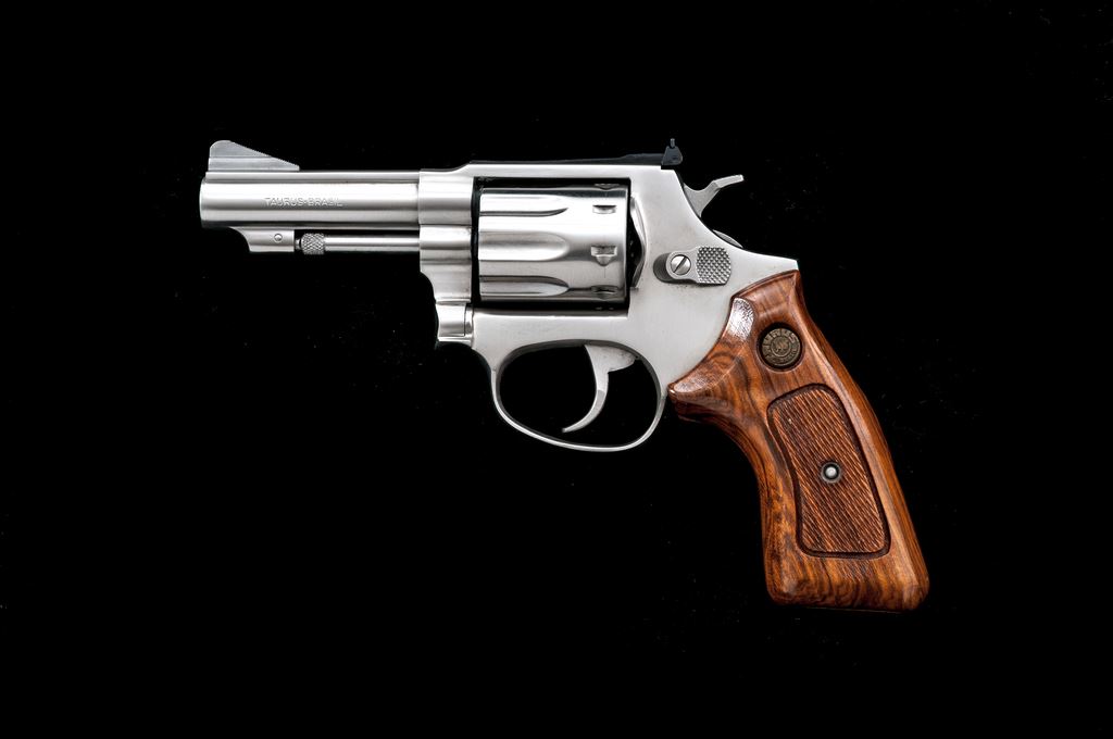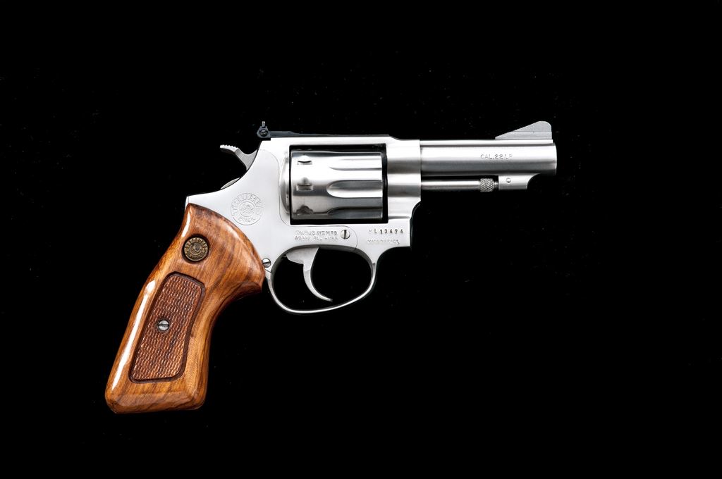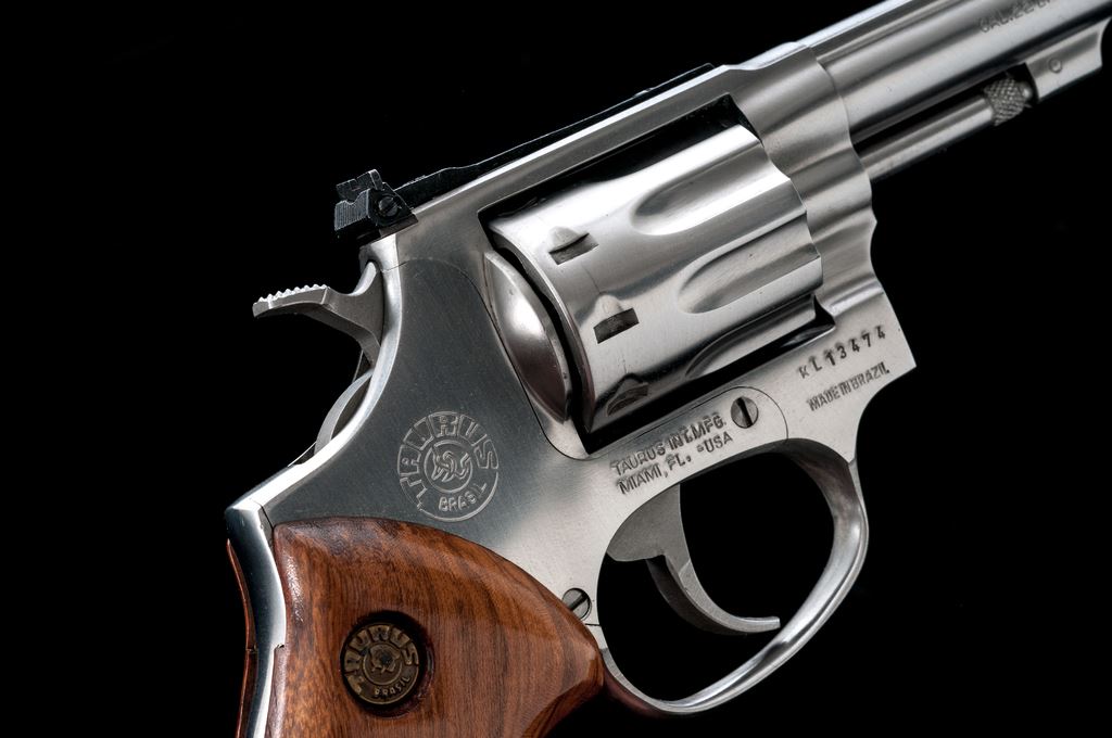 Taurus Model 94 Double Action Revolver, #KL13474, .22 LR cal., 9-shot, 3'' barrel, satin stainless, factory checkered hardwood grips with Taurus medallions, ramp front sight and square-notched fully adjustable rear sight. Condition is excellent showing intermittent light handling marks to the grips and metal; cylinder with light index line. Crisp action, clean bore with excellent rifling. Est.: $200-$300. (Modern/PPT)
