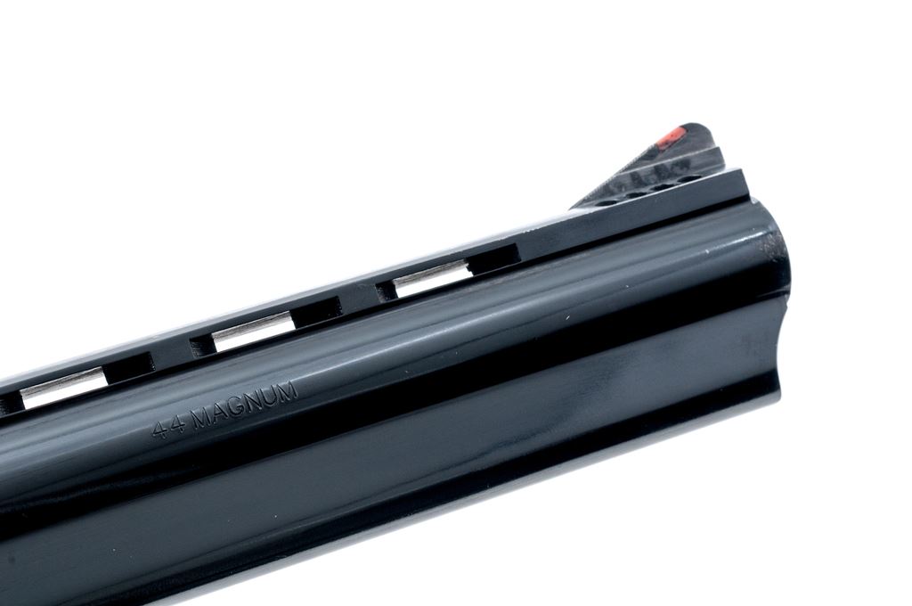 Taurus Model 44 Double Action Revolver, #OF289484, .44 Mag. cal., 8-3/8'' ported vent rib barrel, dark blue finish, stippled and finger grooved black rubber Taurus grips, red ramp front sight, fully adjustable white-outline rear sight, with a color case hardened hammer and trigger. Condition overall is very good retaining approx. 97% original blue finish, scratches to the left side of the barrel lug and right side muzzle account for a majority of the finish loss; cylinder with a light, thin index line. The serrations on the barrel rib with a few spots of light surface rust that would improve with a thorough cleaning. Hammer and trigger retain nearly all of their bright case colors. Grips show normal light handling marks. Cylinder with a little play, hammer and trigger operate smoothly; chambers are bright, bore with powder fouling and debris, is in need of a really good cleaning, rifling is fine. Est.: $300-$400. (Modern/PPT)