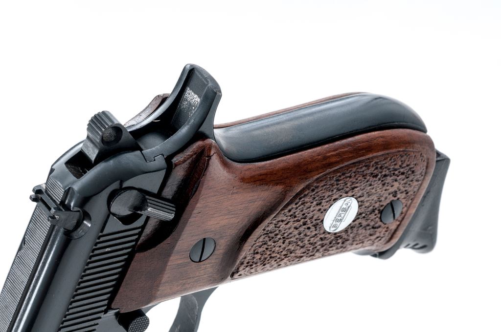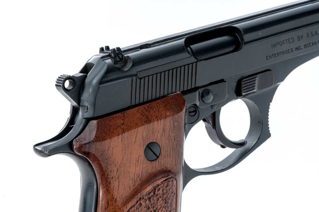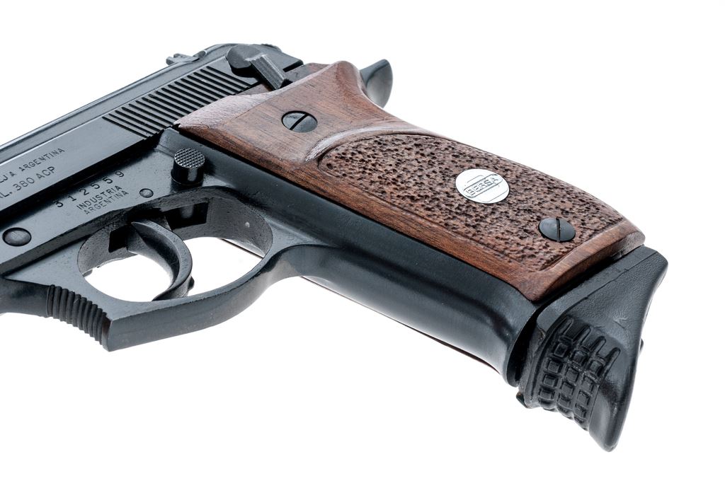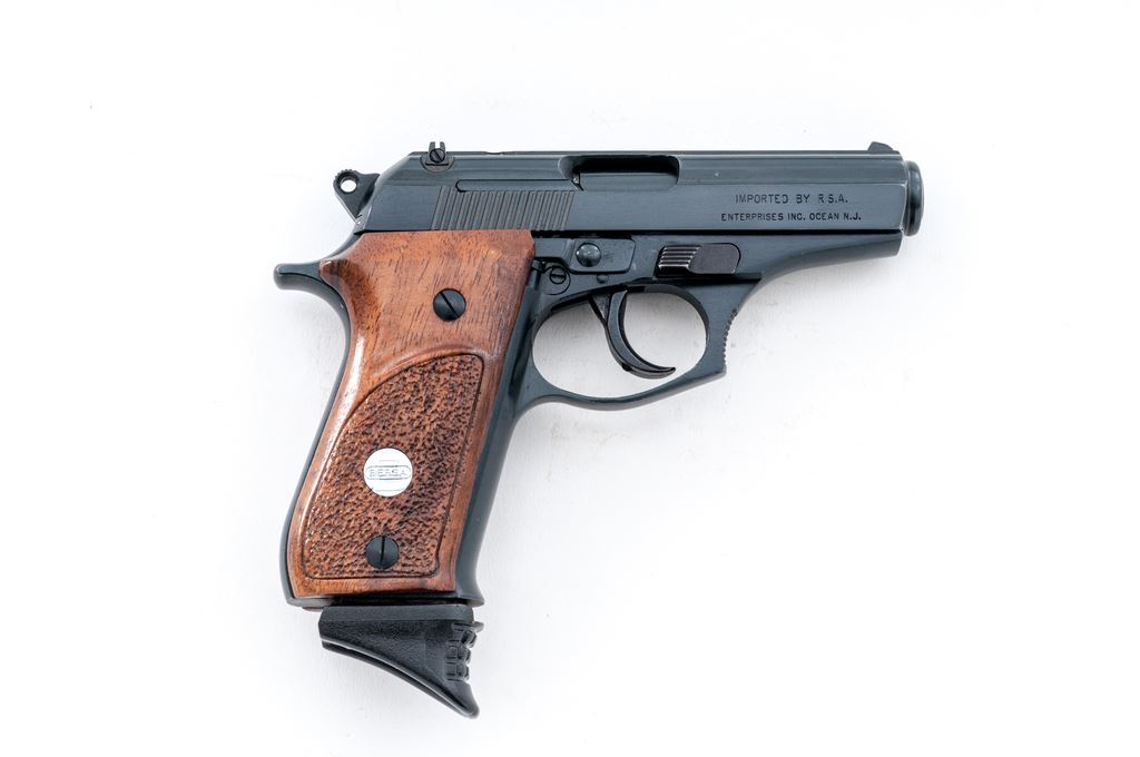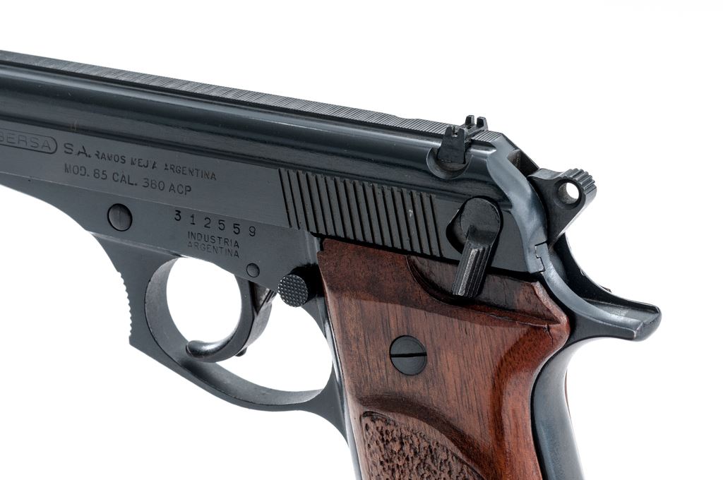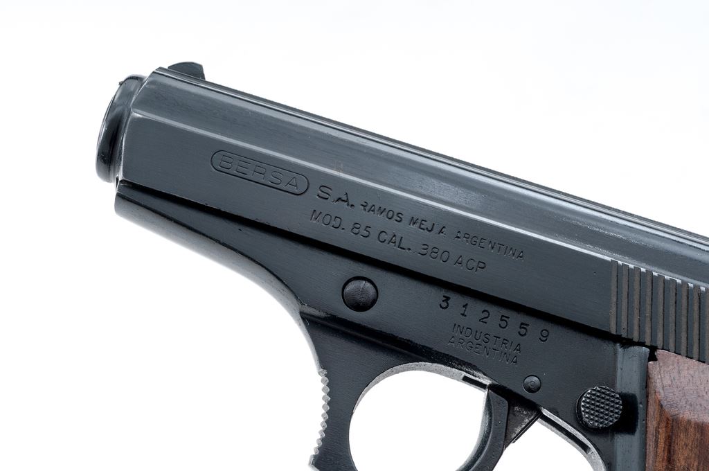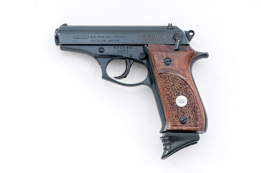 Bersa Model 85 Semi-Automatic Pistol, #312559, .380 ACP cal., 3.5'' barrel, blue finish, partially stippled hardwood grips with silver Bersa medallions, white-dot front sight, rear sight base is present but the blade is missing, with one Bersa magazine; magazine with an added black plastic finger extension. Condition is excellent retaining approx. 98% original blue finish showing only a few slight handling marks to the grips and metal. Smooth action, bright bore with excellent rifling. Est.: $200-$400. (Modern/PPT)