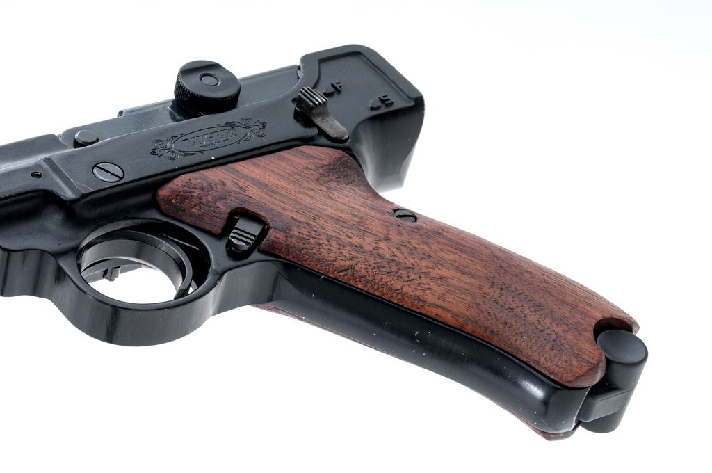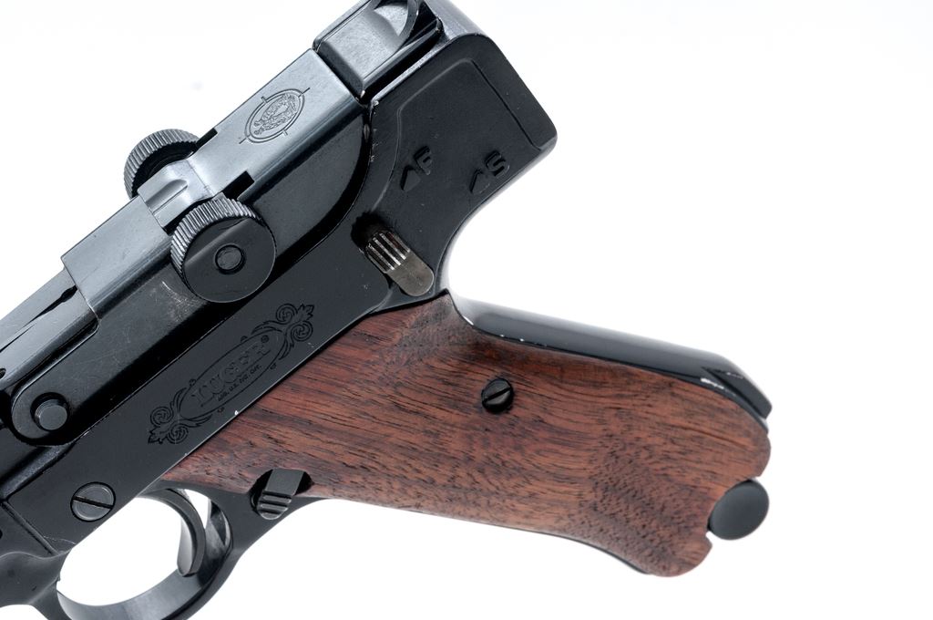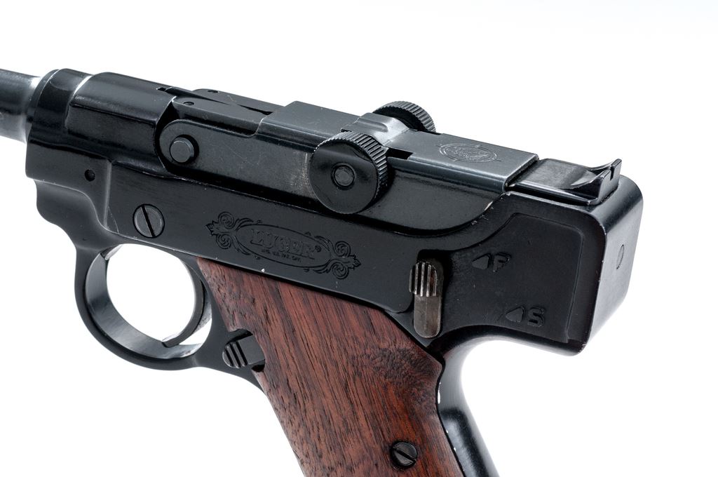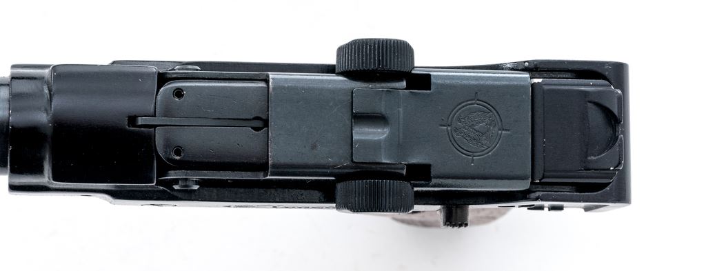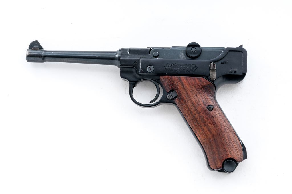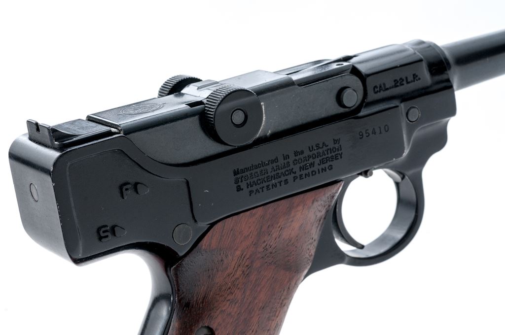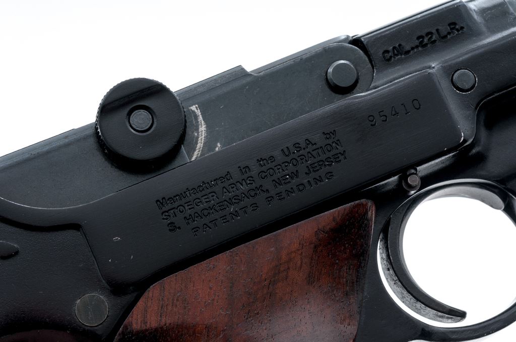 Stoeger Arms Rimfire Luger Semi-Automatic Pistol, #95410, .22 LR cal., 5.5'' barrel, dark blue/black finish, smooth wood grips, blade front sight, and square-notched open rear sight, with one magazine. Condition is very good overall retaining approx. 94% original finish. Barrel and front strap with scattered small nicks and scratches; light wear to muzzle. Grips with a few normal small handling marks. Smooth action, bright bore with excellent rifling. Est.: $200-$350. (Modern/PPT)