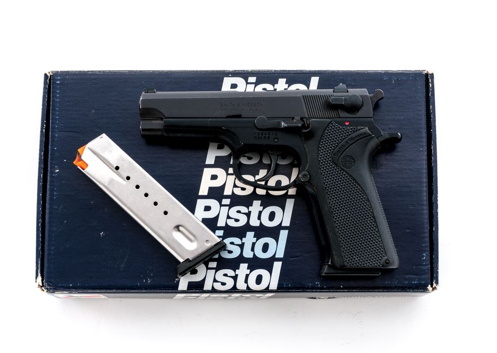 Smith & Wesson Model 915 Semi-Automatic Pistol, #TZS0577, 9mm cal., 4'' barrel, blue finish, aluminum frame, factory checkered black plastic grips, white-dot front sight and square-notched rear sight, with two (2) factory 15-round magazines. In original box with matching end label, owner's manual, and S&W packing paper. Metal rates as very good, retaining approx. 97% factory blue finish, with scattered small handling marks and a few light scratches; right side of slide near the chamber with two small spots of surface rust. Grips are near excellent with a few shallow marks to the back edges, checkering is sharp. Excellent action and shiny bore. Est.: $200-$350. (Modern/PPT)(High-cap mags not available to Calif. residents.)