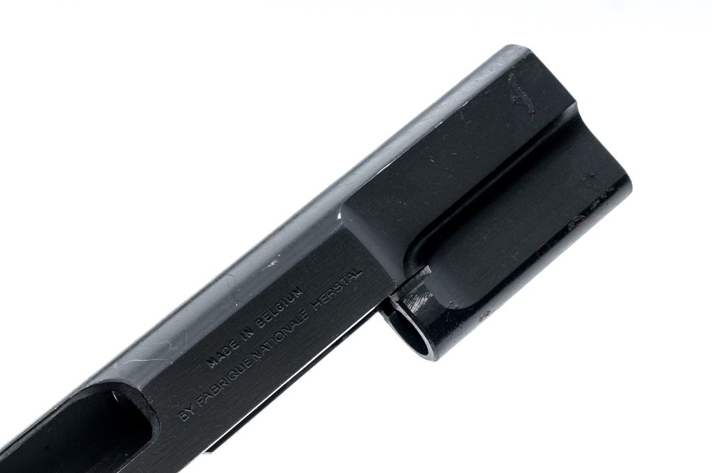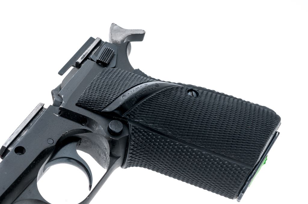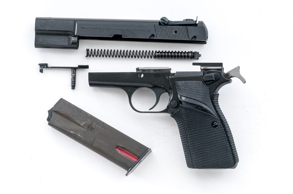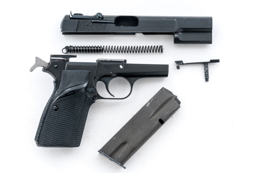 Browning Hi-Power GP Competition, missing barrel and slide extension, #245PM40505, parkerized finish, with checkered black rubber wraparound Pachmayr grips, detent adjustable rear sight, with one 13-round magazine. Pistol appears complete with the exception of the barrel, slide extension, and front sight which would have been mounted to the extension. Metal surfaces retain approx. 97% original finish and are in fine overall condition with scattered surface scuffs and small handling marks; factory lettering is clear. Grips show normal light wear. Made in Belgium by FN. Est.: $500-$800. (Modern/PPT)