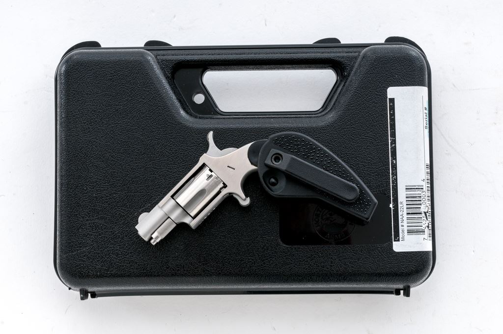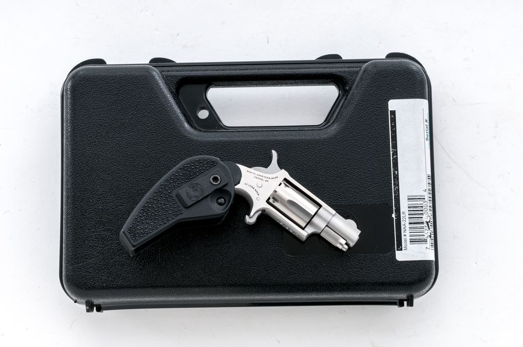 North American Arms NAA-22 Mini Single Action Revolver, #L138191, .22 LR cal., 5-shot, 1-1/8'' barrel, stainless steel, standard fixed sights, NAA folding black holster grip with carry clip. In original black plastic NAA case with the original smooth hardwood grips, lock, owner's manual, and other misc. paperwork. Condition overall is excellent showing only a few small scratches and light index line to the cylinder. Folding grips appears as new; original grips with only a couple of very minor handling marks. Excellent action and bore. Est.: $150-$250. (Modern/PPT)