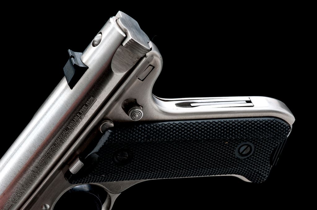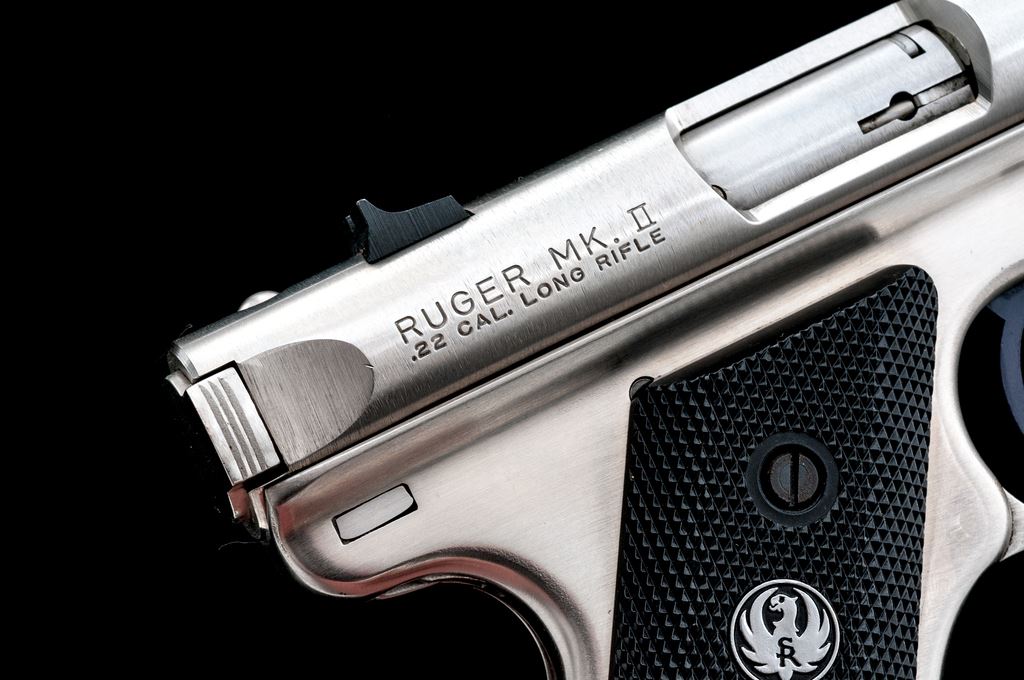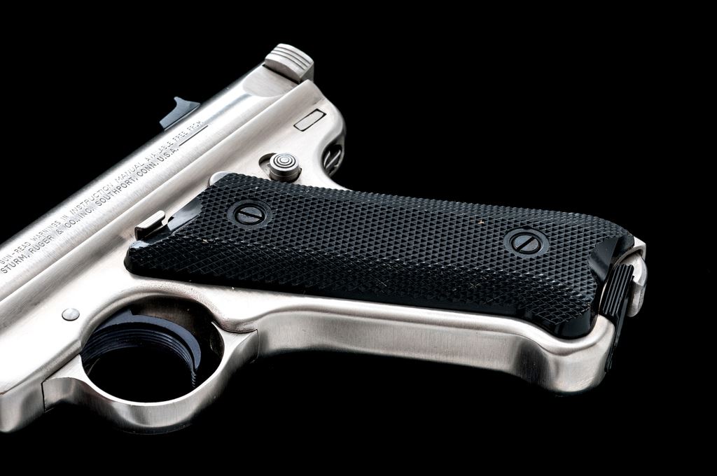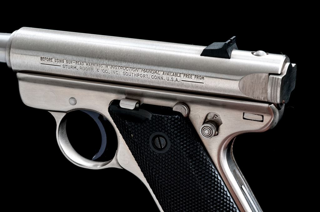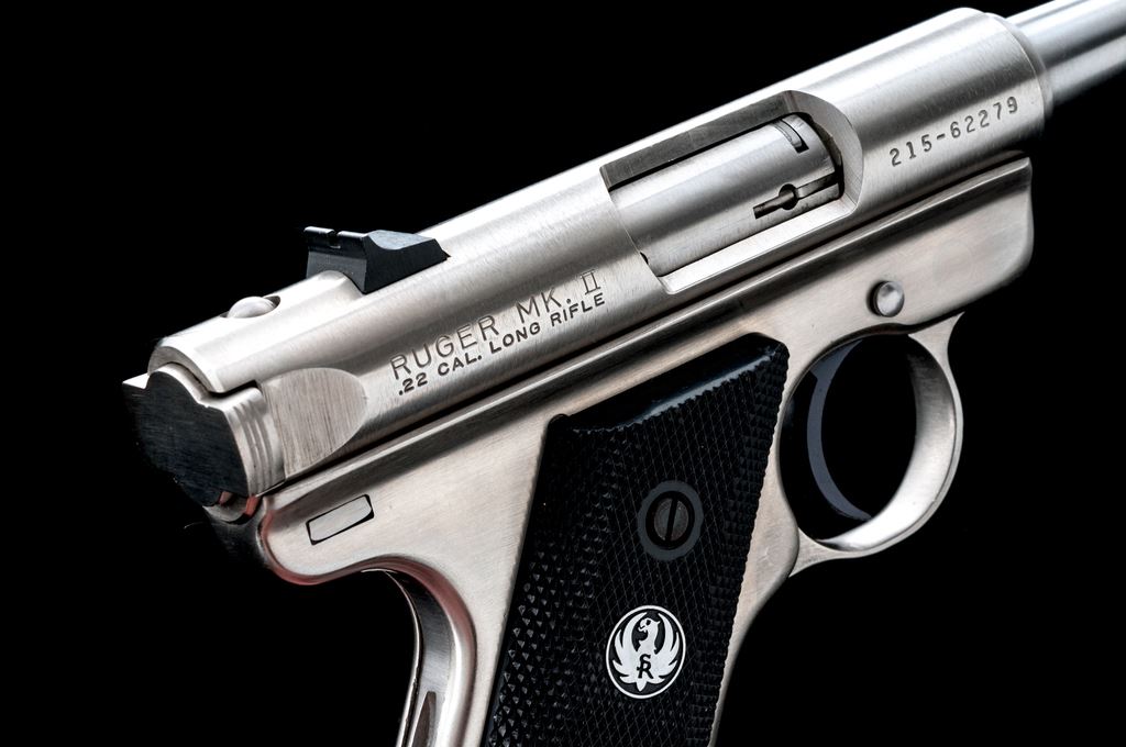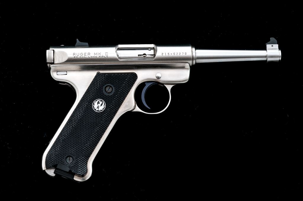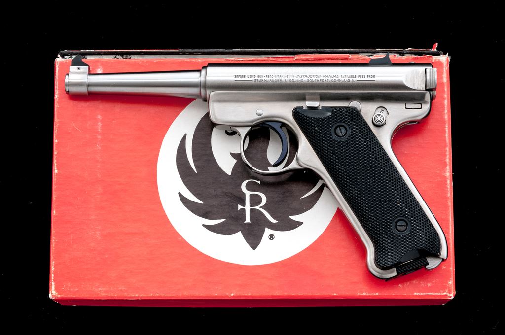 Ruger Mark II Standard Model Semi-Automatic Pistol, #215-62279, .22 LR cal., 4.75'' tapered barrel, stainless steel, factory checkered black plastic grips, pinned blade front sight and square-notched rear sight, with one 10-round magazine; magazine base shows Ruger ''silver eagle'' medallion. In unnumbered hinged one-piece box with owner's manual and misc. factory paperwork. Condition is excellent overall with only a few slight handling marks to the metal and grips. Factory lettering with crisp edges. Smooth action, bright bore with excellent rifling. Overall a very nice lightly used pistol. Top and bottom section of the box are still attached but the outside seam has split, otherwise, showing light storage type wear. Est.: $250-$400. (Modern/PPT)