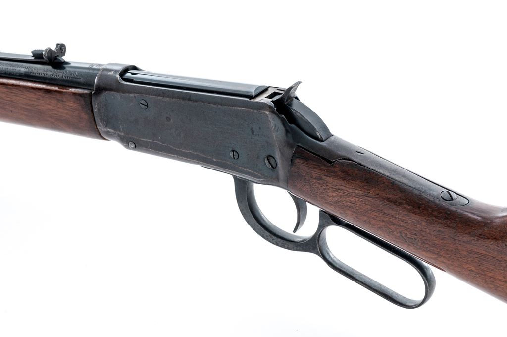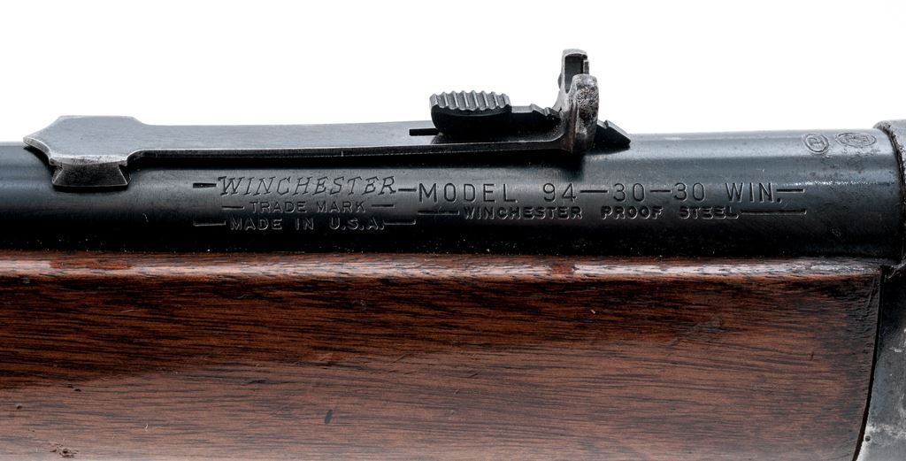 Pre-64 Winchester Model 94 Lever Action Carbine, #1738148, .30-30 cal., 20'' round ''Proof Steel'' barrel, blue finish, straight grip walnut stock and forend, checkered steel shotgun butt. Sights include a hooded silver beaded blade front sight, sporting rear sight with elevator. Top of barrel and receiver are both Winchester proofed; top of barrel with an additional ''(oval)/P''. Mfg'd 1951. Condition overall is good. Barrel and magazine tube retain approx. 80% blue finish; right side with some brown toning and spots of light pitting. Barrel address is clear. Receiver and lever are a combination blue finish and mottled brown patina with general light pitting and reddish brown speckled oxidation. Wood with an added coat of varnish over moderate dings and scratches; finish has flaked at parts of the wrist and along top edge of buttstock. Right upper edge of stock at the wrist with a small repair that has since chipped again at the corner; otherwise, stock and forend are sound; edge of buttplate with a few moderate dents. Smooth crisp action; bore is very good with sharp rifling. Est.: $250-$450. (C&R)