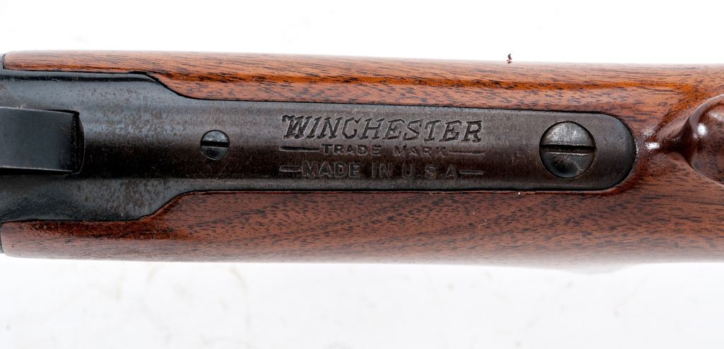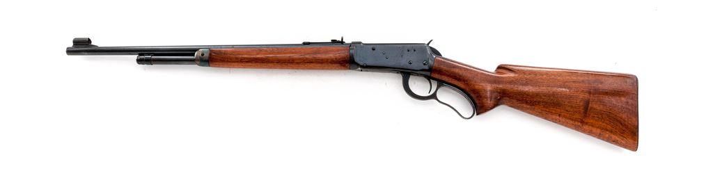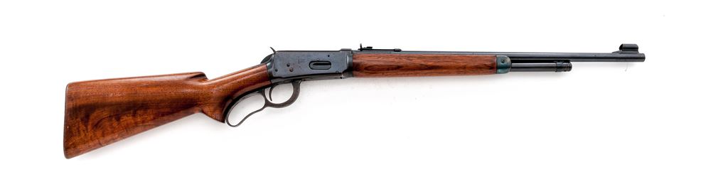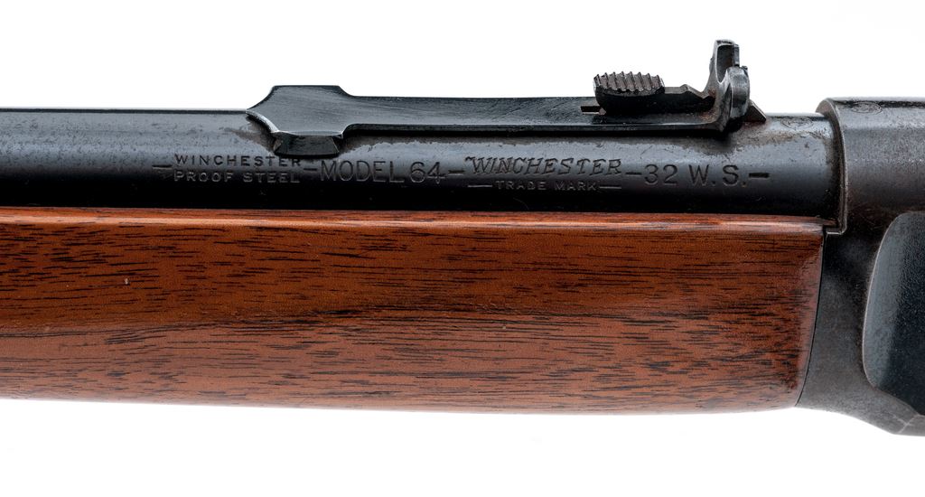 Winchester Model 64 Lever Action Carbine, #1095634, .32 Win. Spec. CF cal., blued 20'' round barrel, with hooded-ramp front and dovetailed buckhorn rear sights, marked with maker's name and address at right breech, and ''Winchester Proof Steel/Model 64/Winchester Trade Mark/32 W.S.'' at left breech; blued tubular 3/4-magazine; blued receiver is marked ''Winchester/Trade Mark/Made in U.S.A.'' on upper tang, and serial number at lower front; case hardened loop operating lever and hammer; varnished walnut stocks, forend with a steel nose cap, pistol-grip buttstock with a checkered steel shotgun type buttplate. Mfg'd 1935. Condition is near excellent. Barrel, mag tube and receiver retain approx. 85% original blue (with scattered discoloration on front and rear sights, at top front, sides and upper tang of receiver); nose cap with fire blue-like coloring; lever and buttplate are a gunmetal gray-brown. Stocks are solid with nice grain and color, fit ''proud,'' and retain most of their original gloss varnish. Action is smooth; bore is bright with sharp rifling. Est.: $1,000-$1,500. (C&R)