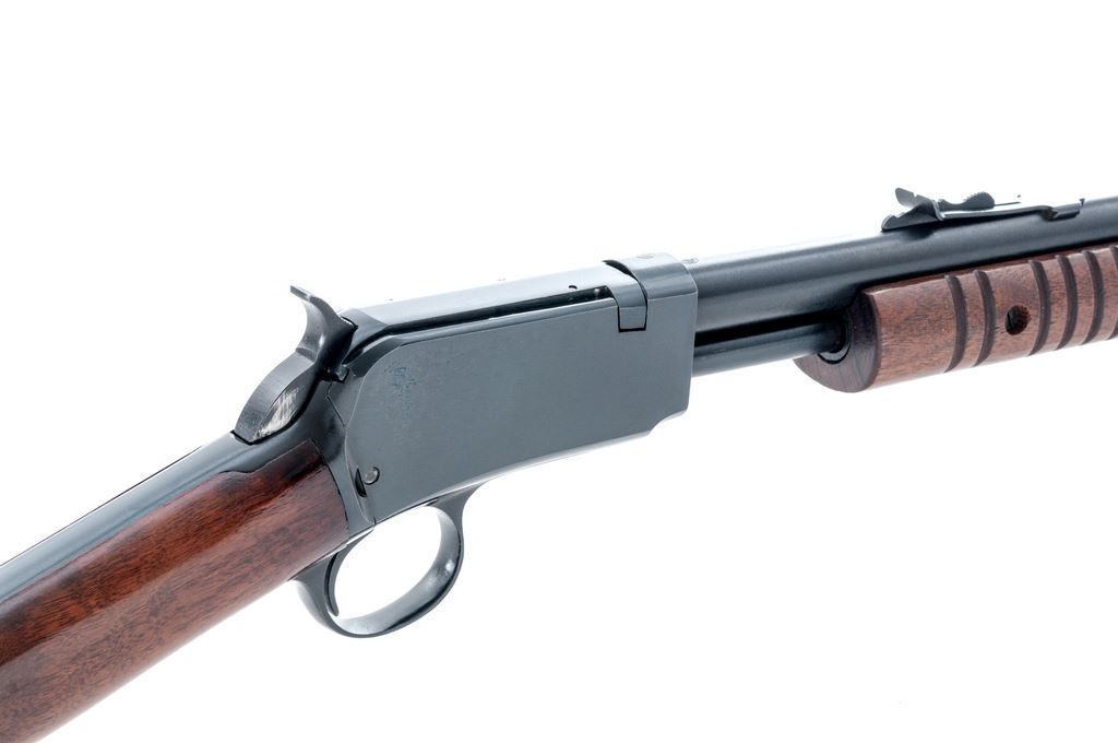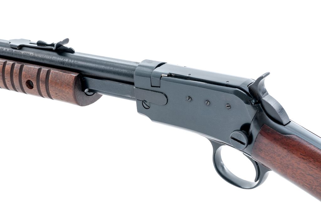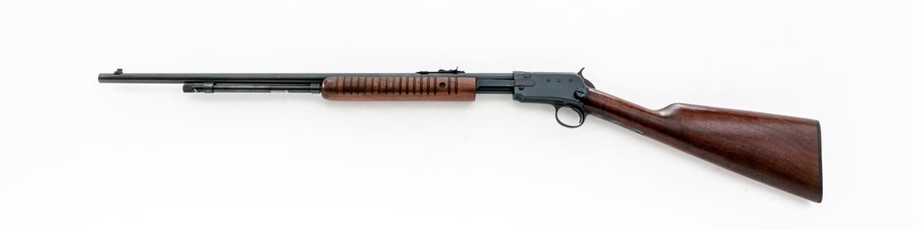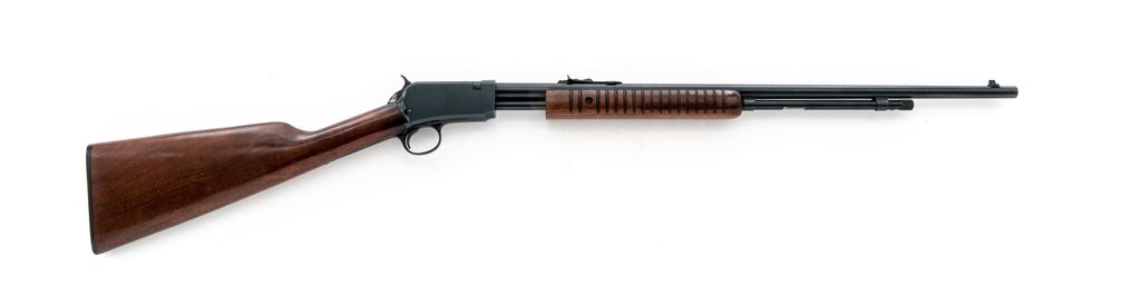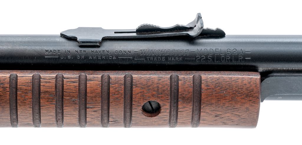 Winchester Model 62A Pump Action Rifle, #407566, .22 S-L-LR cal., 23'' barrel, blue finish, dovetailed silver bead blade front sight and standard notched rear sight with elevator; straight grip walnut stock, 17-groove flat bottom forend, checkered black composition Winchester buttplate. Left side of frame with three (3) drilled and tapped holes that are filled with the appropriate screws. Mfg'd 1958. Condition is fine retaining approx. 96% blue with high edgewear to the upper edges of frame. Barrel address is crisp and other factory lettering is clear. Wood with light marks from field use, mainly on the underside of the forend and buttstock; stock with an added coat of clear finish and is a little darker in color; forend with the original oil finish. Good action, bright bore with nice rifling. Est.: $350-$550. (C&R)