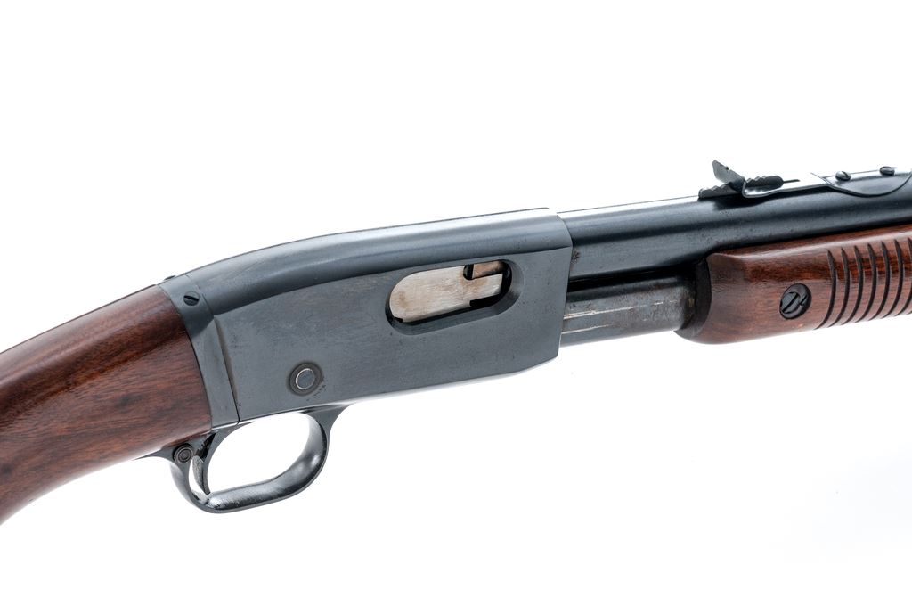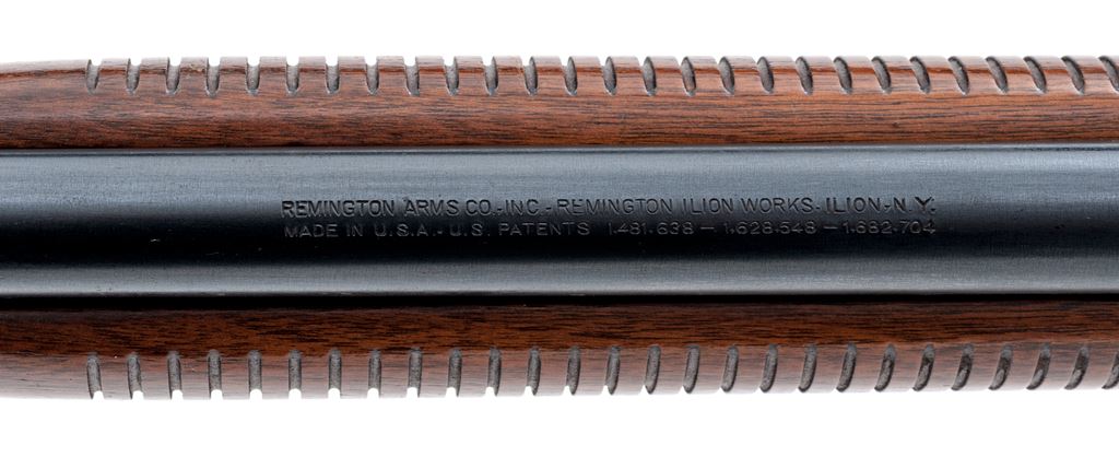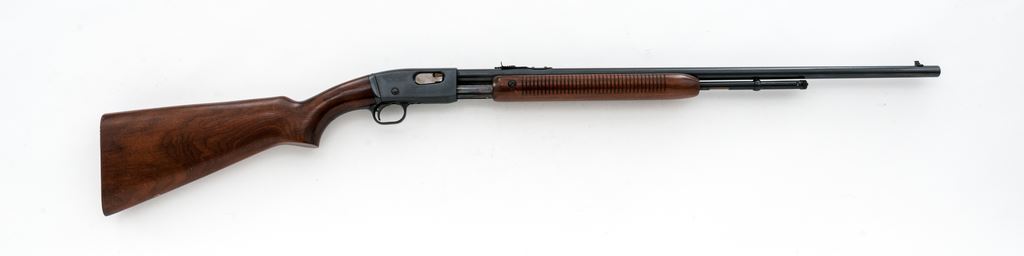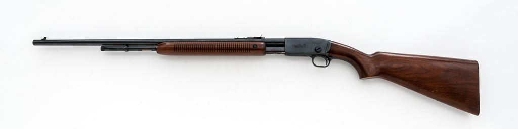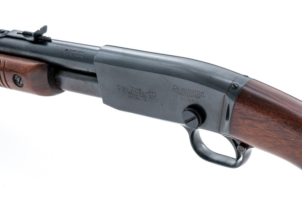 Remington Model 121 Fieldmaster Pump Action Rifle, #60643, .22 S-L-LR cal., 24.75'' round barrel, blue finish, pistol-grip walnut stock and grooved forend, checkered metal Remington buttplate, dovetailed silver bead front sight and notched elevator rear sight. Remington barrel date code is ''KL'', mfg'd 1942. Metal rates as fine and retains approx. 97% factory blue on barrel and receiver; both with scattered pinprick oxidation and very fine pits or peppering to the metal. All of the factory lettering is crisp. Magazine tube shows normal mechanical wear. Wood is very good retaining most of the original finish with small and shallow surface dings, mainly along the top and bottom edge of the buttstock. Excellent action and bore, rifling is sharp. Est.: $300-$500. (C&R)