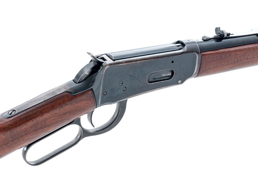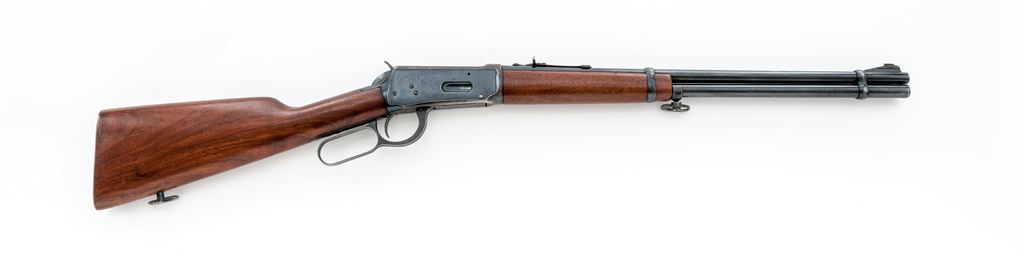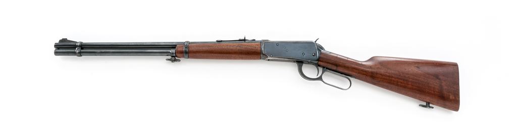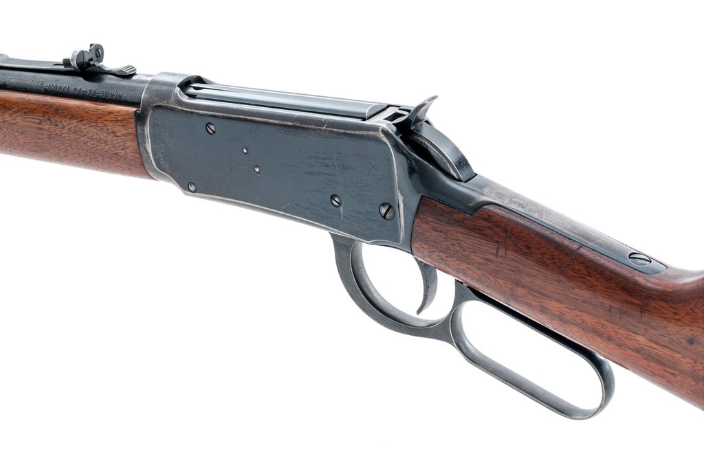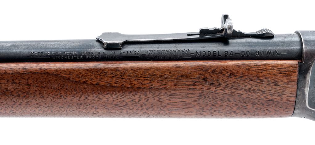 Pre-64 Winchester Model 94 Lever Action Carbine, #1904795, .30-30 cal., 20'' round ''Proof Steel'' barrel, blue finish; straight grip walnut stock, checkered steel shotgun butt, with sling swivel installed in the buttstock as well as to a magazine tube clamp. Sights include a silver beaded blade front sight and sporting rear sight with elevator. Top of barrel and receiver are both Winchester proofed. Mfg'd 1952. Condition overall is very good. Approx. 70% factory blue finish remains with thinning to the highpoints of receiver; upper tang is worn to mostly bare metal; receiver with some reddish brown freckling. Barrel address is crisp, Winchester proofmarks and other factory lettering is clear. Wood is sound showing age and wear consistent with the rest of the rifle, including shallow impressions and other marks from handling and use; no chips or cracks. Smooth crisp lever; bore is bright with strong rifling. Est.: $350-$550. (C&R)