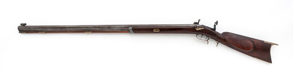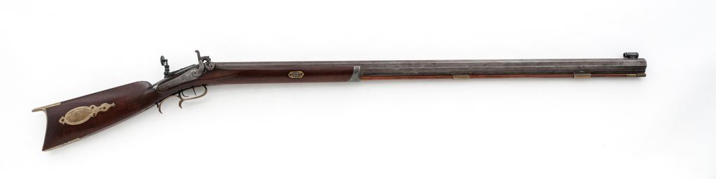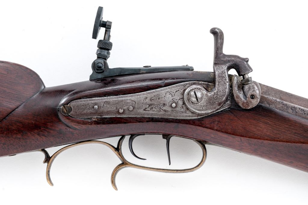 Antique Heavy Barrel Target or Market Hunter's Plains-Style Percussion Rifle, NVSN, .44 cal., 41'' heavyweight octagonal barrel with dovetailed hooded peep-style front, plugged dovetail rear, and Lyman adjustable peep tang sights; serpentine sideplate with an engraved marshland scene of a pointer dog and waterbirds marked ''Joseph Golcher'' within a curved ribbon, floral engraved hammer; brass furniture including scrolled sideplate, triggerguard having two finger rests, crescent buttplate with long top and bottom tangs, and two barrel key escutcheons; a nicely-shaped German silver patchbox with hinged door opening to trap in buttstock containing an extra ramrod tip; pewter nosecap; double set triggers; varnished walnut halfstock having a nicely carved cheek rest, aprons on either side of lock, and wrist; brass-tipped hickory ramrod retained by two brass ferrules. Condition is very good, the steel surfaces being a smooth gunmetal gray color, the brass and German silver with a light patina. Stock is smooth and solid showing only minor age/use marks and lovely grain and color. Tang sight and percussion nipple are replacements; trigger floorplate is missing. Action is smooth and strong; bore is shiny with deep rifling. Joseph Golcher of Philadelphia made flintlock and percussion gun locks circa 1825-1860, which were used by many prominent gunmakers of the era. Est.: $800-$1,200. (Antique)