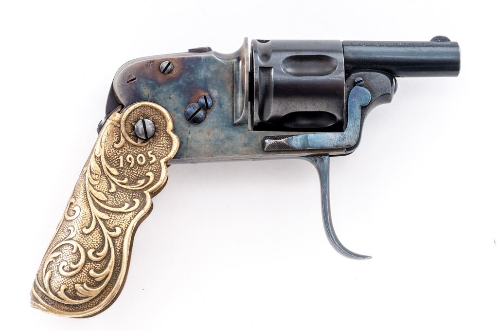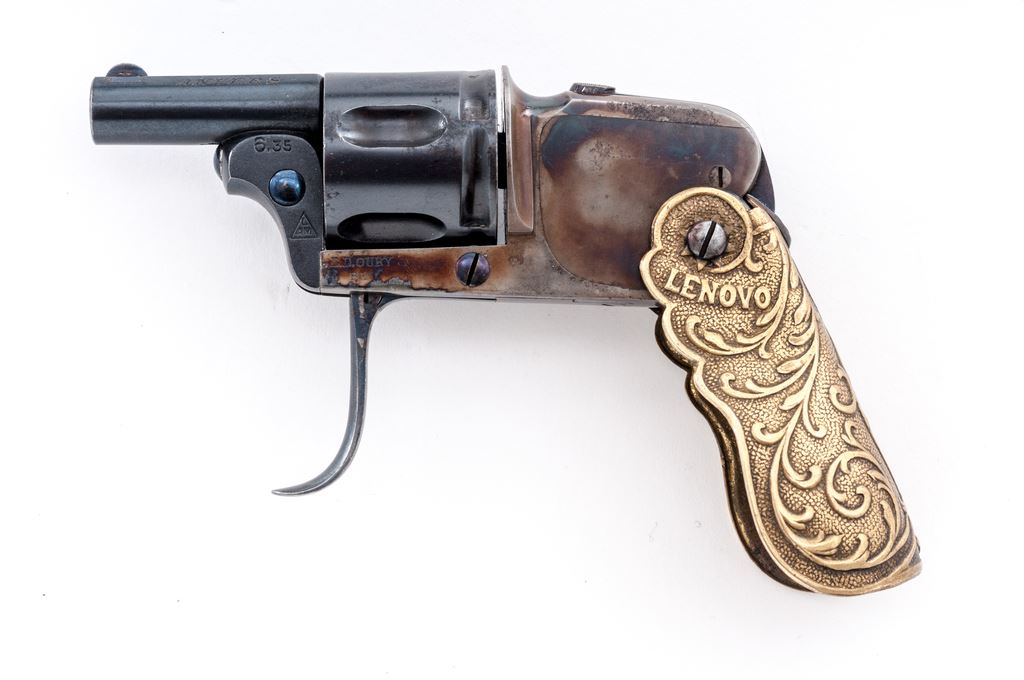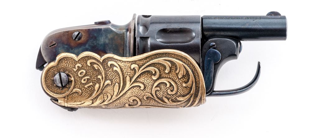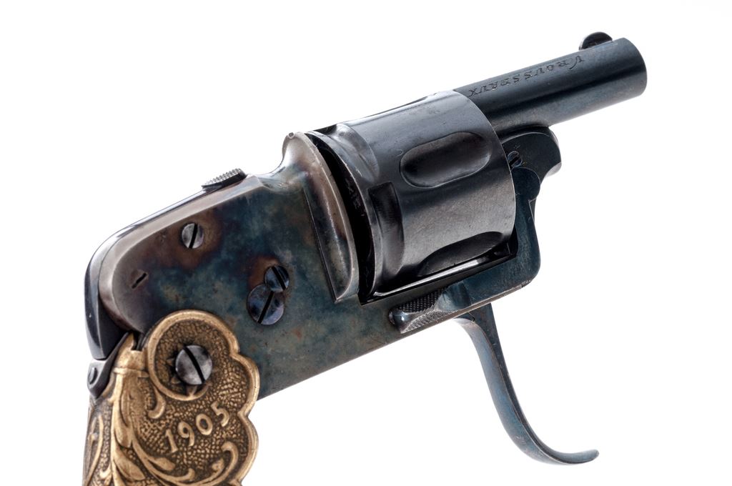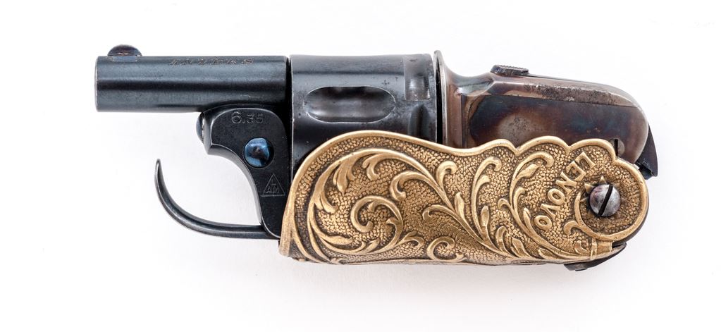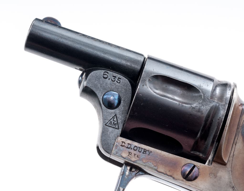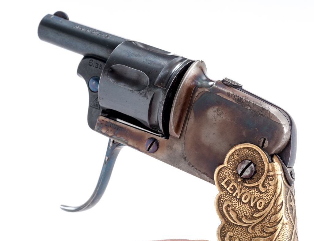 ''Velo Dog'' Style Double Action Pocket Revolver, with folding grips and trigger, by V. Rousseaux, Anvers (Antwerp) Belgium, NVSN, 6.35mm cal., blued 1-3/16'' barrel, with tiny dovetailed blade front (and recoil shield notch rear) sight marked ''V. Rousseaux'' and ''Anvers'' on either side; blued 5-shot fluted round cylinder with long rear lead-in grooves; case hardened frame with top grip release button and right-side barrel release lever marked ''6.35'', ''LAM'' within a triangular proofmark, and ''D.D. Oury/Bte'' (Brevete, or Patent) on left side; folding brass grips with stamped vine pattern in relief, with ''Lenovo'' and ''1905'' on left and right sides, respectively. Condition is mint, as new, the barrel and cylinder retaining all of their original deep blue; the trigger, screws and release levers with bright fire blue; the frame showing lovely mottled case hardening. Grips with a soft age patina. Action is smooth (but cylinder does not lock up), bore is brilliant with sharp rifling. A French creation, Velo (short for ''velocipede,'' or bicycle) Dog revolvers were created to protect cyclists from dog attacks when the sport was all the rage in turn-of-the-century Europe. Est.: $400-$600. (C&R/PPT)