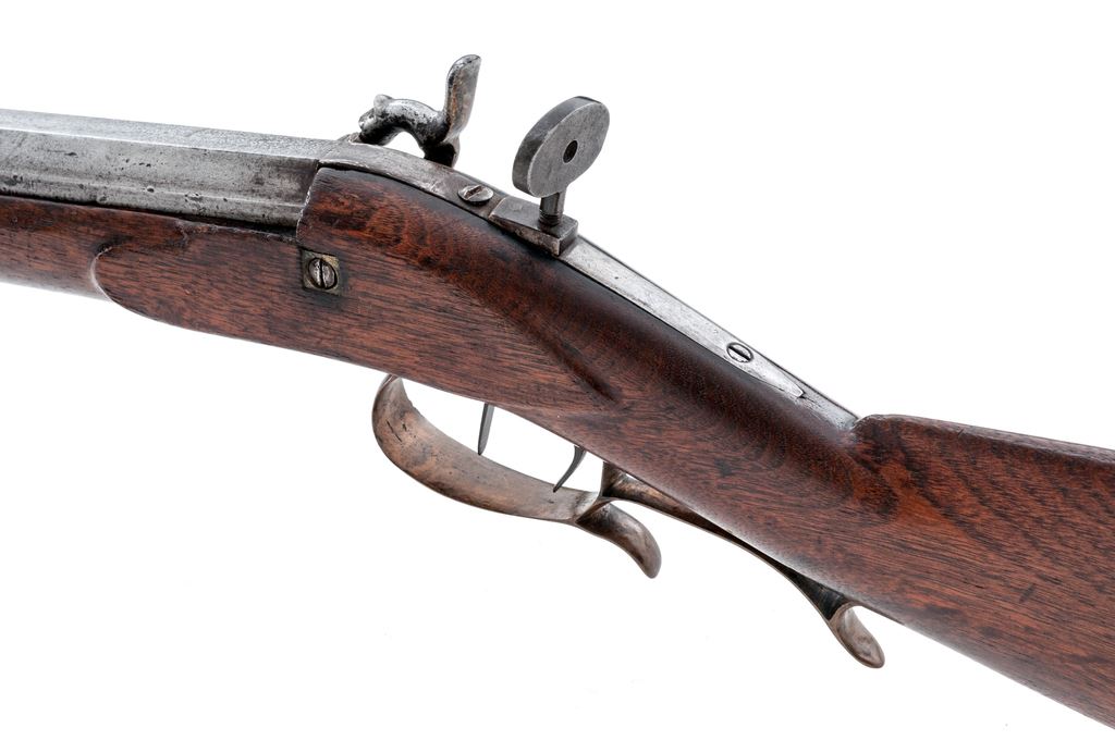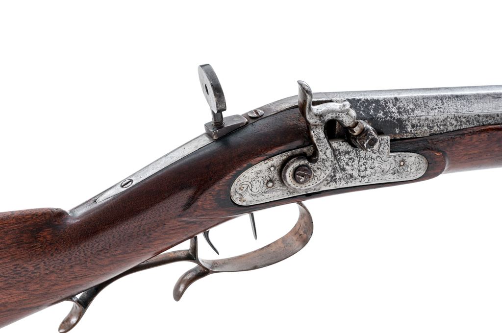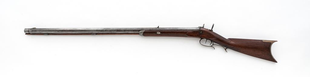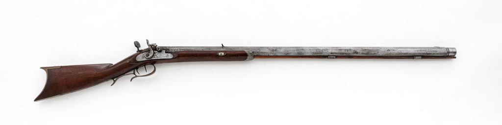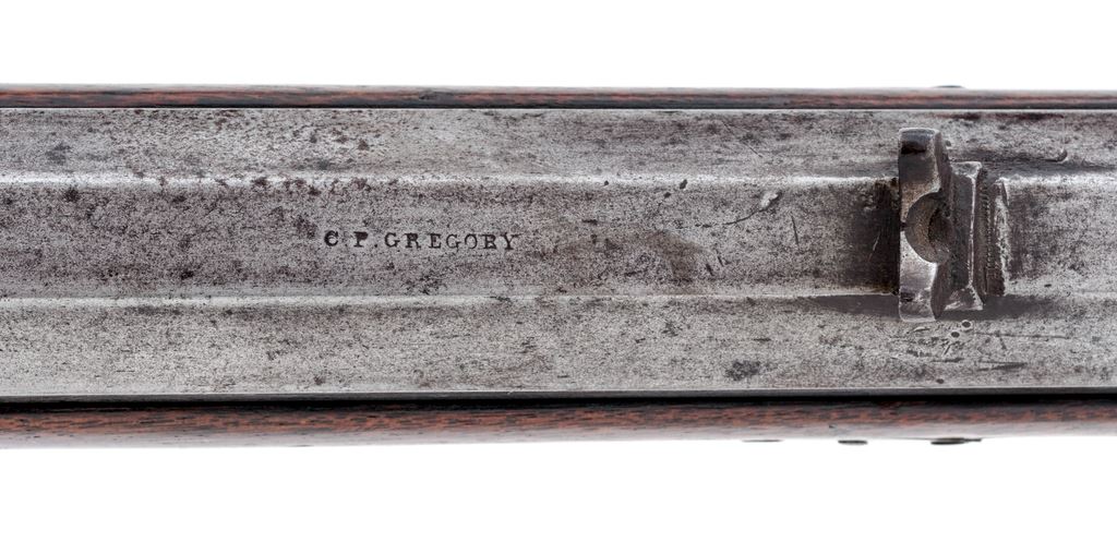 American Heavy Barrel Halfstock Percussion Sporting or Target Rifle, NVSN, .36 cal., 35.25'' octagonal barrel turned round for 1-1/8'' at muzzle for bullet starter, German silver blade front and dovetailed buckhorn rear sights, marked ''C.P. Gregory'' behind the rear sight and mounted with an unusual large oval adjustable peep tang sight; flush iron lockplate and hammer are lightly floral engraved; double set triggers; brass furniture including a scrolled finger-rest triggerguard and crescent buttplate with separate lower tang; varnished walnut ''perch belly'' halfstock with raised carved aprons on either side of lock, a single barrel pin and two German silver oval escutcheons, pewter forend cap, plain hickory ramrod retained by two iron ferrules. Mfg'd. ca. 1840s-60s. Condition is very good, the steel parts being a generally smooth gunmetal gray with black powder pitting at breech and scattered aging, the percussion nipple a modern replacement, the brass having mild toning. Stock with a 2.25'' chip out at right breech area but otherwise smooth and solid retaining much original finish. Action functions as designed; bore is shiny with deep rifling. Est.: $500-$900. (Antique)