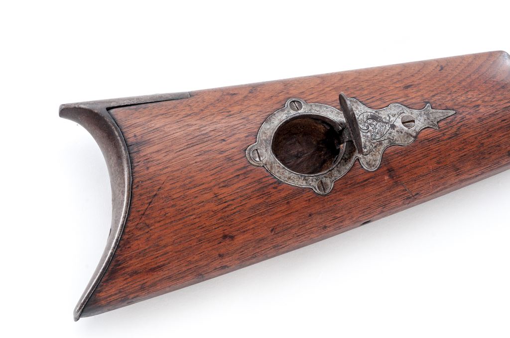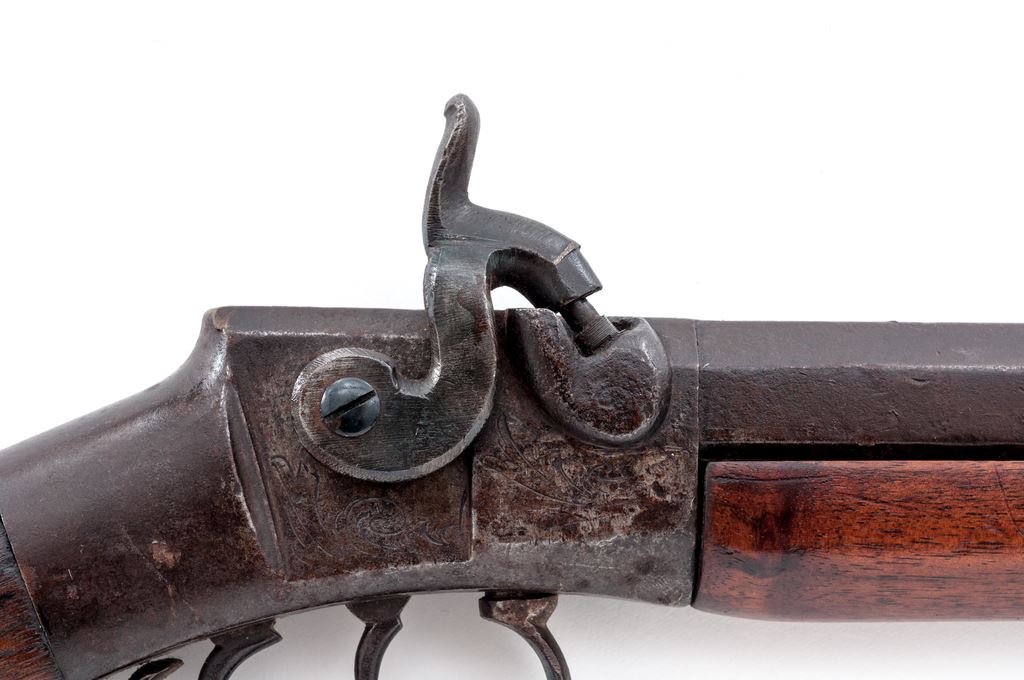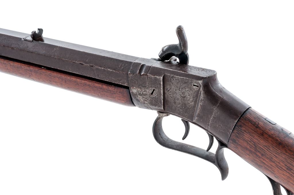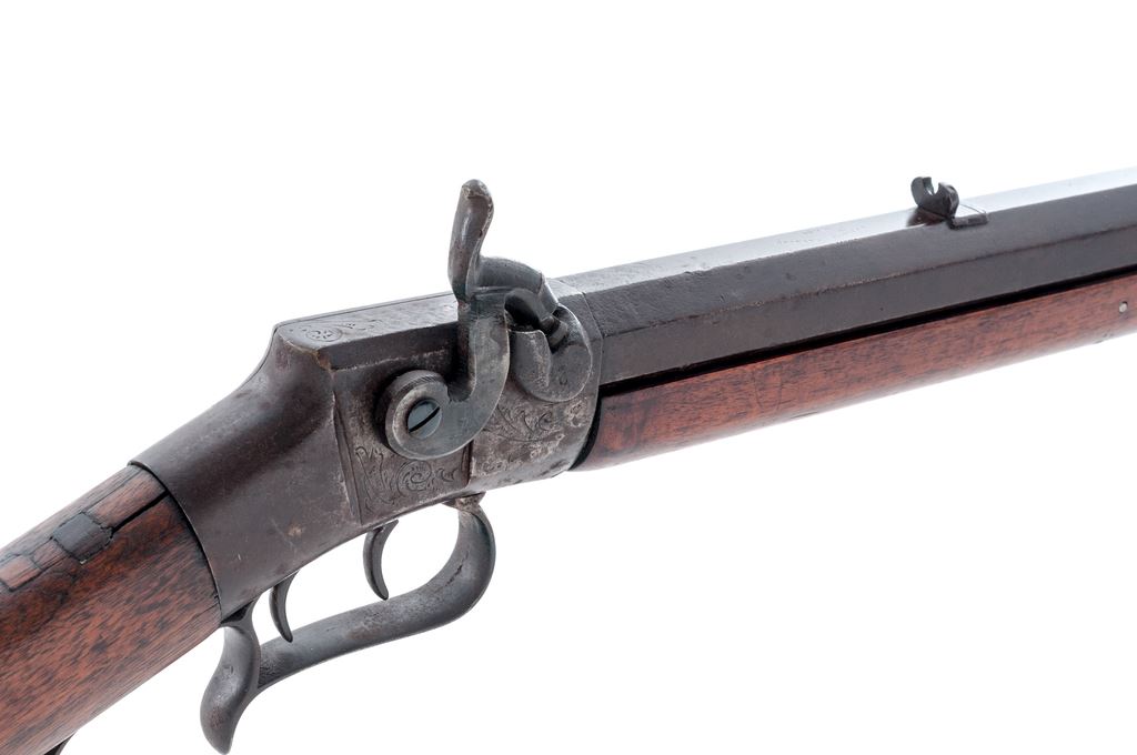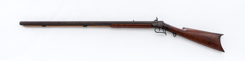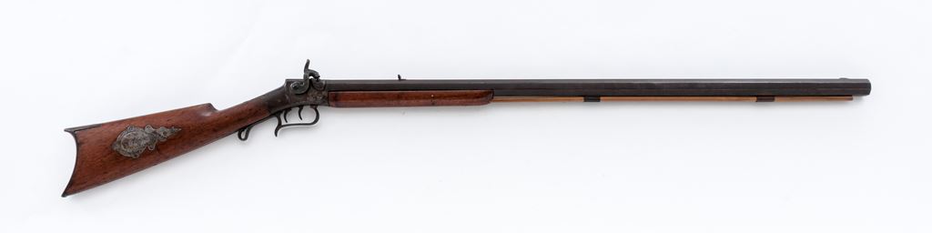 Antique Heavy Barrel Percussion Muzzleloading Sporting Rifle, NVSN, .44 cal., 33.5'' heavy octagonal barrel with low German silver blade front and dovetailed buckhorn rear sights marked ''G.F. Foster/Taunton/Mass.'' on top flat ahead of breech; unusual ''saw handle'' profile to steel receiver, which has loose floral engraving at sides and top; scrolled triggerguard with rear finger rest; double set triggers; oil-stained walnut forend, and buttstock with iron crescent buttplate and floral engraved fancy patchbox with hinged lid opening to trap for patches and small spare parts; plain hardwood ramrod retained by two iron under-barrel thimbles. Condition is good to very good, the barrel with a dark brown patina and the other iron parts a gunmetal gray with scattered light aging and discoloration. Buttstock is smooth with light wear and marks from use, fits short of the buttplate at the bottom, and has a 1'' crack and wood repairs at the wrist; hammer, forend and ramrod are modern replacements. Action functions; bore appears clean with deep rifling. Est.: $450-$750. (Antique)