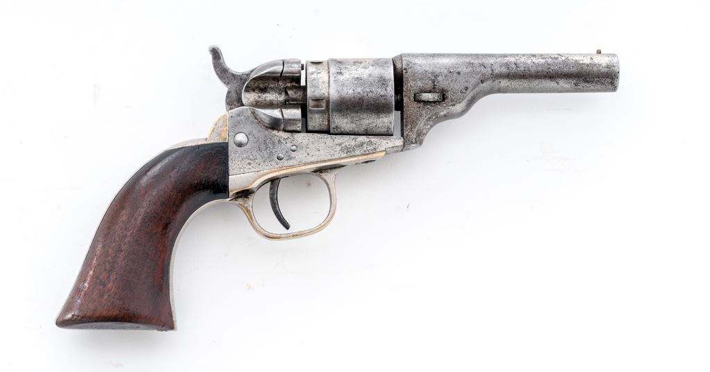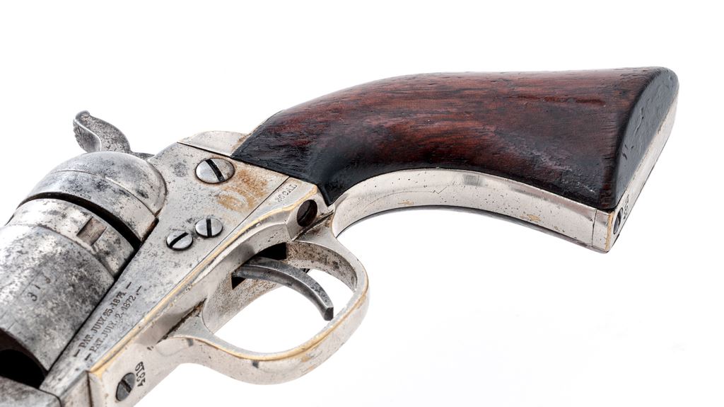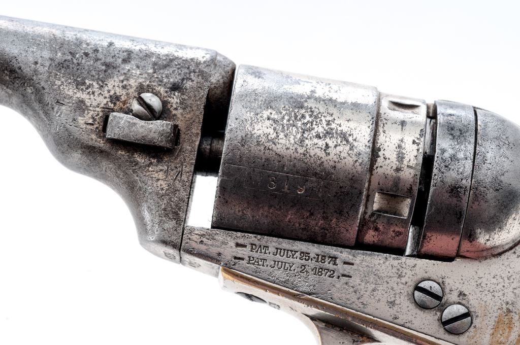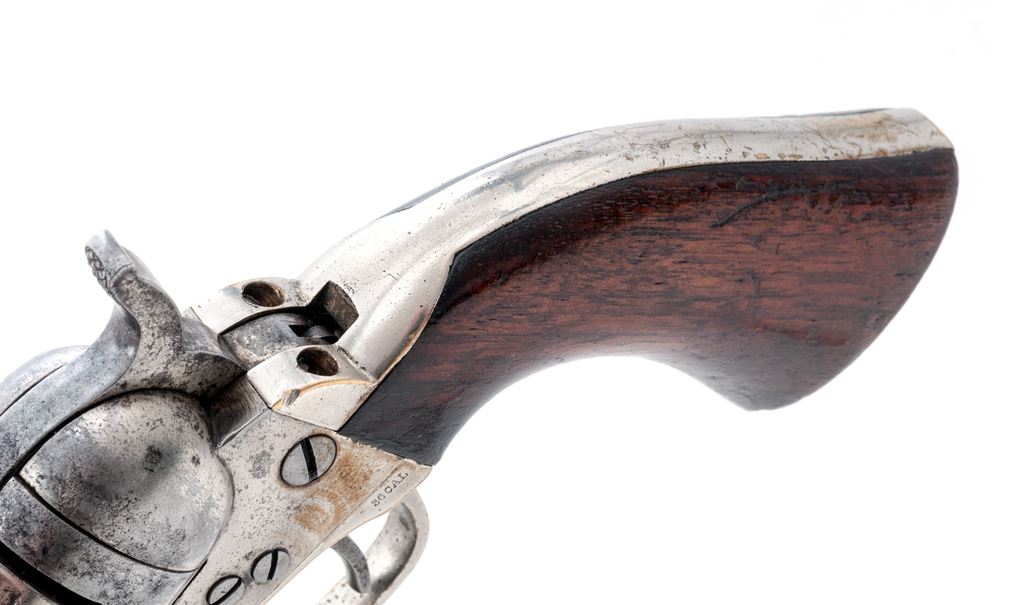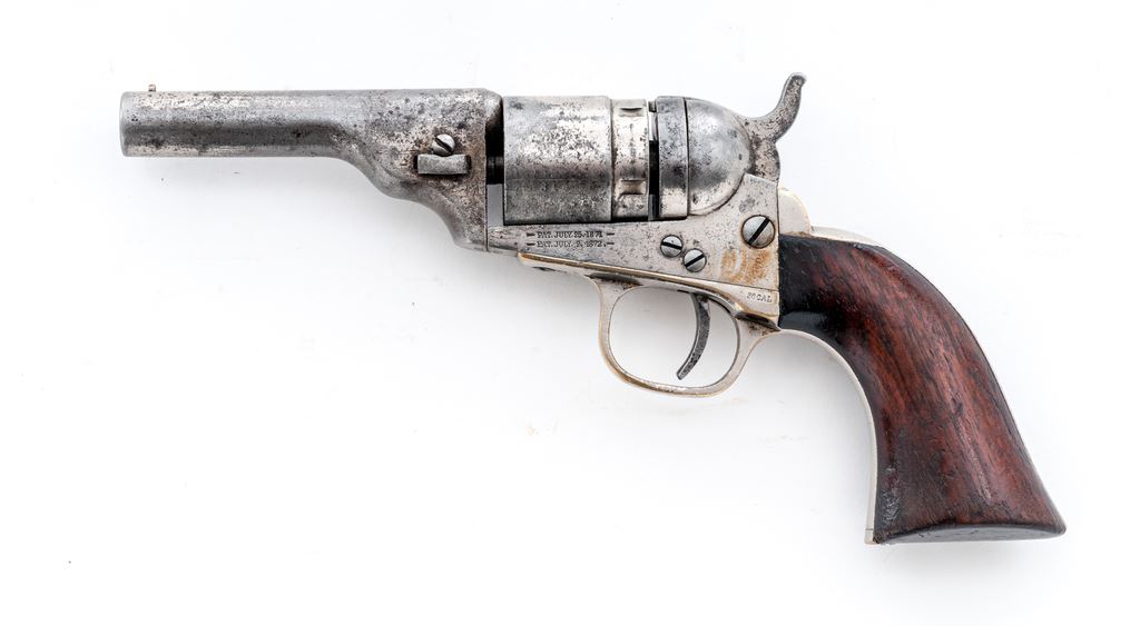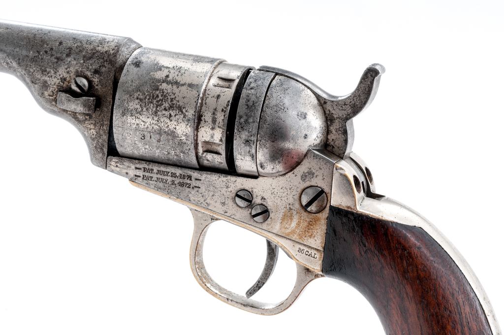 Antique Colt Metallic Cartridge Pocket Revolver, #4319, .38 RF cal., 3.5'' barrel, with brass post front (and hammer-notch rear) sights marked with the Colt name and address in two lines; 5-shot rebated round cylinder with the ''stagecoach hold-up'' rolled scene; frame with attached conversion ring is marked with the two-line 1871-72 patent dates; brass gripstraps marked ''36 Cal'' on left rear triggerguard bolster; varnished one-piece walnut grips. Mfg'd ca. 1873-80, originally with full nickel-plated finish. Condition is very good. Barrel, cylinder and frame retain approx. 15% original nickel (difficult to discern as colors match closely), cylinder with 45% light scene, gripstraps with 85% nickel. Grips are sound showing light wear and 25% original varnish. Visible serial numbers match; action is extremely tight; bore is clean showing general black powder erosion and distinct rifling. As evidenced by its unique barrel contour and serial number, this gun was Colt factory produced as a cartridge gun, and not converted from surplus percussion parts (with the exception of the ''36 Cal''-marked gripstraps). Est.: $500-$750. (Antique)