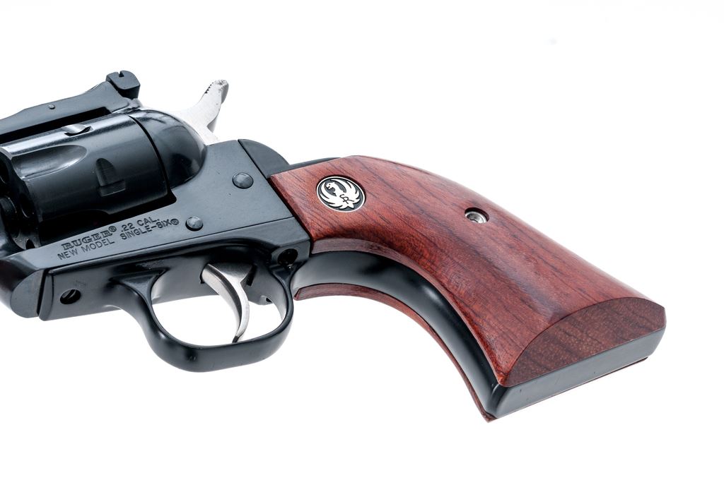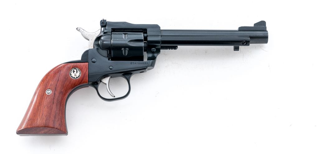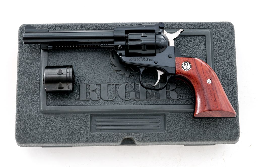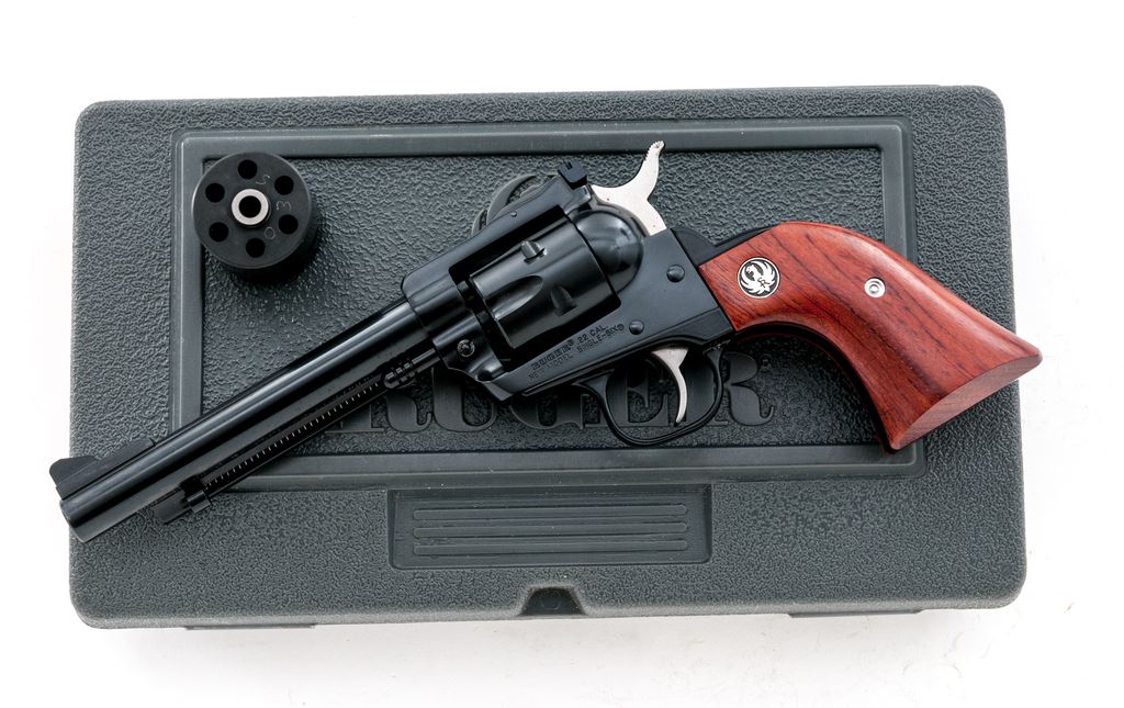 Ruger New Model Single-Six Convertible Single Action Revolver, #264-89035, with both .22 LR and .22 Win. mag. cylinders, 5.5'' barrel, blue finish, smooth rosewood grips with Ruger ''black eagle'' medallions, and standard fixed sights. In the original gray plastic Ruger case with matching end label, gun lock, owner's manual, and misc. paperwork. Condition is excellent appearing unfired, approx. 98% original finish remains. Although this revolver appears unfired, parts of the barrel, cylinder, and hammer do have intermittent tiny specks of oxidation, most likely from prolonged storage. .22 Magnum cylinder appears unturned; .22 LR cylinder with a faint line between a few of the notches. Grips and bore are also excellent. Est.: $300-$450. (Modern)