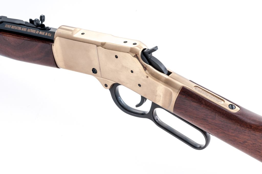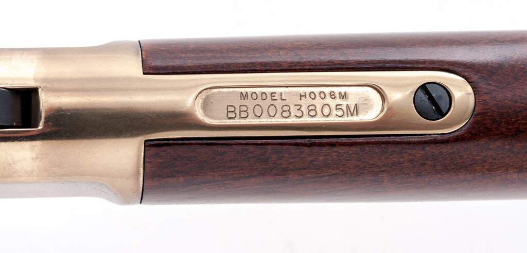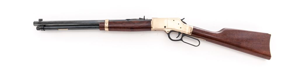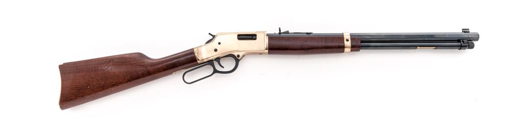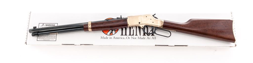 Henry ''Big Boy'' Model H006M Lever Action Rifle, #BB0083805M, .357 mag/.38 Spec. cal., 20'' octagonal barrel, dark blue finish, brass receiver, buttplate, and barrel band; straight grip walnut stock and forend, dovetailed front sight with brass bead and semi-buckhorn rear sight. Included is the original box with matching end label. Rifle is in excellent condition and retains approx. 99%+ blue finish. Brass surfaces with a few minor handling marks. Wood is also excellent with only a few light scratches near toe of buttstock. Crisp action, bright bore with excellent rifling. Est.: $500-$700. (Modern)