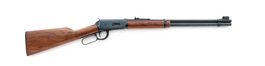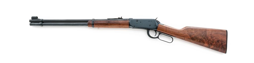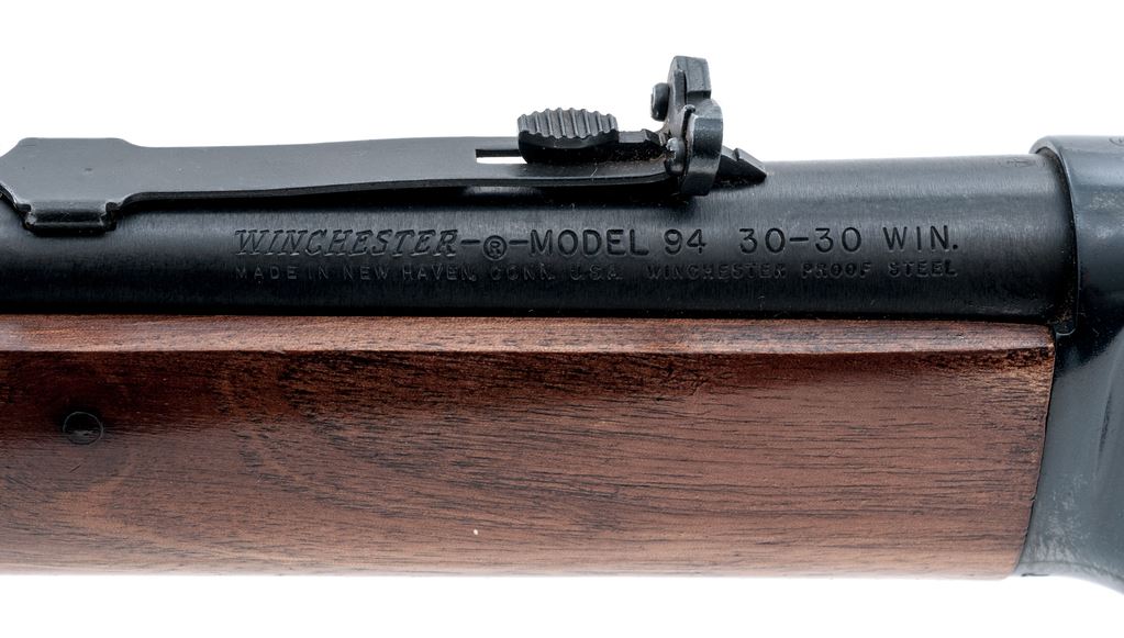 Winchester Model 94 Lever Action Carbine, #4397357, .30-30 cal., 20'' round ''Proof Steel'' barrel, blue finish; straight grip walnut stock, checkered black composition Winchester buttplate. Sights include a hooded silver beaded blade front, sporting rear sight with elevator. Top of barrel and receiver are both Winchester proofed. Mfg'd 1976. Rifle is in very good overall condition as partially refinished. Barrel and magazine tube retain approx. 95% original blue; right side of magazine tube with an approx. 3'' very thin scratch; barrel address is crisp. Receiver retains approx. 98% reblued finish with scattered faint scratches to the right side, as well as a little reddish brown freckling to the upper tang. Forend is original with moderate handling marks. Buttstock has been lightly sanded and refinished with scattered very light handling marks, right inside edge at the upper tang with a small sliver missing and a small gap at the adjoining surfaces; left rear section is nicely figured. Excellent crisp action and bore. Est.: $300-$500. (Modern)